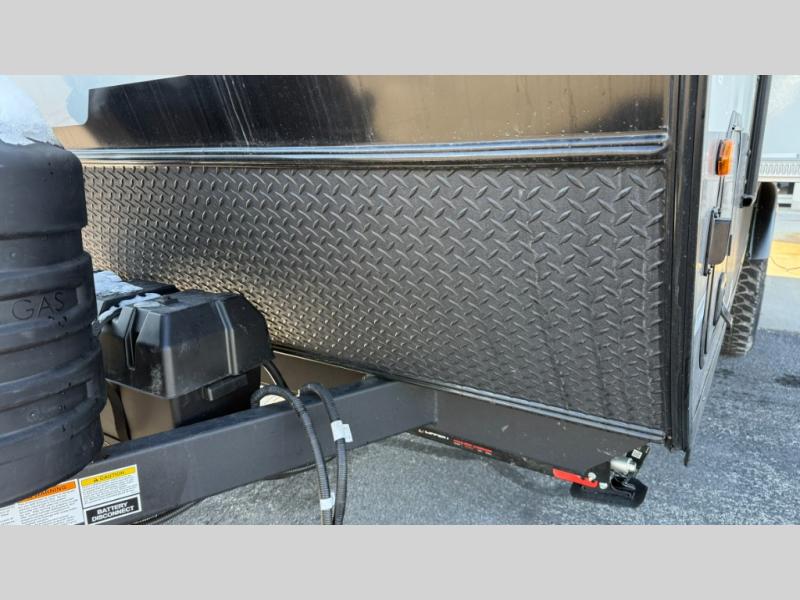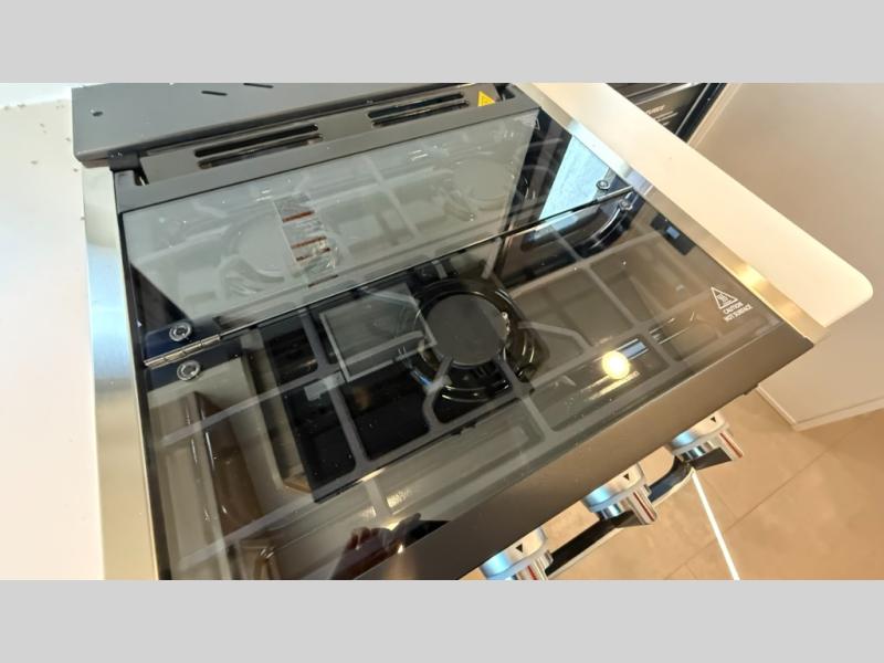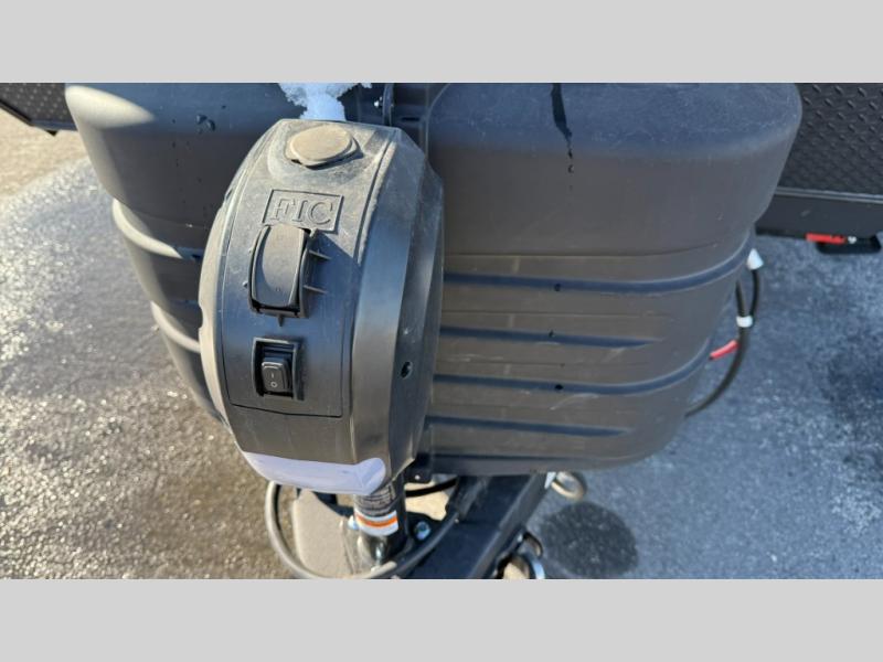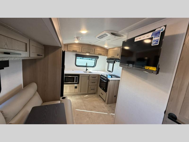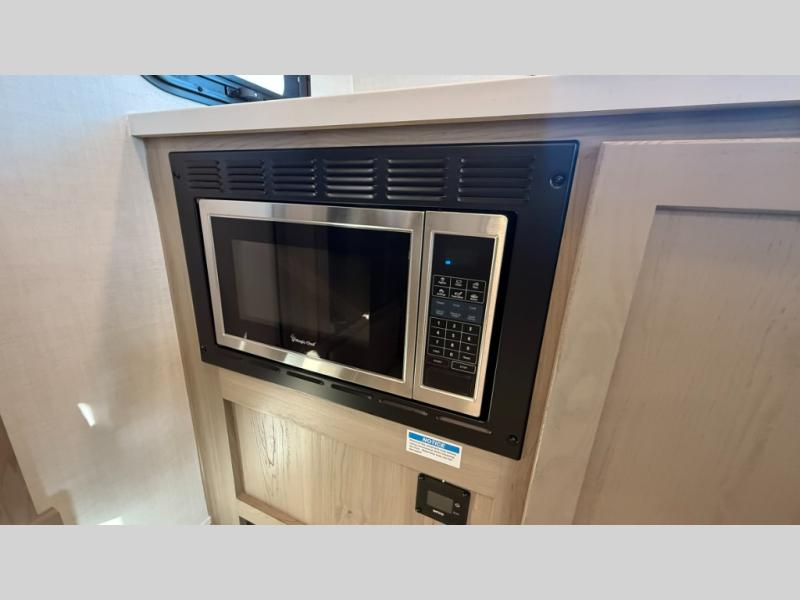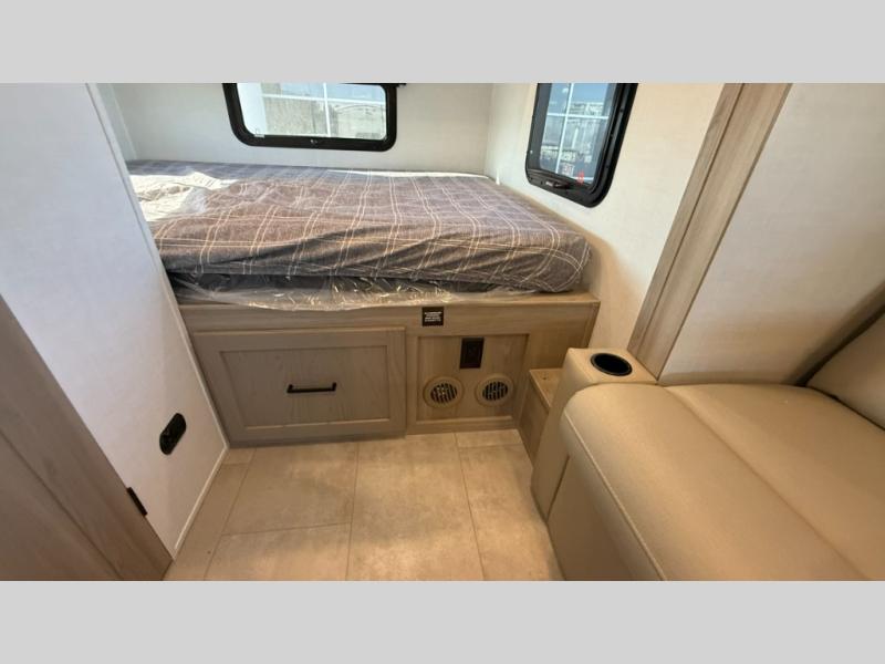 Are you looking for a lightweight trailer with at-home comforts? Take a look at this single slide out unit that can sleep three to four each night. There is a queen-size bed in the back with a 26" x 80" flip-up bunk for cozy sleeping space, a 72" sofa with cupholders to relax on, plus a 12V TV for movie nights! The front kitchen includes a 12V refrigerator to store food, plus a microwave oven and a gas oven to cook meals each day.