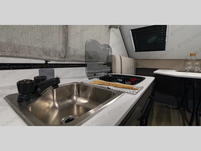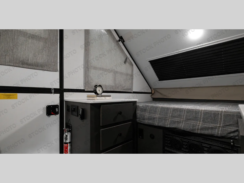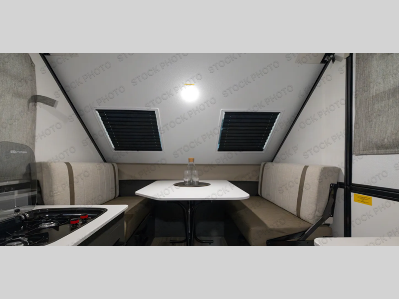 You can be set up at the lake in no time with this A-frame camper! The flip-up bed will provide more storage space for your bags, and you can relax with a cold drink at the 45" x 80" booth dinette once you're unpacked. There is a two-burner cooktop and a 12V refrigerator with a 100W roof solar panel to cook and store meals each day. This model includes tons of exterior storage, including two EZ reach storage trunks and additional exterior storage for all your camp gear!