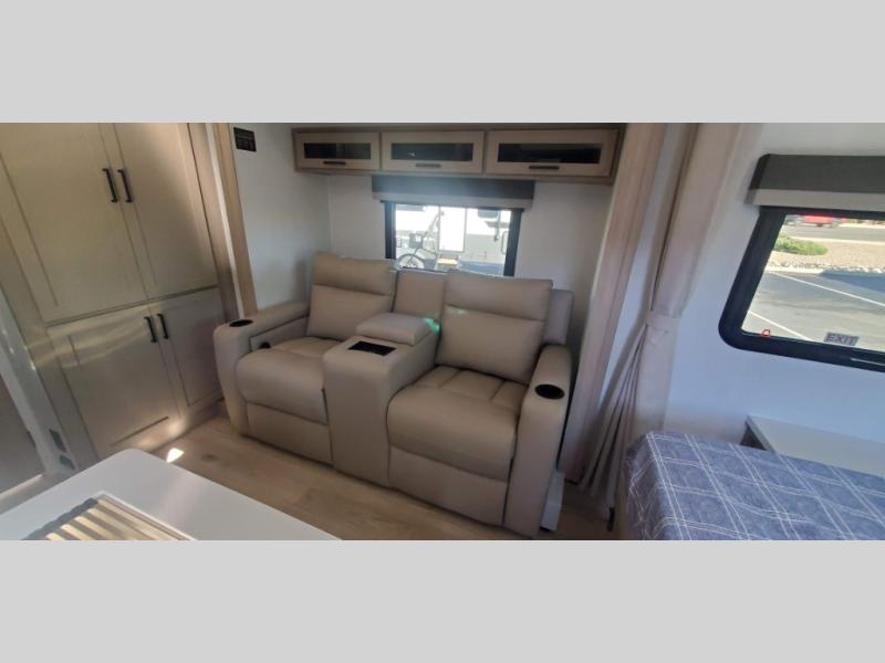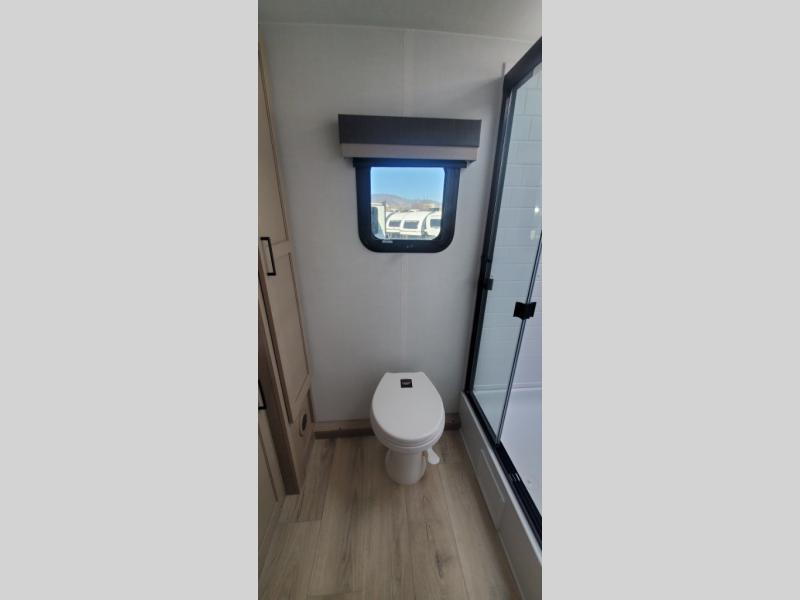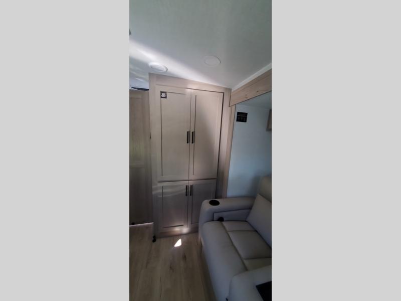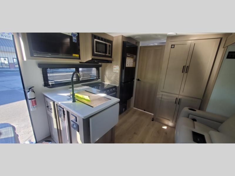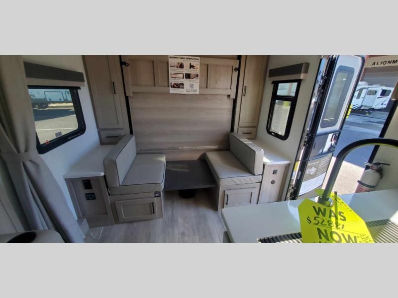 This versatile travel trailer is perfect for weekend camping trips to your favorite park! Once you arrive at your site, you can unload the pass-thru storage, then put out the 15' power awning and relax in your camp chairs. The cooktop and microwave inside will let you make lunch when you get hungry, and there is a theater seat slide out if you want a comfy place to relax. There is also a 30" x 80" booth dinette up front where you can dine together and play games in the evenings, and when you're ready for bed, the 60" x 74" Murphy bed can be folded down over the dinette. This unit includes plenty of storage spaces, including dual bedside wardrobes, a kitchen pantry, and a linen closet in the full rear bath!