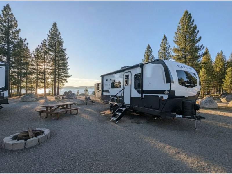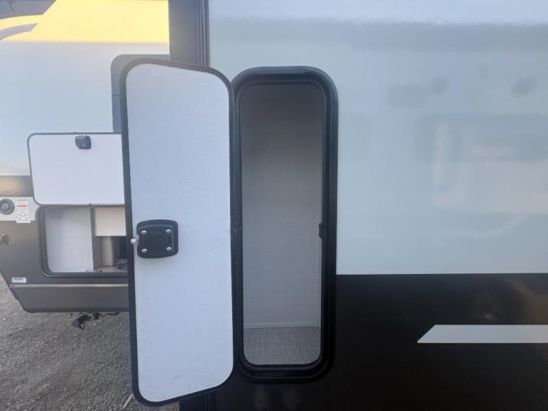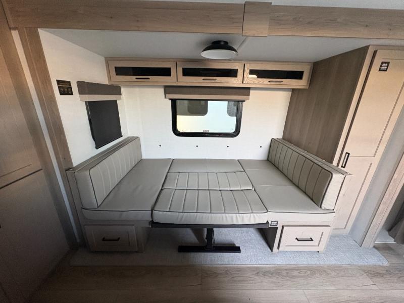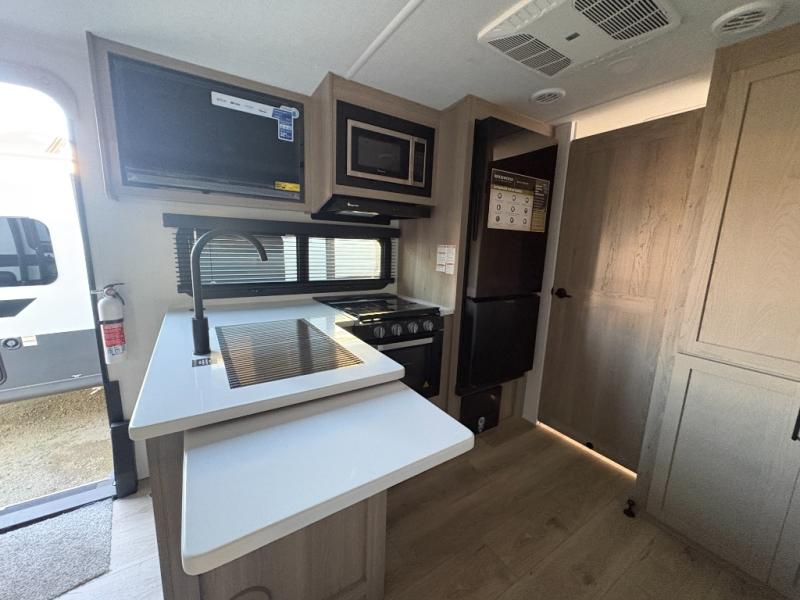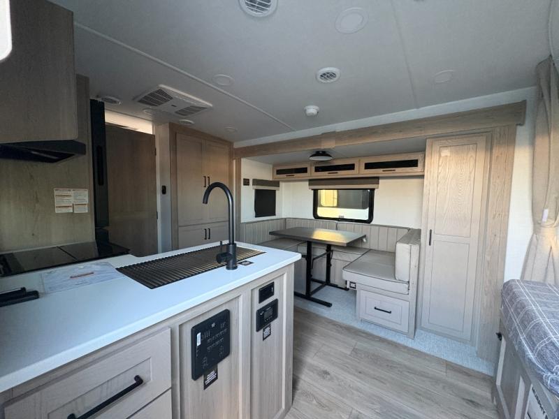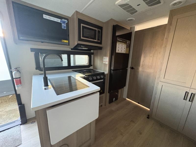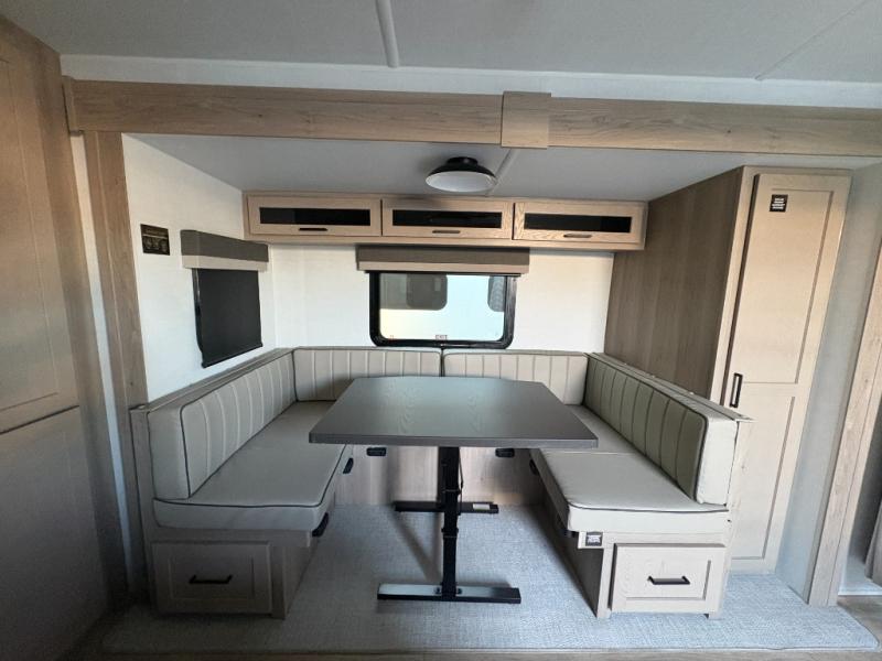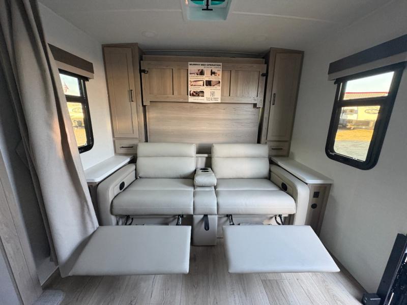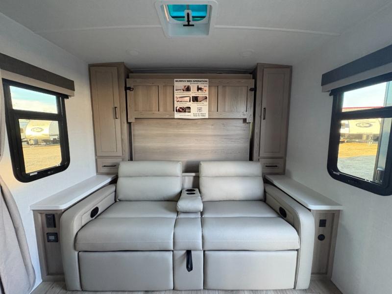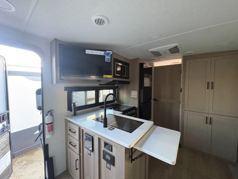 This versatile and cozy travel trailer will be perfect for weekend trips to the lake. Once you arrive at your campground, you can unload the water toys from the pass-thru storage and put out the 15' power awning. The U-shaped dinette slide inside will provide a place to dine, play board games, and let a guest or two sleep over, while you take the RV queen-size Murphy bed up front. In the morning, just fold up the bed to expose the 74" sofa! There is a three-burner cooktop and microwave oven in the kitchen to make meals each day, along with a 12V refrigerator to keep leftovers fresh.
