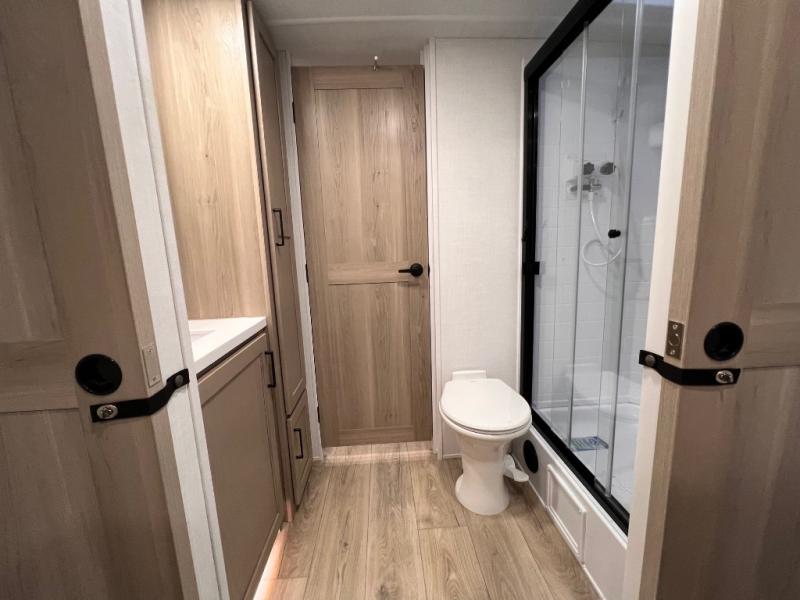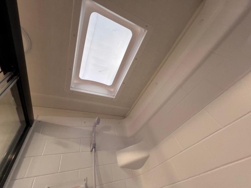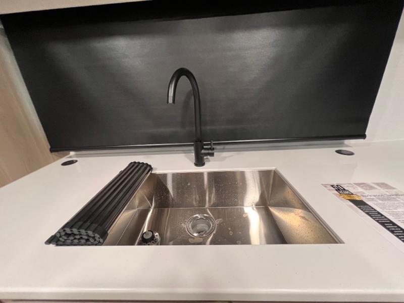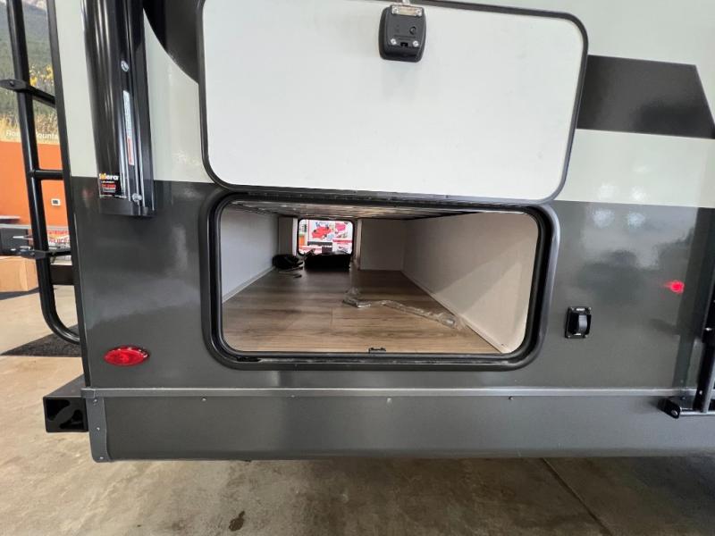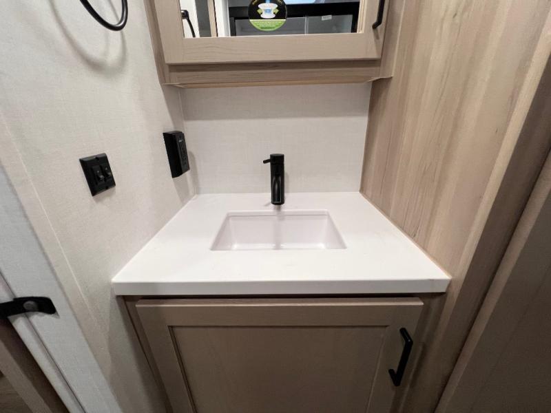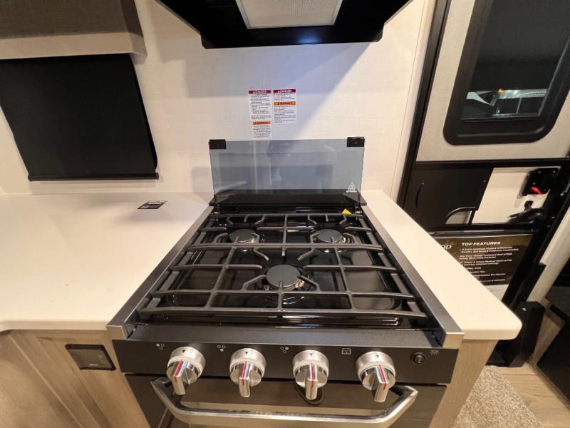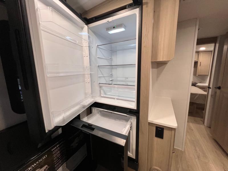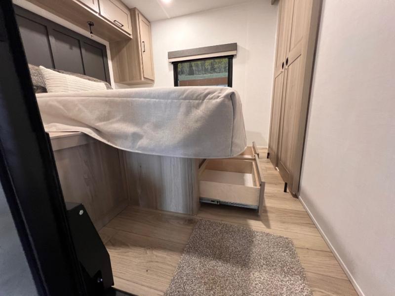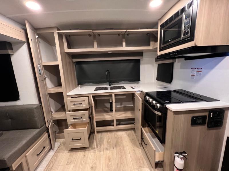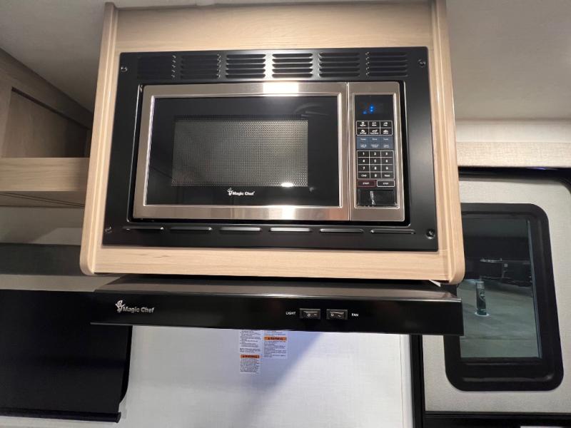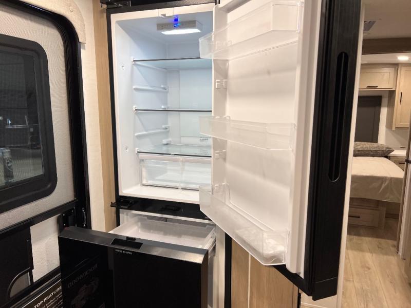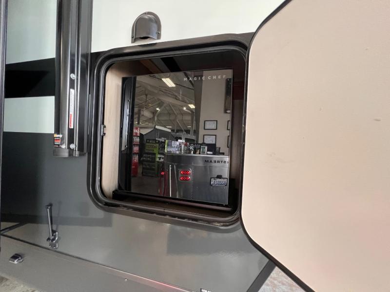 The spacious front kitchen in this model is a dream come true for campers who enjoy preparing meals on the road. With plenty of counter space, a three-burner cooktop, microwave, and stainless steel appliances, you can whip up everything from bacon and eggs to gourmet dinners with ease. Prefer to cook outside? Fire up the outdoor griddle and enjoy cooking under the stars!