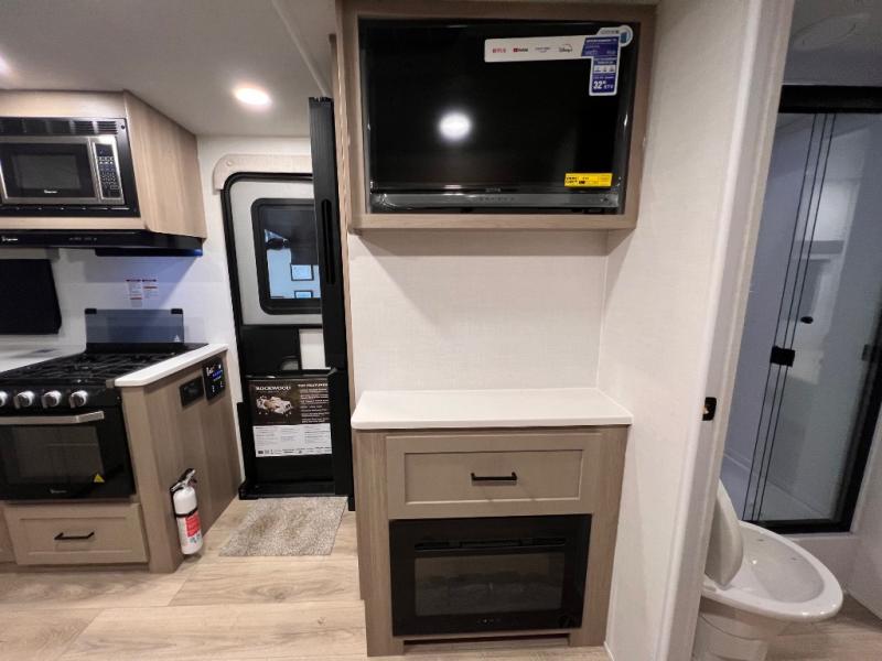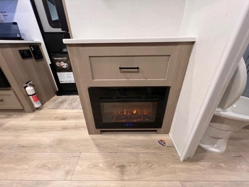 Spacious front kitchen, cozy fireplace, and ready for adventure—the 2026 Rockwood Mini Lite 2506FK does it all.