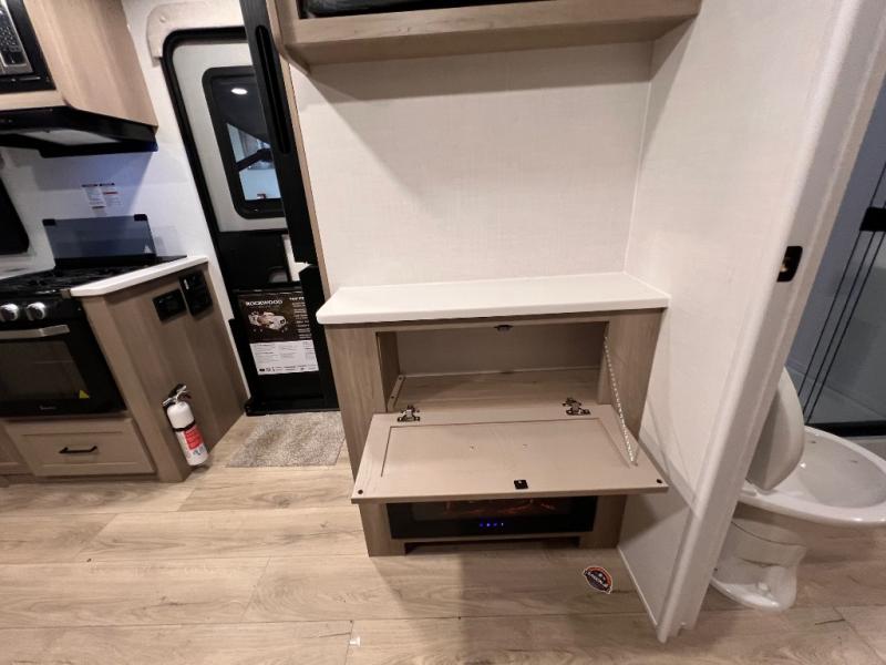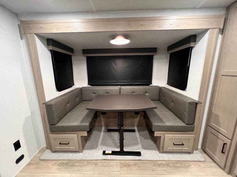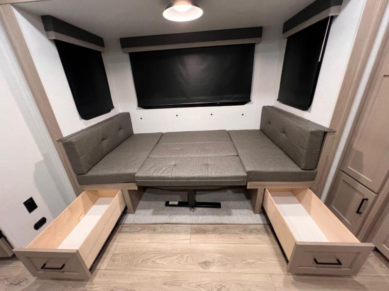 Step into a bright and open living area where the U-shaped dinette slide provides the perfect spot for meals, game nights, or lounging in front of the 12V Smart TV and cozy fireplace. When the sun goes down, the dinette easily converts into additional sleeping space for your guests.