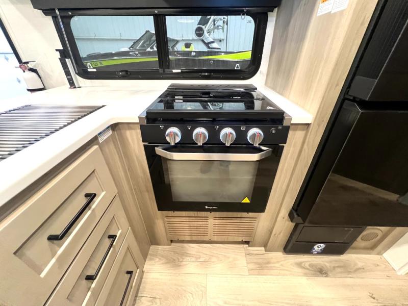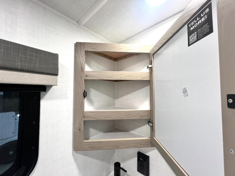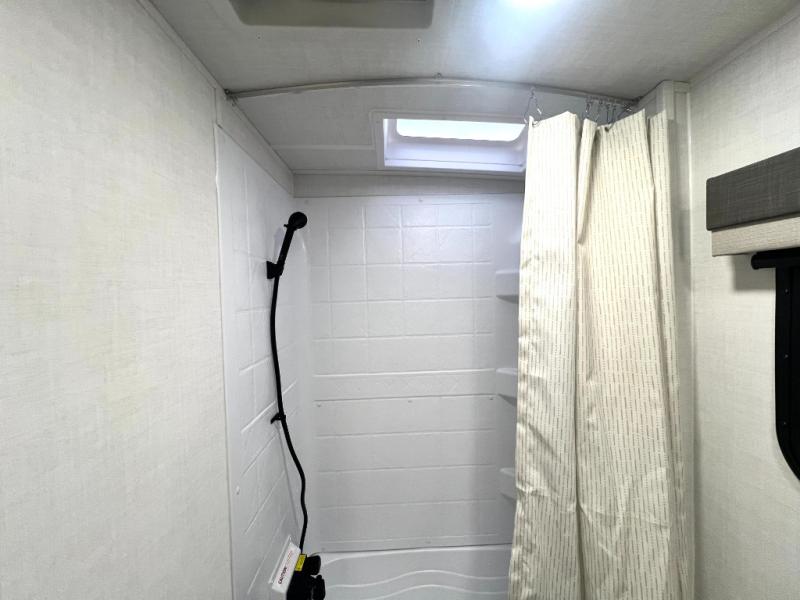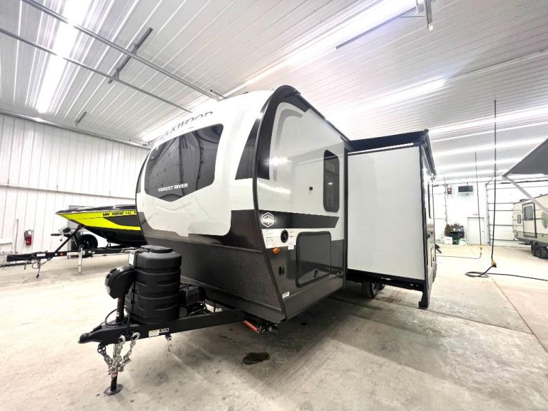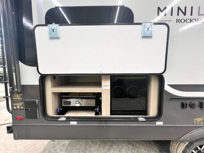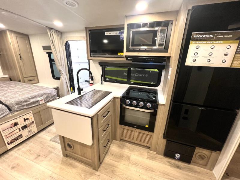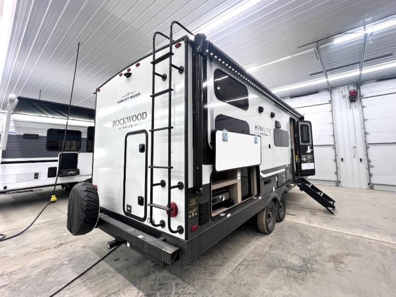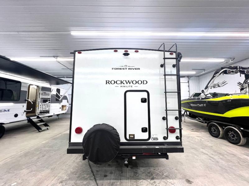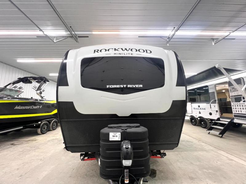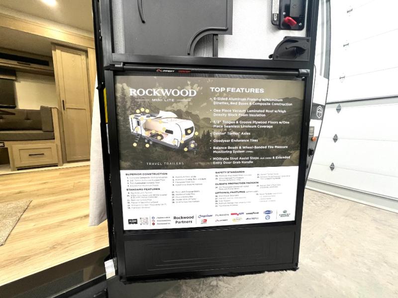 Each Rockwood Mini Lite travel trailer by Forest River is constructed with a fully laminated one-piece walkable roof, sleek frameless windows, and a six-sided full aluminum frame for strength and durability. The 12V thermostatically controlled heated tanks, plus radiant foil in the underbelly will allow you to camp well into the colder months, and the 200W roof solar panel will be perfect for a little off-gridding. Each model includes solid surface kitchen countertops, hidden hinge cabinet doors, roller shades, plus many more interior features. Having an AIR 360+ omnidirectional antenna with WiFi prep on board gives you the option to get some work done if it's needed, and the power tongue jack provides hassle-free set up, so you can enjoy more time relaxing!