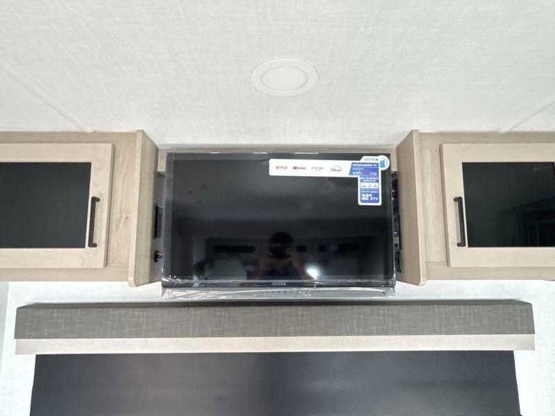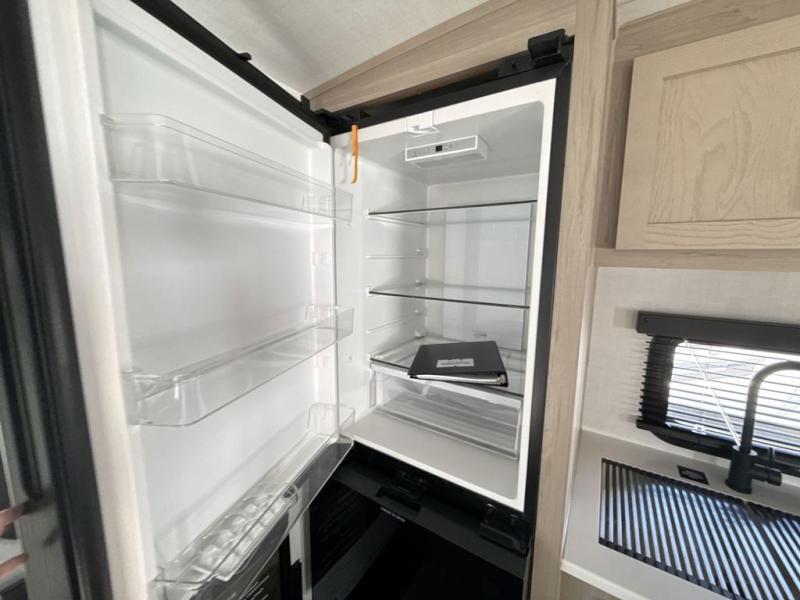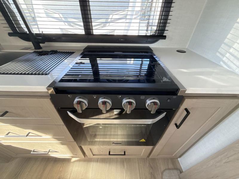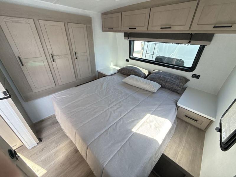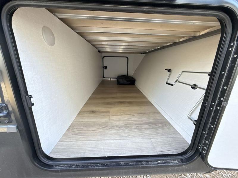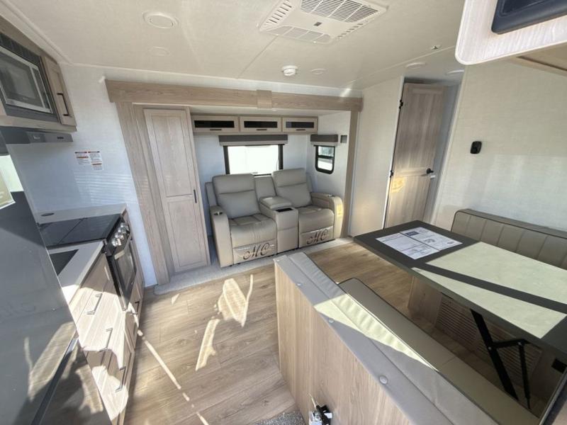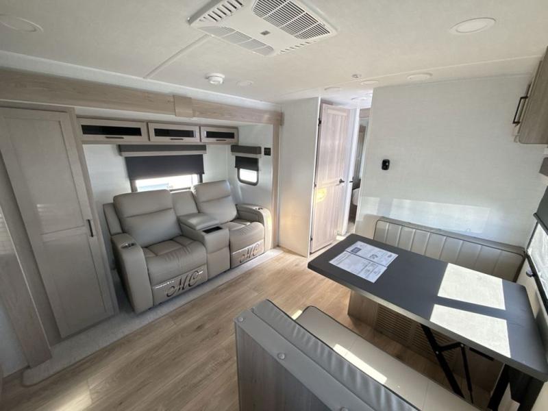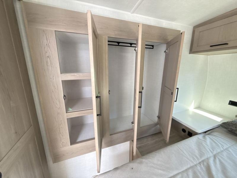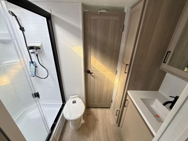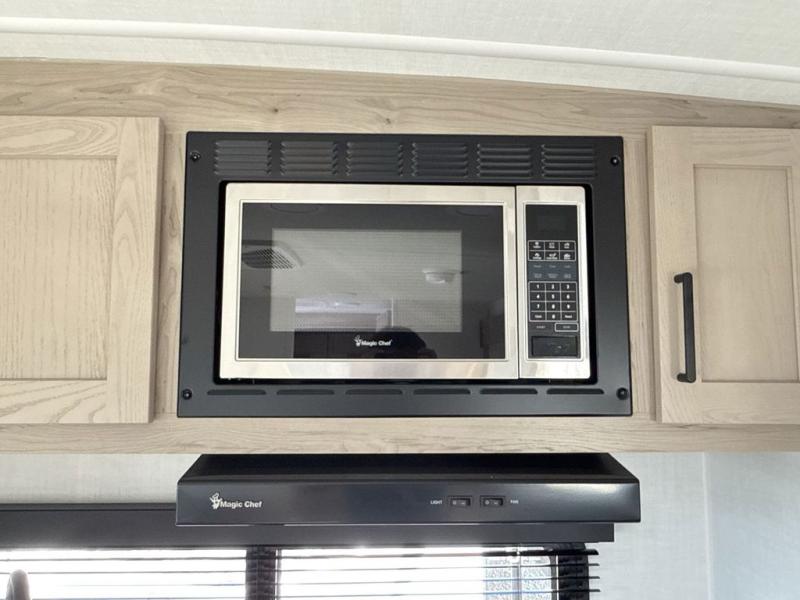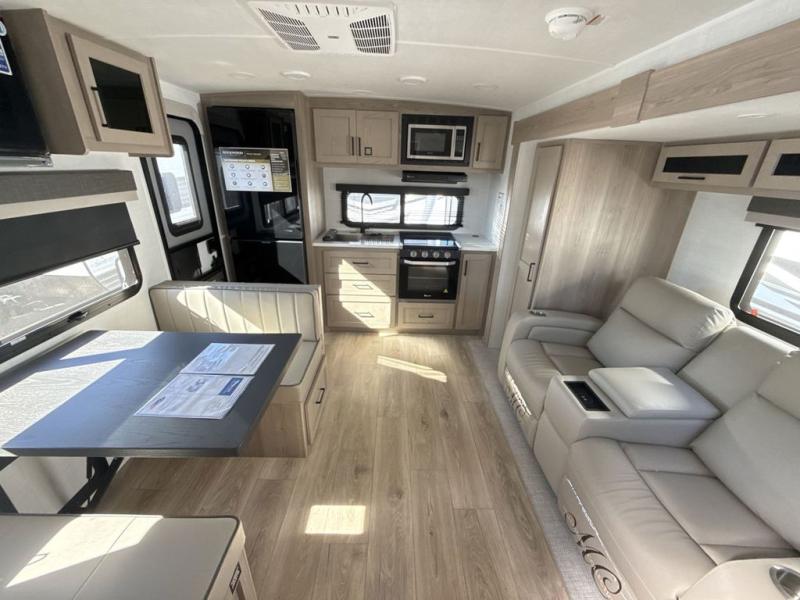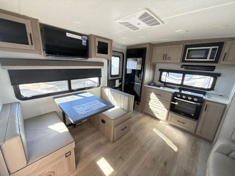 You and your spouse will have a great time camping in this travel trailer! You will have your own RV queen bed to sleep on in the front private bedroom, and an optional TV can be added if you enjoy the morning news in bed. Breakfast can be made on the three burner cooktop in the rear kitchen. The 67" theater seating with cupholders will provide a place to relax and dine together, and the spacious walk-through bath will allow you to clean up before you head out for the day. This model includes plenty of storage space, including a pantry for your snacks, a wardrobe slide out in the bedroom, plus a drop-frame pass-through storage for larger camp gear!
