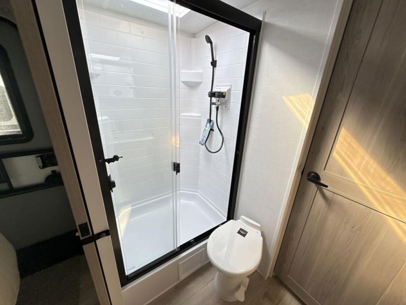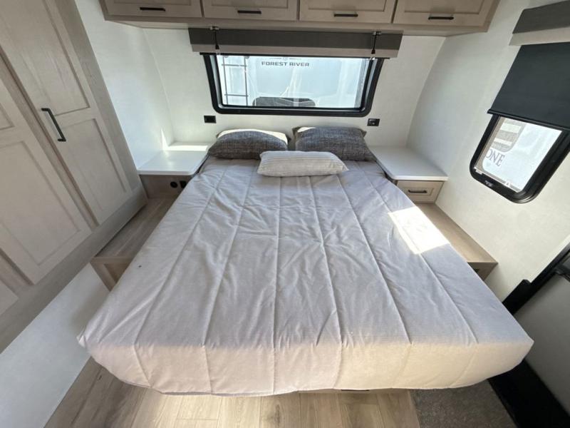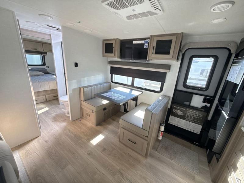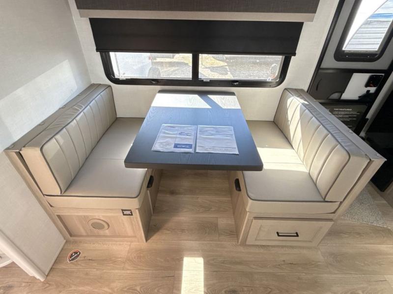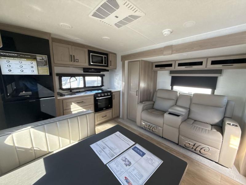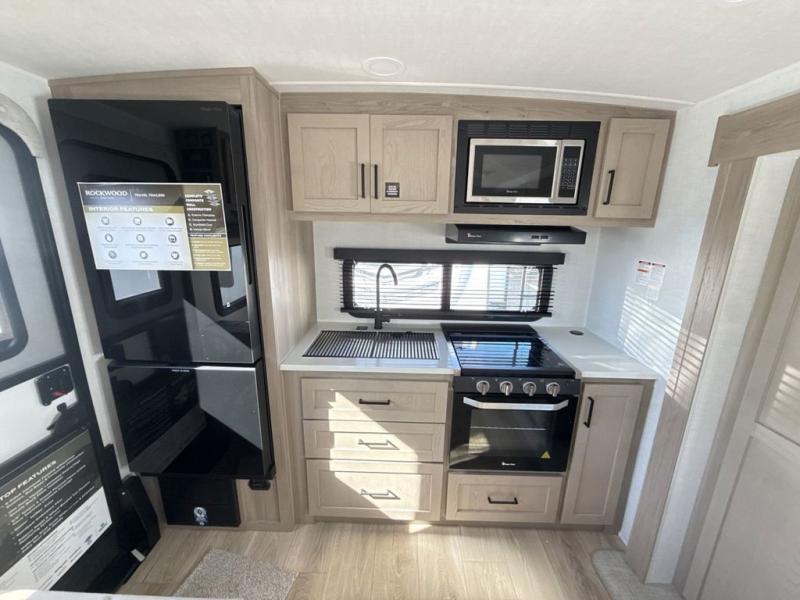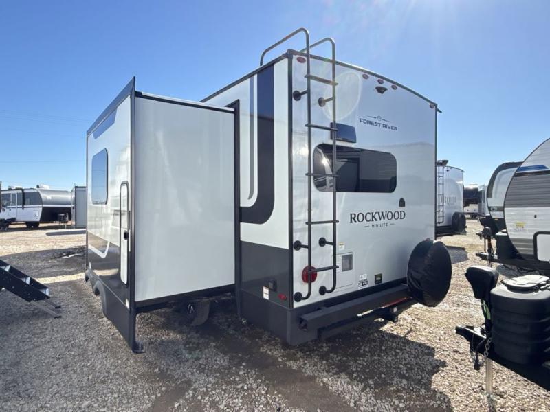 Each Rockwood Mini Lite travel trailer by Forest River is constructed with a fully laminated one-piece walkable roof, sleek frameless windows, and a six-sided full aluminum frame for strength and durability. The 12V thermostatically controlled heated tanks, plus radiant foil in the underbelly will allow you to camp well into the colder months, and the 200W roof solar panel will be perfect for a little off-gridding. Each model includes solid surface kitchen countertops, hidden hinge cabinet doors, roller shades, plus many more interior features. Having an AIR 360+ omnidirectional antenna with WiFi prep on board gives you the option to get some work done if it's needed, and the power tongue jack provides hassle-free set up, so you can enjoy more time relaxing!