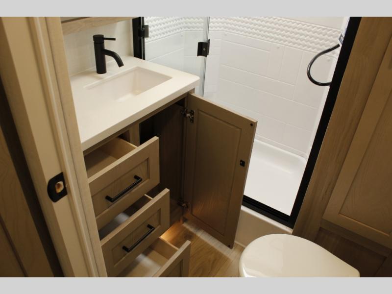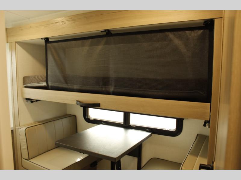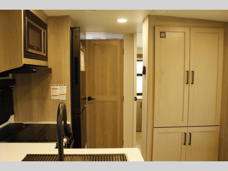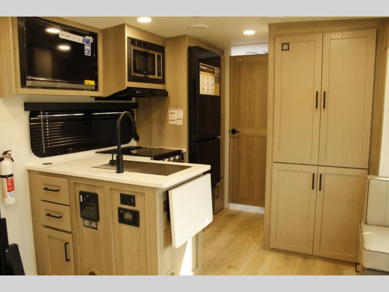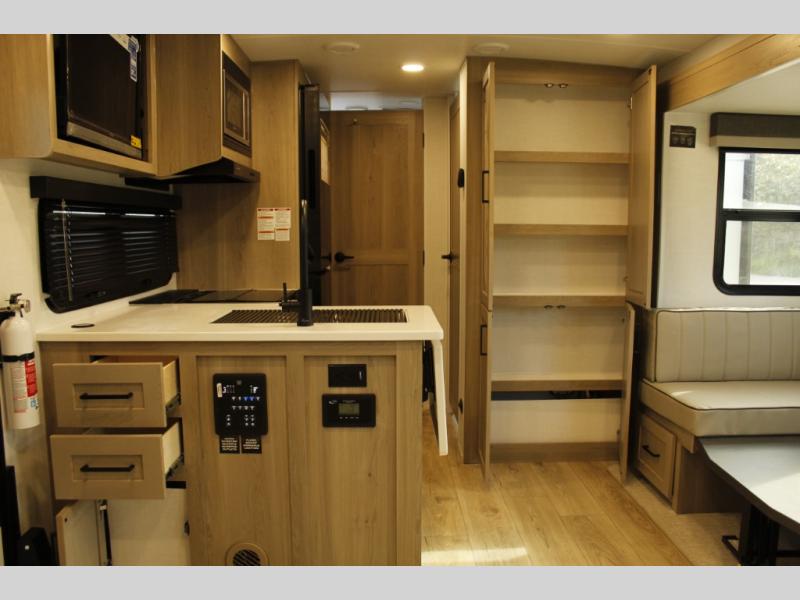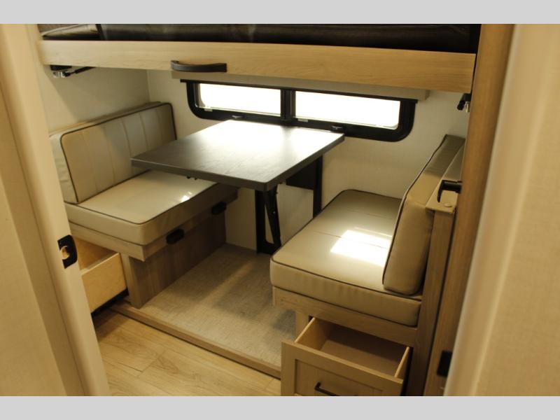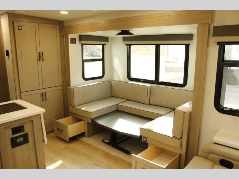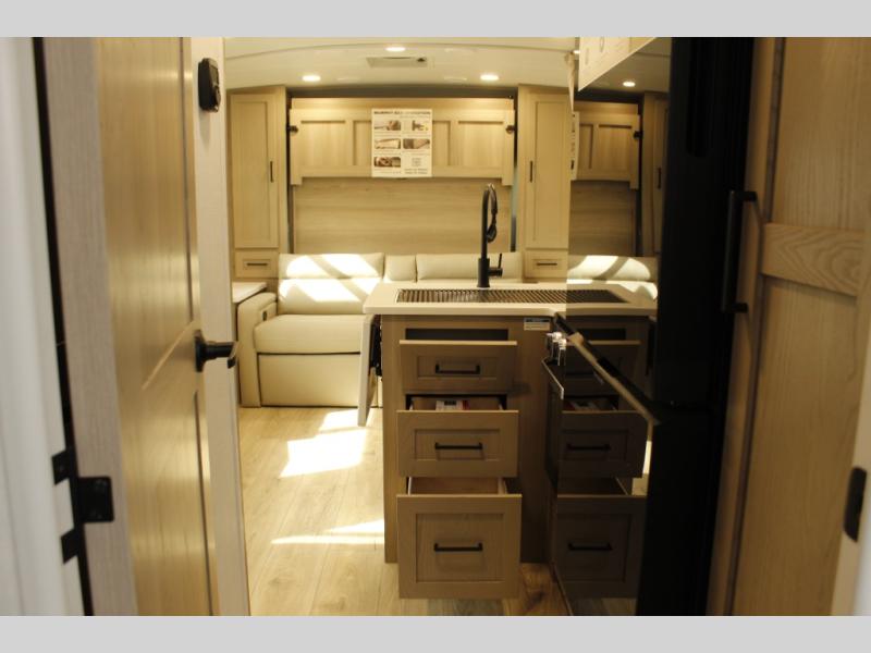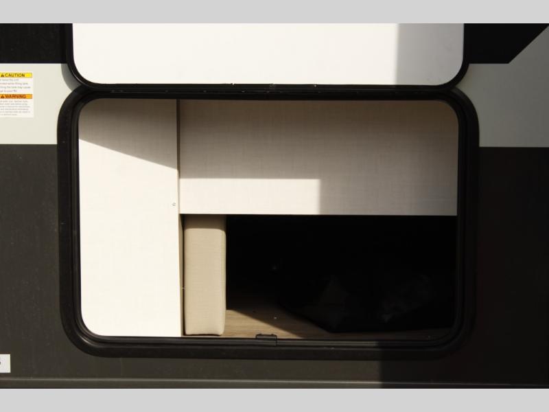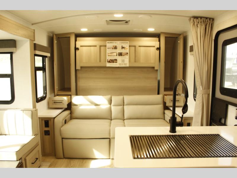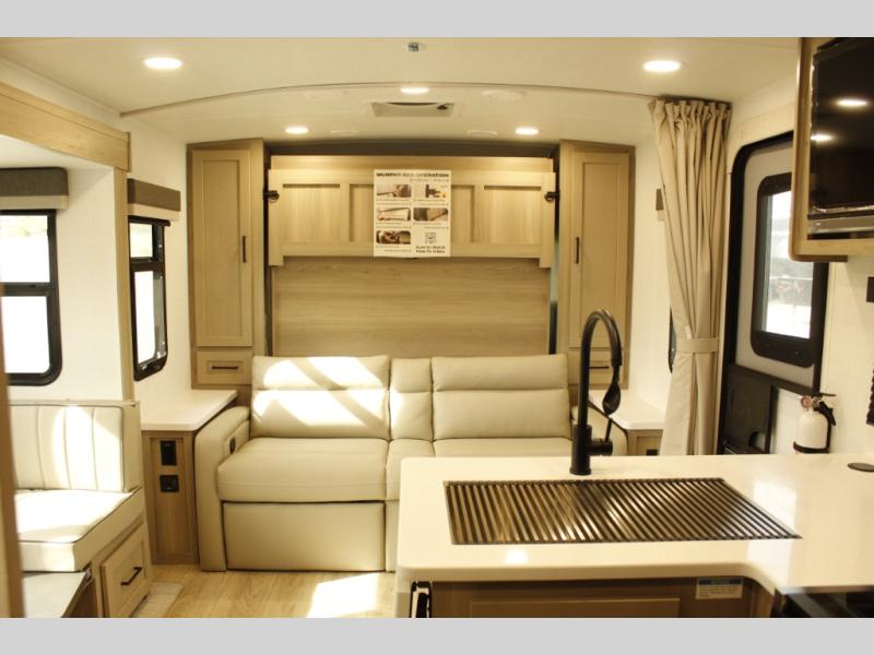 This trailer is one the whole crew will love! Start unloading the pass-thru storage when you arrive at your campsite, then put out the 18' power awning. There is a full bath inside when you need to freshen up, and the fully equipped interior kitchen can be used if the weather isn't cooperating with your plans. A U-shaped dinette slide provides a place to dine together and play board games, and two guests can sleep here at night. Speaking of nighttime, there is also a private bunkhouse in the back with a Dream Dinette and flip-up bunk plus a slide out for more space and an optional TV. You'll find your own space up front on the RV queen Murphy bed, complete with dual wardrobes and a privacy curtain when you need to get dressed. And in the morning, you can fold away the bed to relax on the 74" sofa!