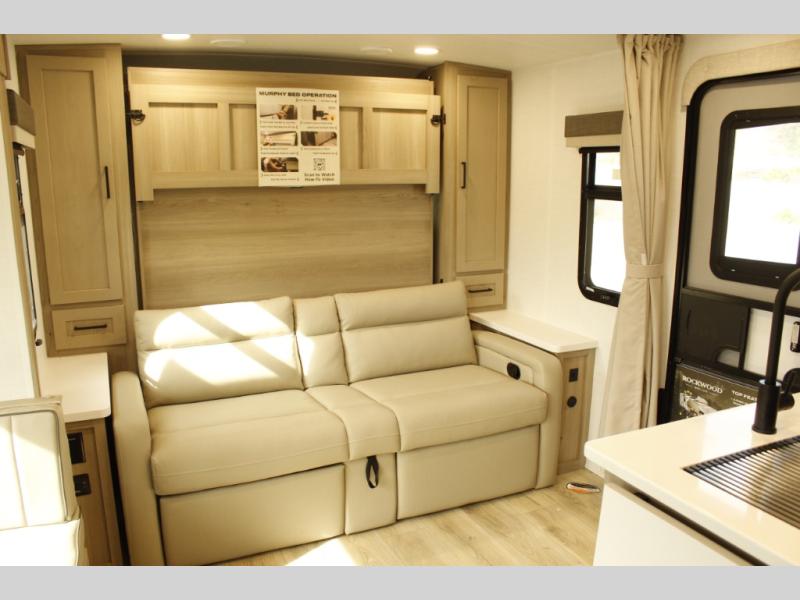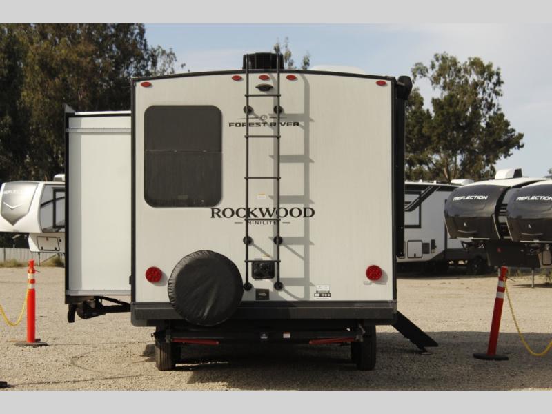 Each Rockwood Mini Lite travel trailer by Forest River is constructed with a fully laminated one-piece walkable roof, sleek frameless windows, and a six-sided full aluminum frame for strength and durability. The 12V thermostatically controlled heated tanks, plus radiant foil in the underbelly will allow you to camp well into the colder months, and the 200W roof solar panel will be perfect for a little off-gridding. Each model includes solid surface kitchen countertops, hidden hinge cabinet doors, roller shades, plus many more interior features. Having an AIR 360+ omnidirectional antenna with WiFi prep on board gives you the option to get some work done if it's needed, and the power tongue jack provides hassle-free set up, so you can enjoy more time relaxing!