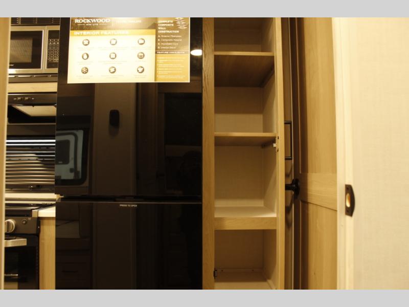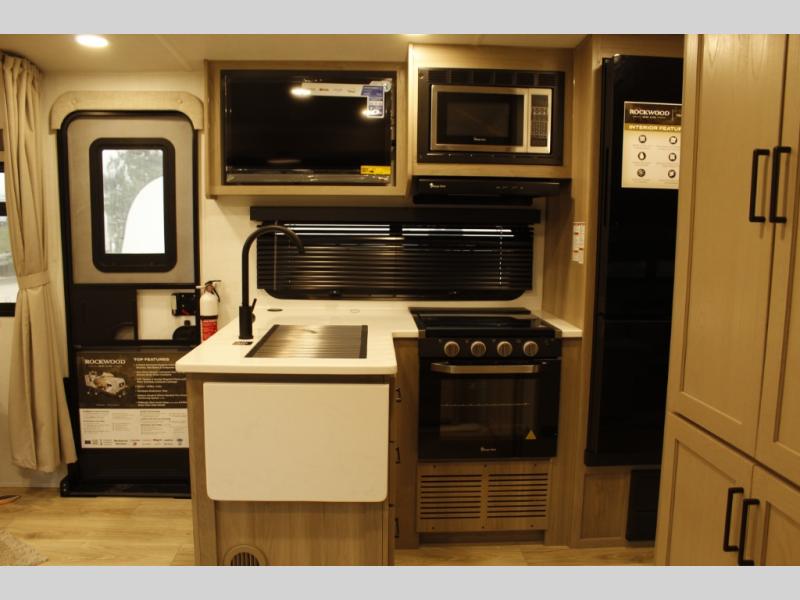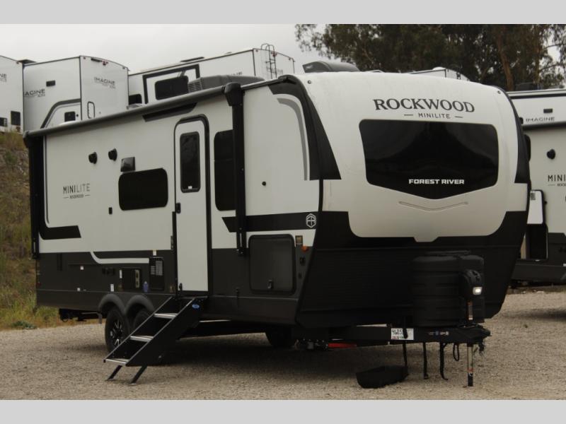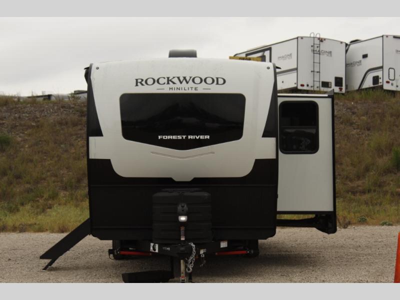 Each Rockwood Mini Lite travel trailer by Forest River is constructed with a fully laminated one-piece walkable roof, sleek frameless windows, and a six-sided full aluminum frame for strength and durability. The 12V thermostatically controlled heated tanks, plus radiant foil in the underbelly will allow you to camp well into the colder months, and the 200W roof solar panel will be perfect for a little off-gridding. Each model includes solid surface kitchen countertops, hidden hinge cabinet doors, roller shades, plus many more interior features. Having an AIR 360+ omnidirectional antenna with WiFi prep on board gives you the option to get some work done if it's needed, and the power tongue jack provides hassle-free set up, so you can enjoy more time relaxing!