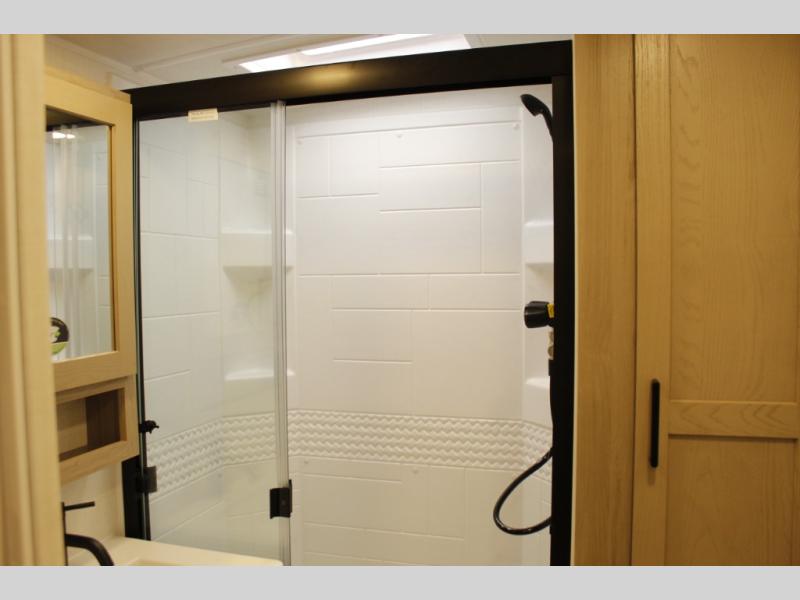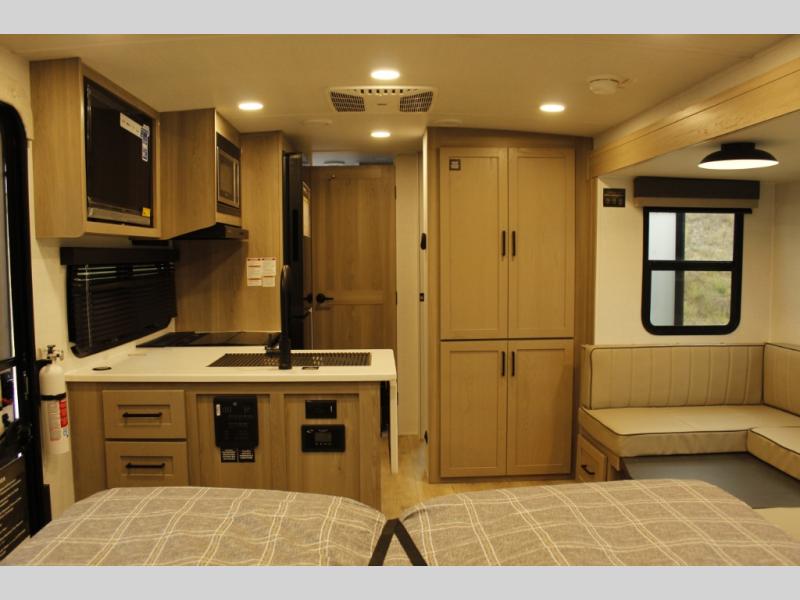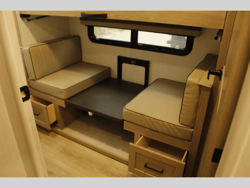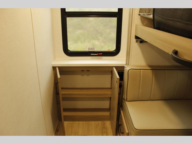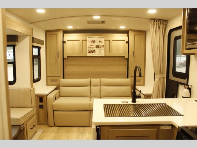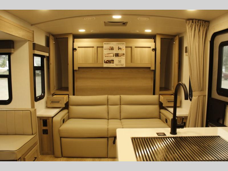 This trailer is one the whole crew will love! Start unloading the pass-thru storage when you arrive at your campsite, then put out the 18' power awning. There is a full bath inside when you need to freshen up, and the fully equipped interior kitchen can be used if the weather isn't cooperating with your plans. A U-shaped dinette slide provides a place to dine together and play board games, and two guests can sleep here at night. Speaking of nighttime, there is also a private bunkhouse in the back with a Dream Dinette and flip-up bunk plus a slide out for more space and an optional TV. You'll find your own space up front on the RV queen Murphy bed, complete with dual wardrobes and a privacy curtain when you need to get dressed. And in the morning, you can fold away the bed to relax on the 74" sofa!