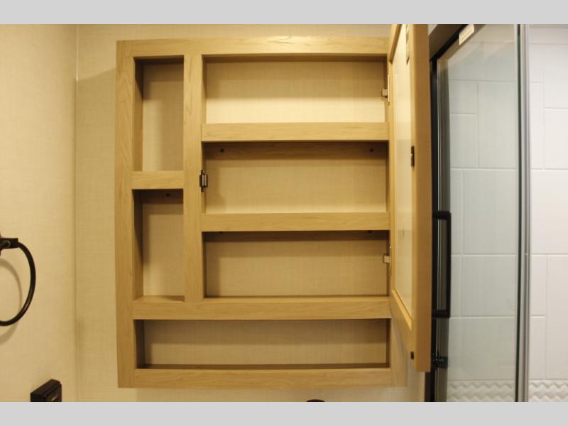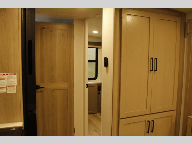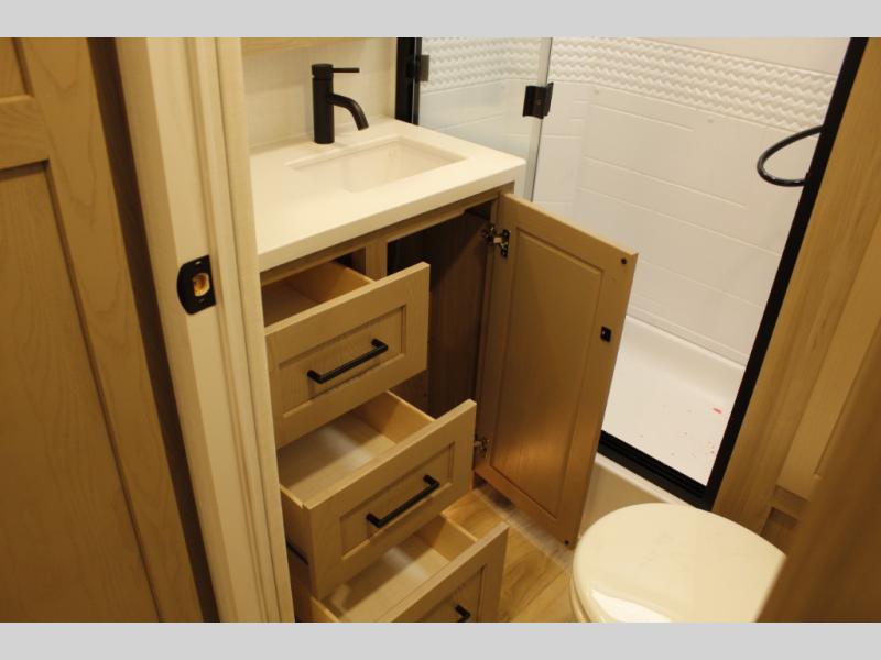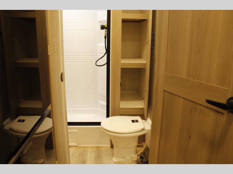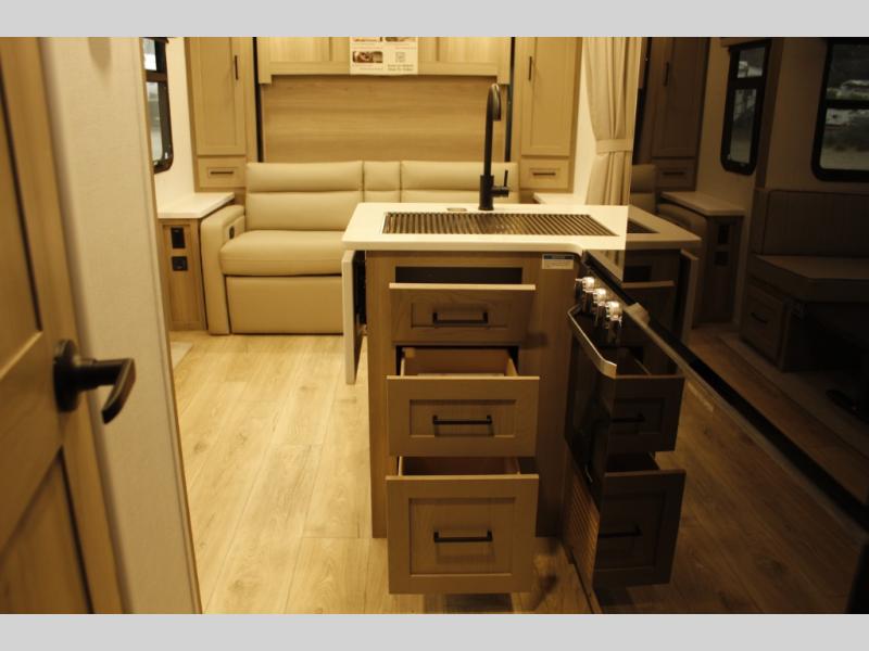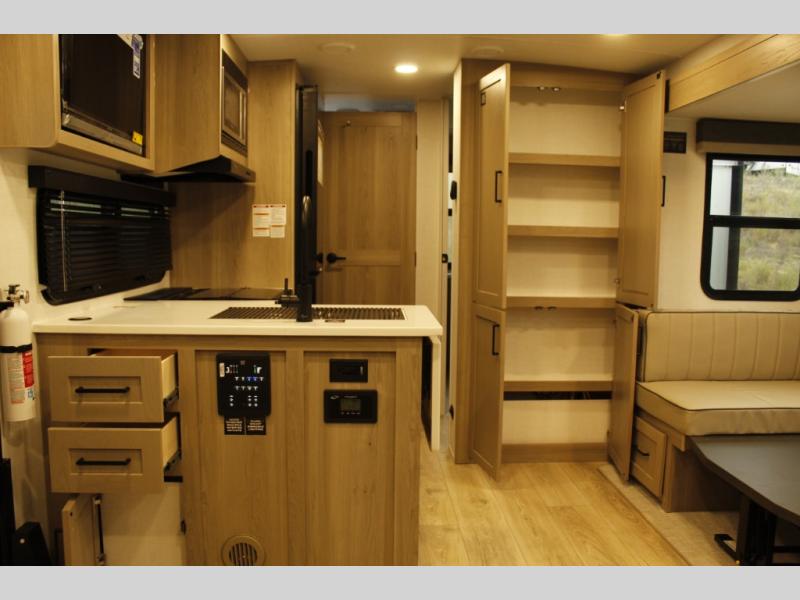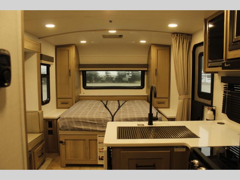 This trailer is one the whole crew will love! Start unloading the pass-thru storage when you arrive at your campsite, then put out the 18' power awning. There is a full bath inside when you need to freshen up, and the fully equipped interior kitchen can be used if the weather isn't cooperating with your plans. A U-shaped dinette slide provides a place to dine together and play board games, and two guests can sleep here at night. Speaking of nighttime, there is also a private bunkhouse in the back with a Dream Dinette and flip-up bunk plus a slide out for more space and an optional TV. You'll find your own space up front on the RV queen Murphy bed, complete with dual wardrobes and a privacy curtain when you need to get dressed. And in the morning, you can fold away the bed to relax on the 74" sofa!