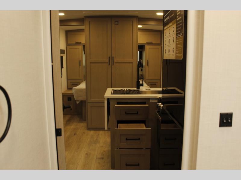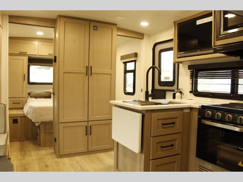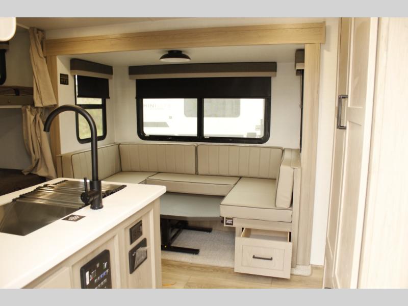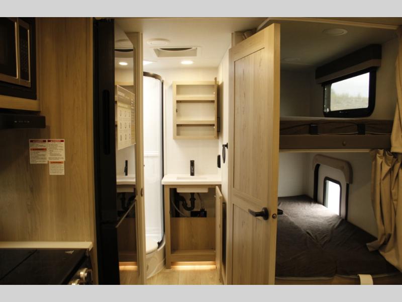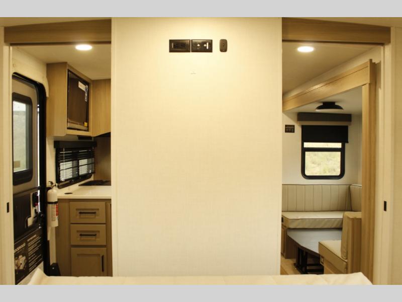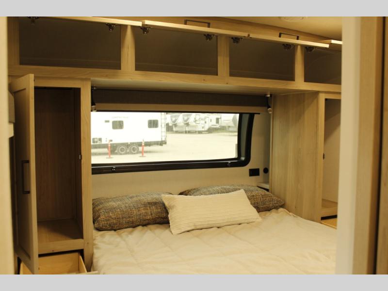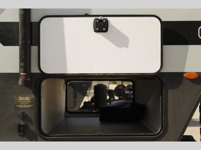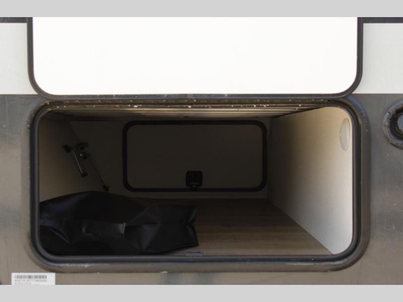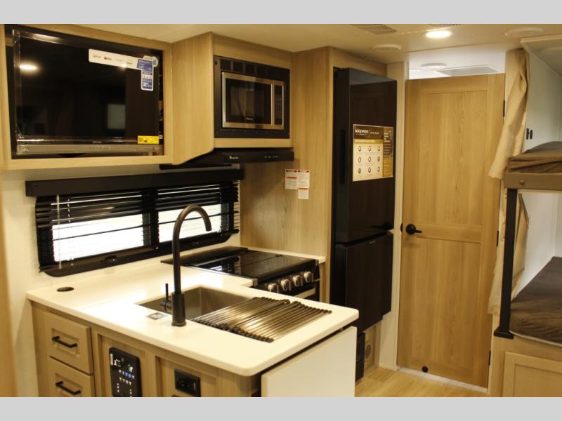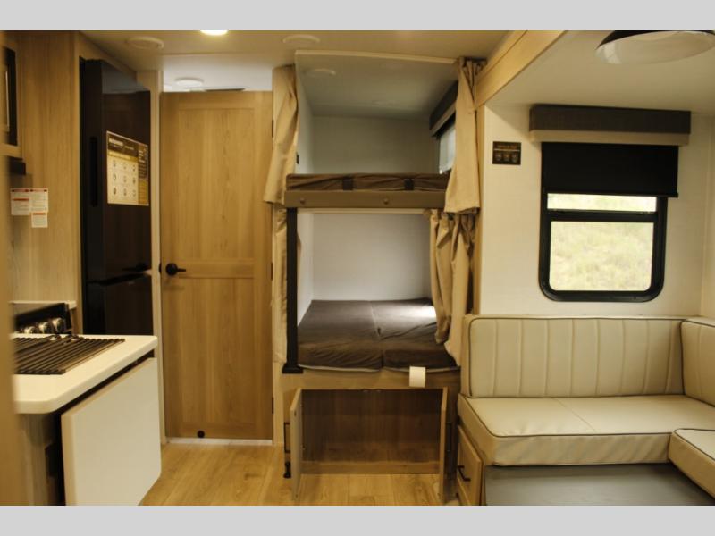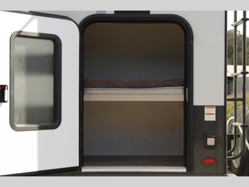 This bunkhouse model is perfect for your crew of six! You will appreciate the exterior bike door that lets you store gear under the flip-up bottom bunk, plus there is a pass-thru storage up front for even more storage. The RV queen bed in the front bedroom includes flip-up storage, two wardrobes, and a TV option if you like to stay up late with a movie. In the morning, everyone can meet in the combined kitchen and living area to dine around the U-shaped dinette, or you can take your plate outdoors to sit under the 18' power awning with LED lights.
