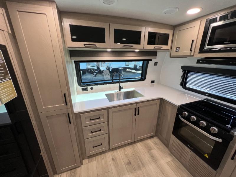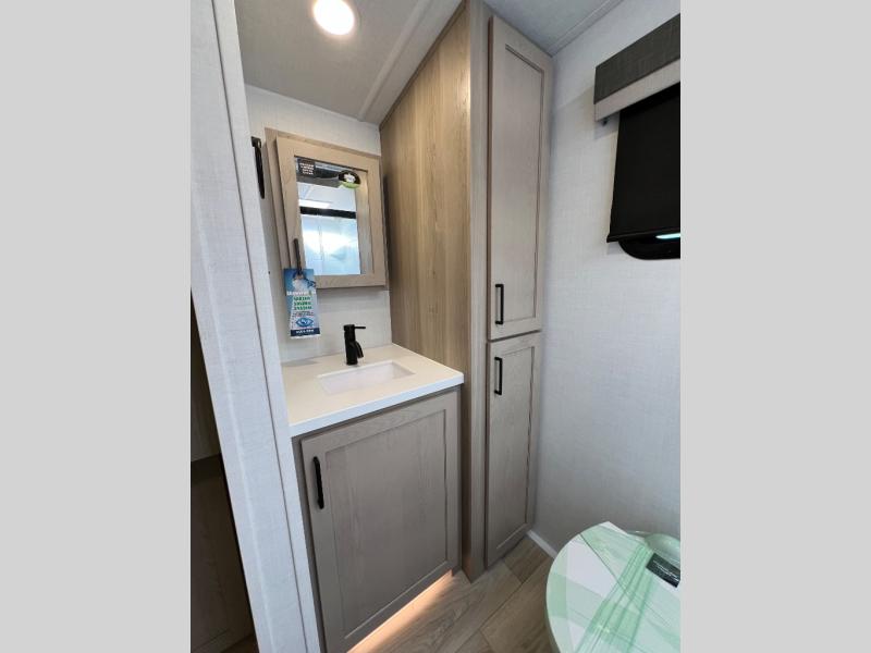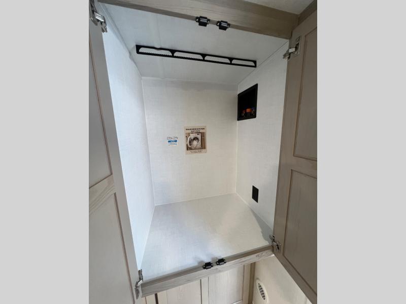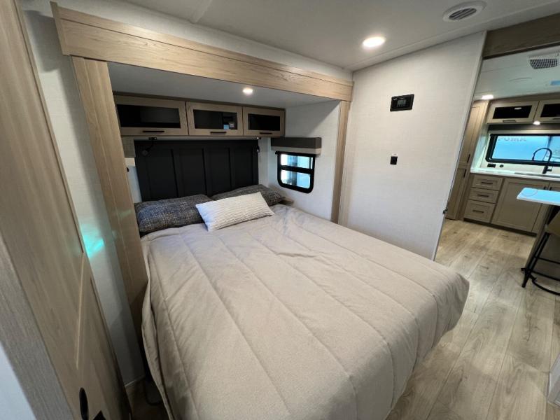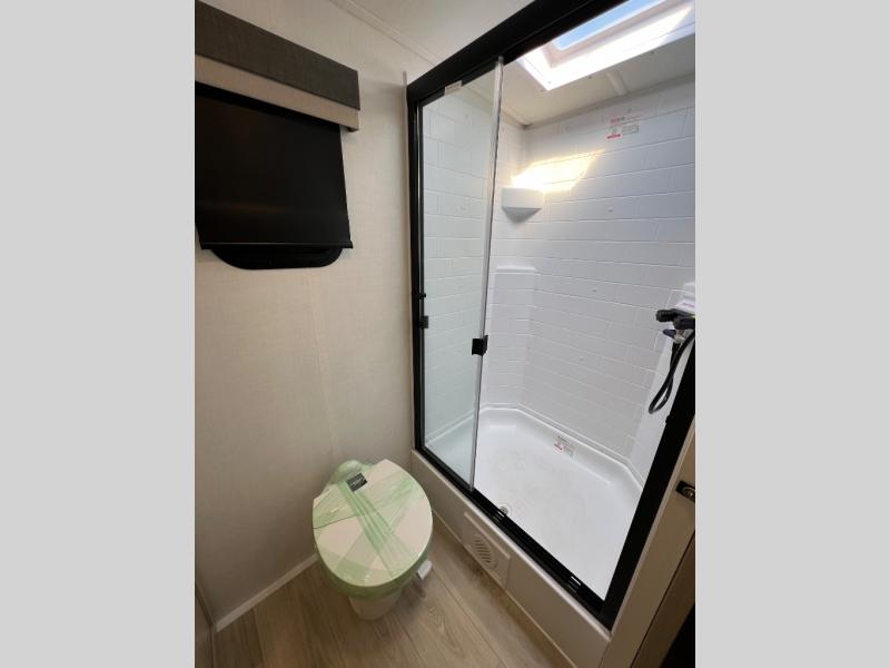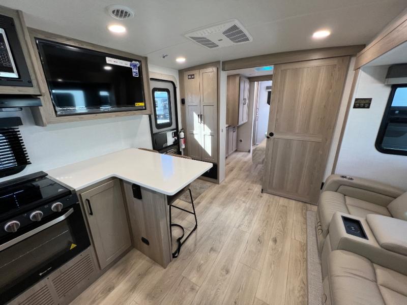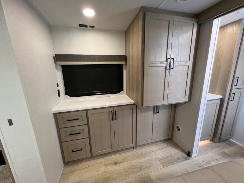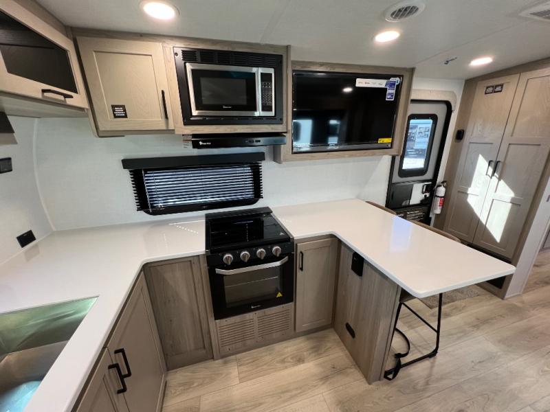 This travel trailer is the best option for you and your partner! The lavish full rear bathroom features a spacious layout and a convenient linen closet, perfect for relaxation and refreshment. The elegant bedroom boasts a plush queen bed, ample wardrobe space, and stylish dresser, creating a serene retreat. The spacious living room and kitchen combined area is the heart of the trailer, featuring plush theater seating for cozy movie nights, a generous closet for storing essentials, and a 12V Smart TV for entertainment on the go. Plus, the expansive countertop with chairs provides a perfect spot for gourmet meals or socializing, while the premium three-burner cooktop, kitchen pantry, and microwave make meal prep and cooking a true delight.