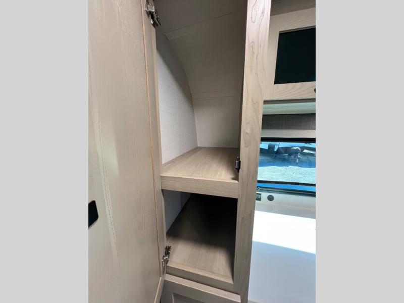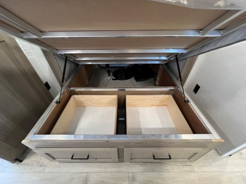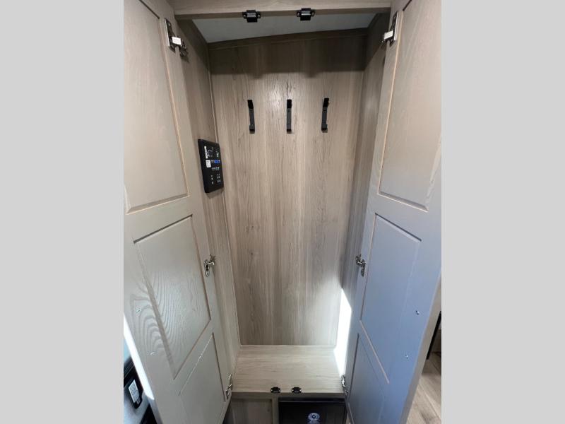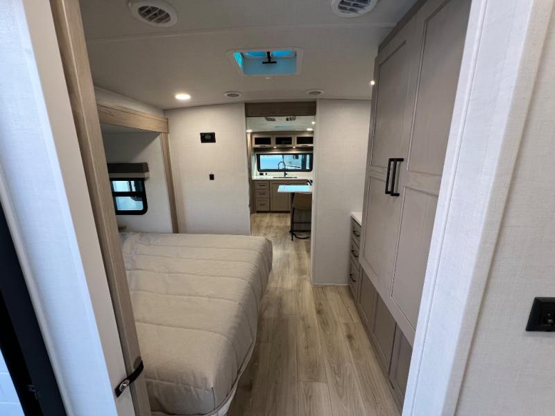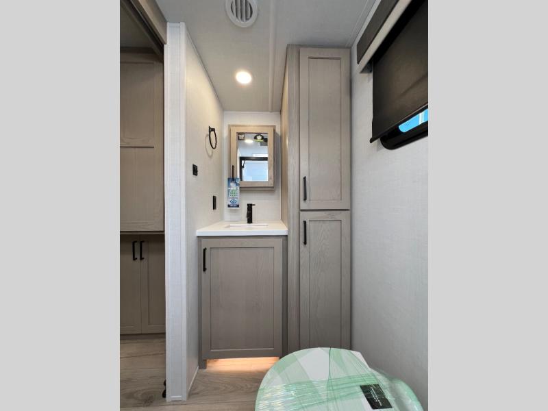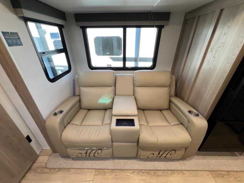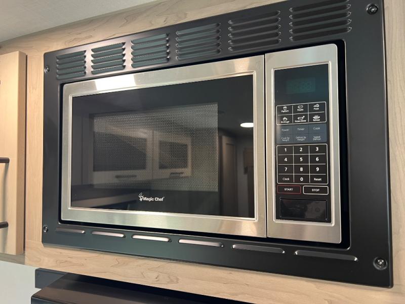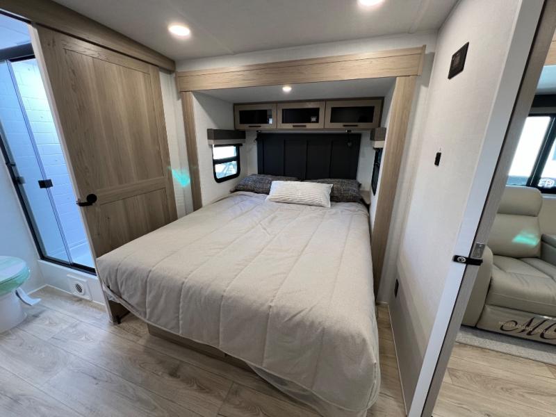 This travel trailer is the best option for you and your partner! The lavish full rear bathroom features a spacious layout and a convenient linen closet, perfect for relaxation and refreshment. The elegant bedroom boasts a plush queen bed, ample wardrobe space, and stylish dresser, creating a serene retreat. The spacious living room and kitchen combined area is the heart of the trailer, featuring plush theater seating for cozy movie nights, a generous closet for storing essentials, and a 12V Smart TV for entertainment on the go. Plus, the expansive countertop with chairs provides a perfect spot for gourmet meals or socializing, while the premium three-burner cooktop, kitchen pantry, and microwave make meal prep and cooking a true delight.
