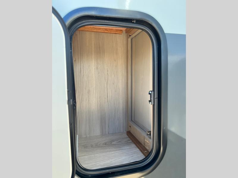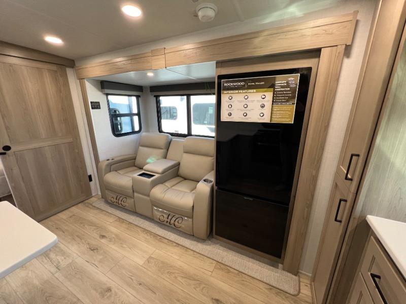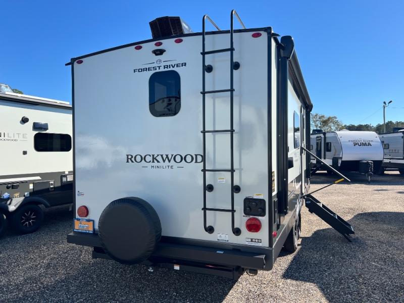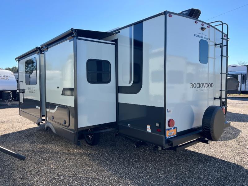 Each Rockwood Mini Lite travel trailer by Forest River is constructed with a fully laminated one-piece walkable roof, sleek frameless windows, and a six-sided full aluminum frame for strength and durability. The 12V thermostatically controlled heated tanks, plus radiant foil in the underbelly will allow you to camp well into the colder months, and the 200W roof solar panel will be perfect for a little off-gridding. Each model includes solid surface kitchen countertops, hidden hinge cabinet doors, roller shades, plus many more interior features. Having an AIR 360+ omnidirectional antenna with WiFi prep on board gives you the option to get some work done if it's needed, and the power tongue jack provides hassle-free set up, so you can enjoy more time relaxing!