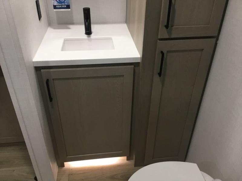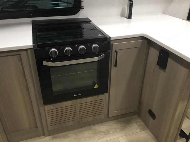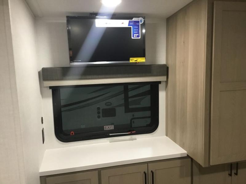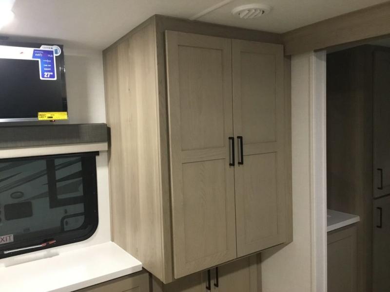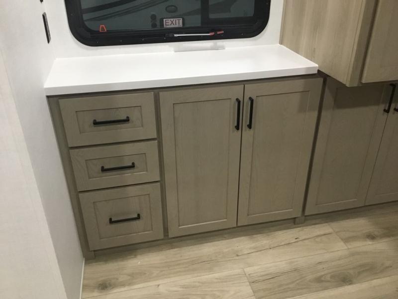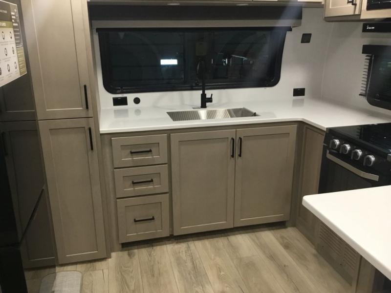 This travel trailer is the best option for you and your partner! The lavish full rear bathroom features a spacious layout and a convenient linen closet, perfect for relaxation and refreshment. The elegant bedroom boasts a plush queen bed, ample wardrobe space, and stylish dresser, creating a serene retreat. The spacious living room and kitchen combined area is the heart of the trailer, featuring plush theater seating for cozy movie nights, a generous closet for storing essentials, and a 12V Smart TV for entertainment on the go. Plus, the expansive countertop with chairs provides a perfect spot for gourmet meals or socializing, while the premium three-burner cooktop, kitchen pantry, and microwave make meal prep and cooking a true delight.