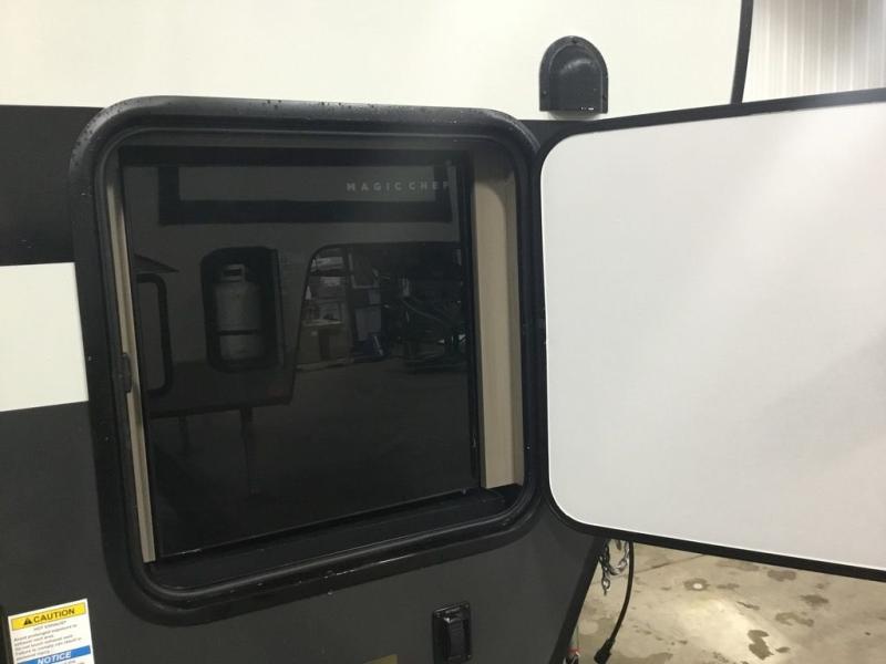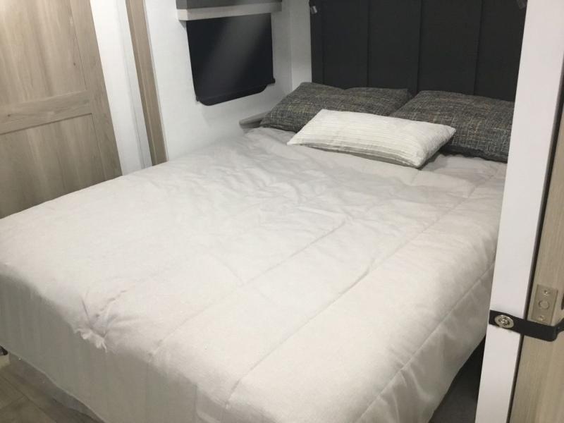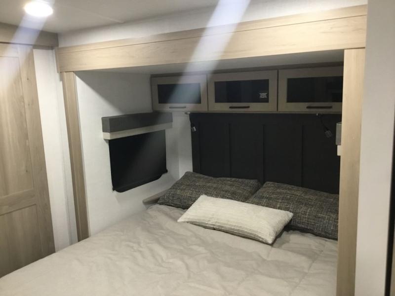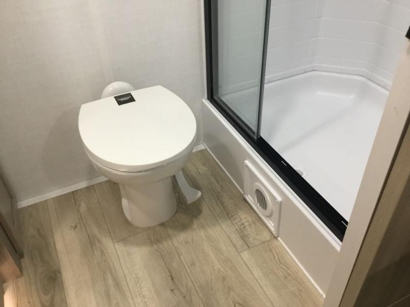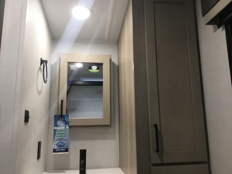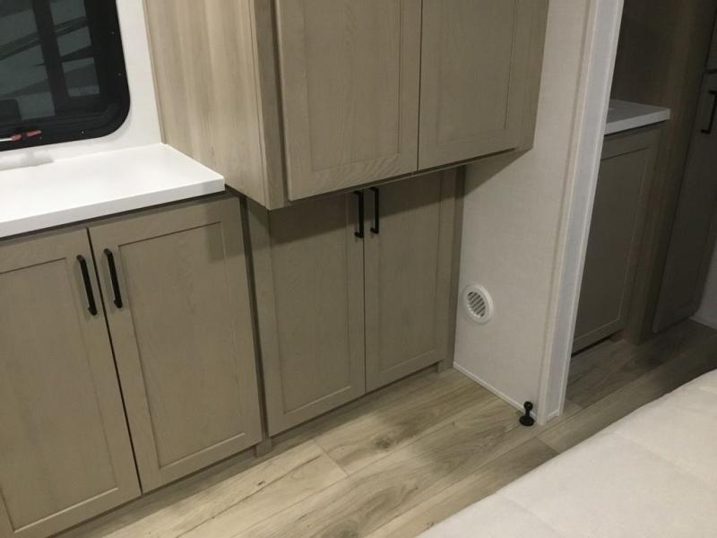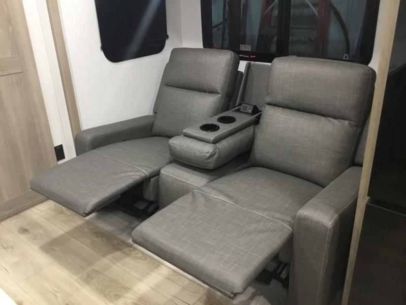 This travel trailer is the best option for you and your partner! The lavish full rear bathroom features a spacious layout and a convenient linen closet, perfect for relaxation and refreshment. The elegant bedroom boasts a plush queen bed, ample wardrobe space, and stylish dresser, creating a serene retreat. The spacious living room and kitchen combined area is the heart of the trailer, featuring plush theater seating for cozy movie nights, a generous closet for storing essentials, and a 12V Smart TV for entertainment on the go. Plus, the expansive countertop with chairs provides a perfect spot for gourmet meals or socializing, while the premium three-burner cooktop, kitchen pantry, and microwave make meal prep and cooking a true delight.