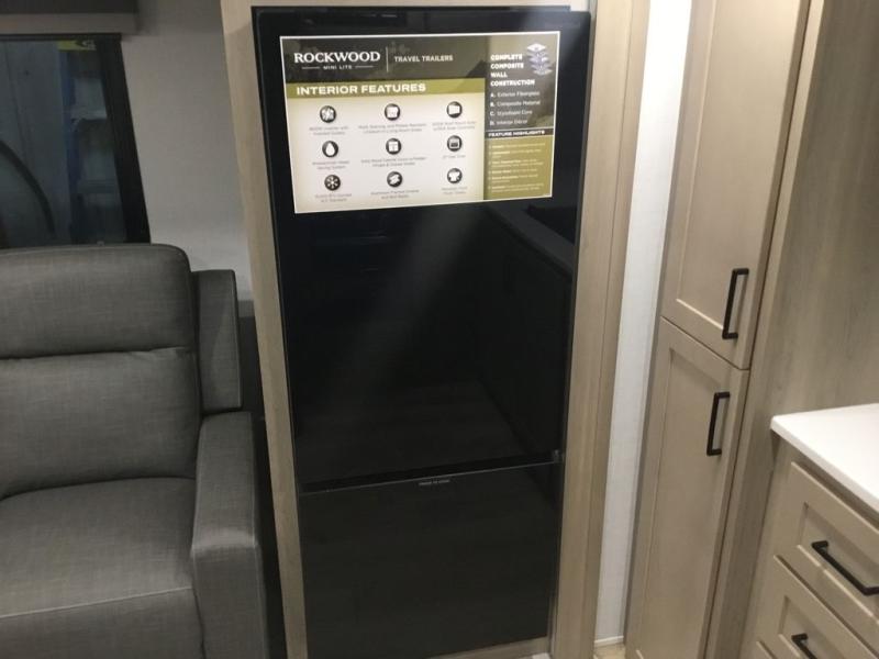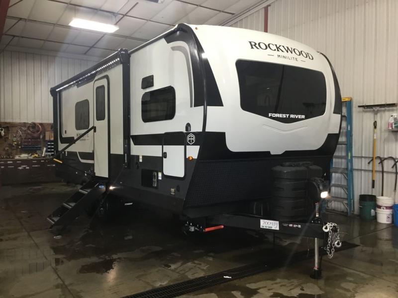 Each Rockwood Mini Lite travel trailer by Forest River is constructed with a fully laminated one-piece walkable roof, sleek frameless windows, and a six-sided full aluminum frame for strength and durability. The 12V thermostatically controlled heated tanks, plus radiant foil in the underbelly will allow you to camp well into the colder months, and the 200W roof solar panel will be perfect for a little off-gridding. Each model includes solid surface kitchen countertops, hidden hinge cabinet doors, roller shades, plus many more interior features. Having an AIR 360+ omnidirectional antenna with WiFi prep on board gives you the option to get some work done if it's needed, and the power tongue jack provides hassle-free set up, so you can enjoy more time relaxing!