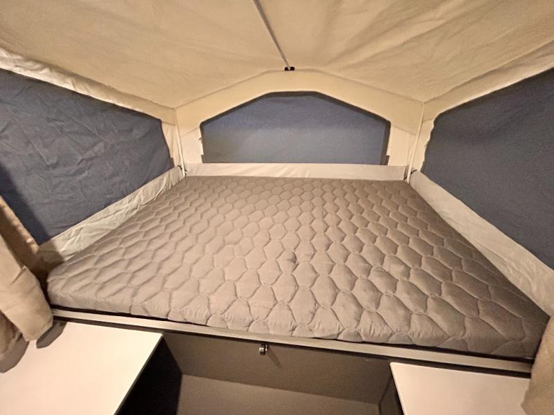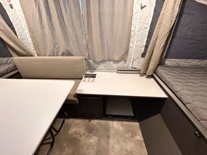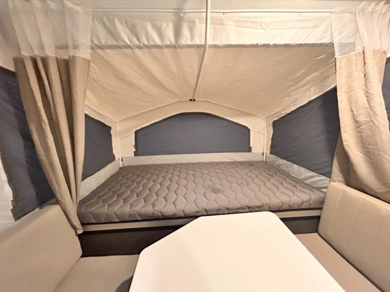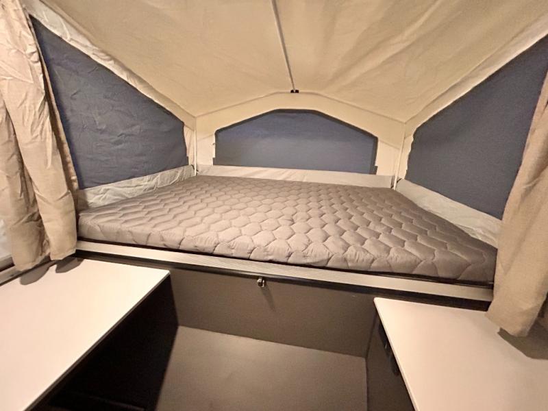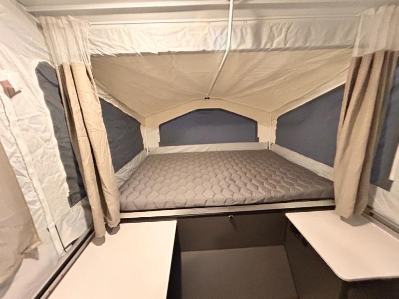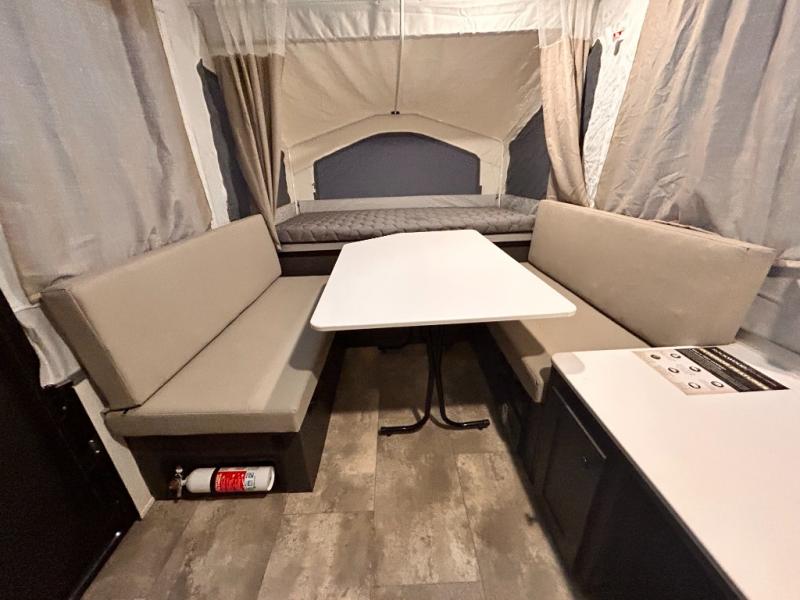 With any Rockwood OTG (Off The Ground) folding pop-up camper by Forest River, you will enjoy a more simple approach to outdoor fun. If you're a regular tent camper, but are looking for a little more comfort, then take a look at these easy-to-tow models! There are electric brakes, 12" radial tires, and Dexter sprung axles that provide that easy towing, and the clay fiberglass exterior is durable. A one-piece screen door also comes standard so you can let fresh air in, while keeping bugs out, and the LED interior lights will be an added benefit you didn't have while tent camping. Each model also includes residential style cabinet doors, wood look flooring, and an Andover Sable wood interior for a more outdoorsy feel!