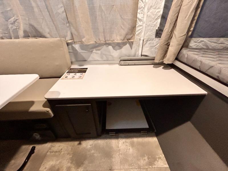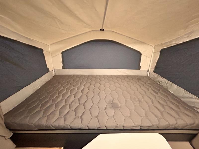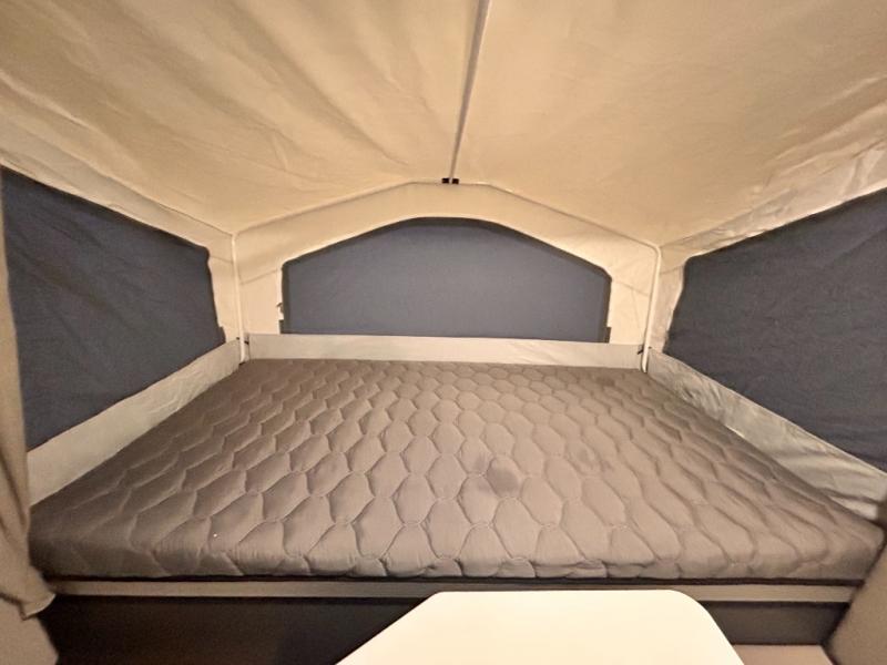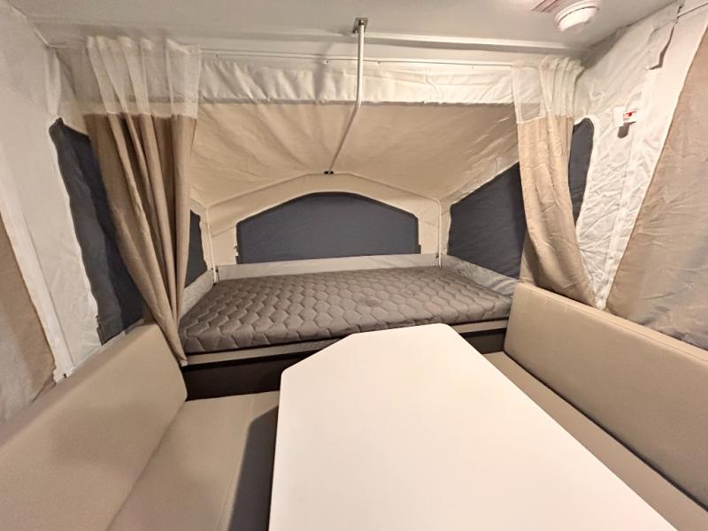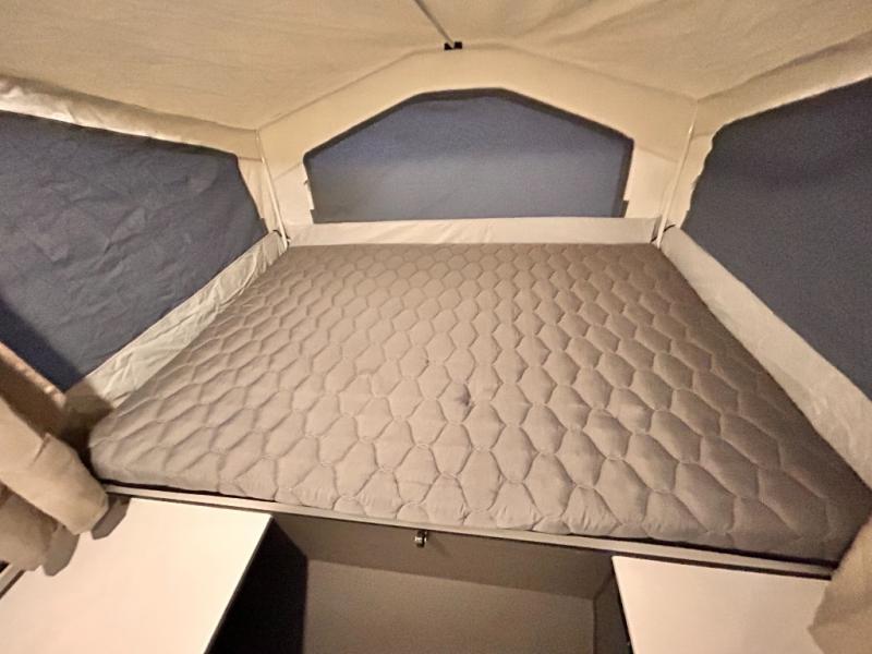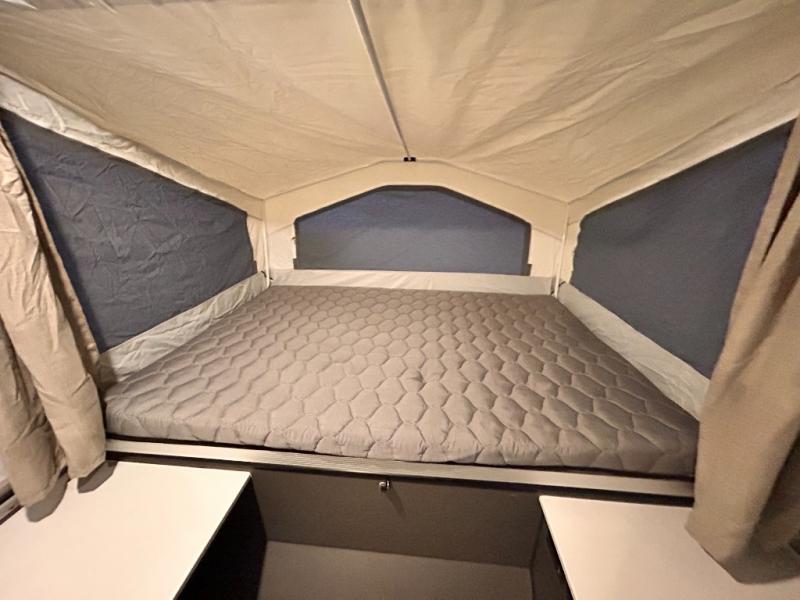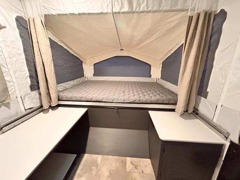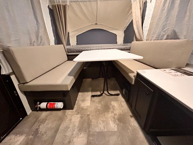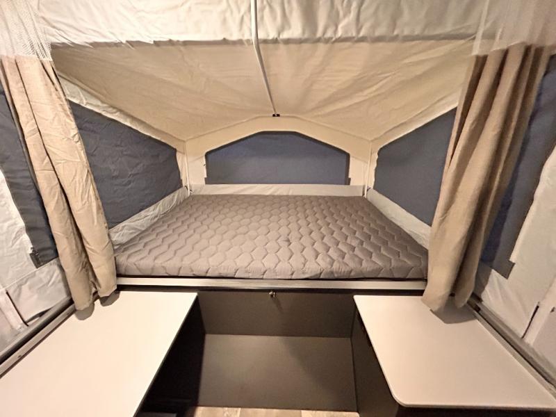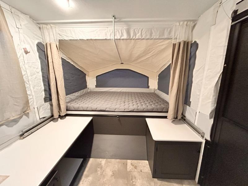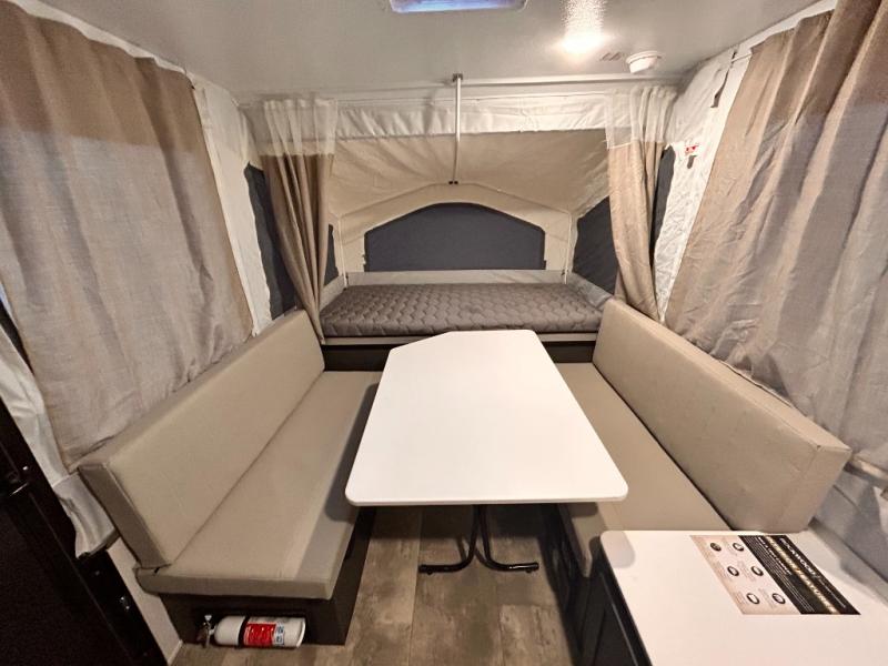 With any Rockwood OTG (Off The Ground) folding pop-up camper by Forest River, you will enjoy a more simple approach to outdoor fun. If you're a regular tent camper, but are looking for a little more comfort, then take a look at these easy-to-tow models! There are electric brakes, 12" radial tires, and Dexter sprung axles that provide that easy towing, and the clay fiberglass exterior is durable. A one-piece screen door also comes standard so you can let fresh air in, while keeping bugs out, and the LED interior lights will be an added benefit you didn't have while tent camping. Each model also includes residential style cabinet doors, wood look flooring, and an Andover Sable wood interior for a more outdoorsy feel!
