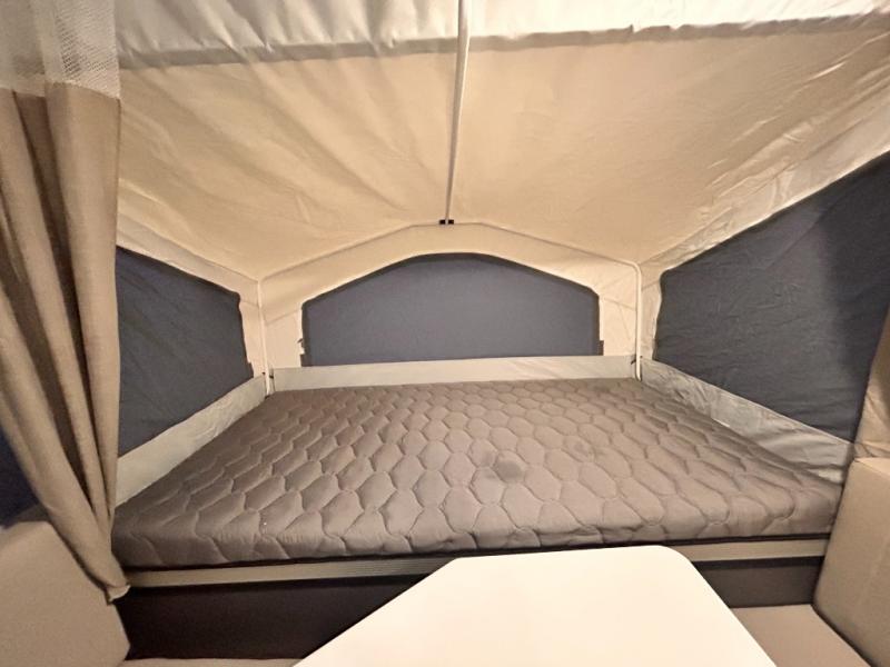 You're going to love camping in this lightweight camper for five to six. There is a 54" x 78" bed and a 42" x 78" bed for cozy sleeping space, and the booth dinette can even be transformed into another bed at night if you need it. You will also appreciate the quilted mattress for added comfort and privacy curtains when you need to change at night.