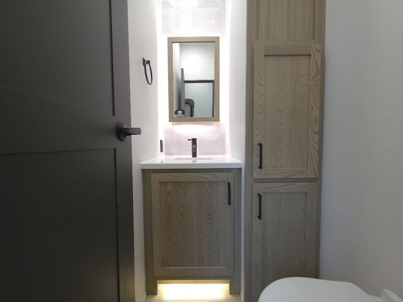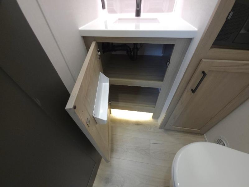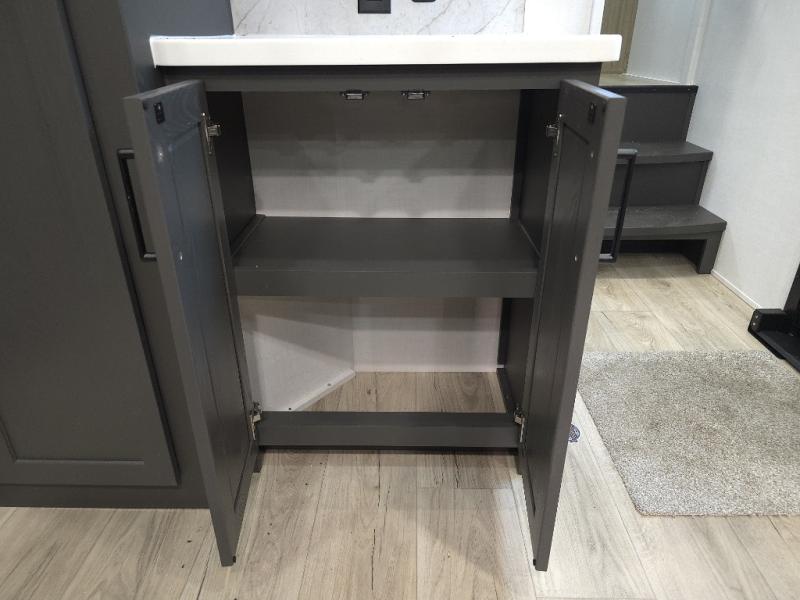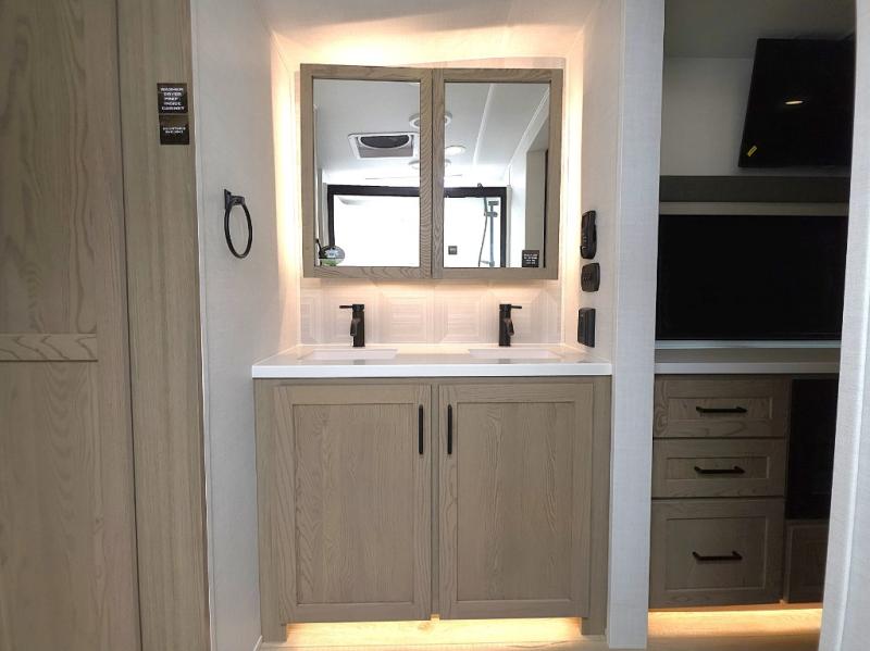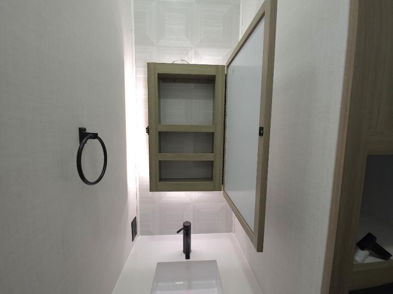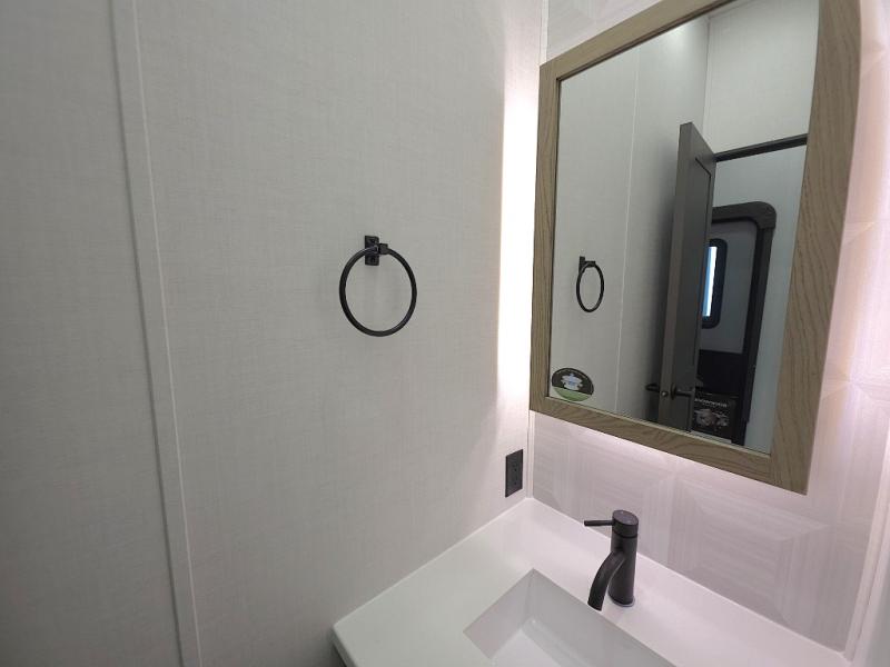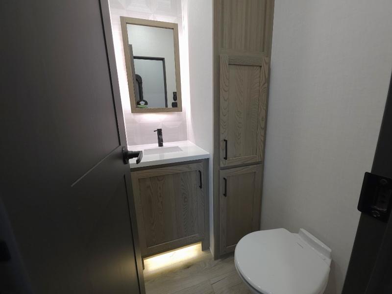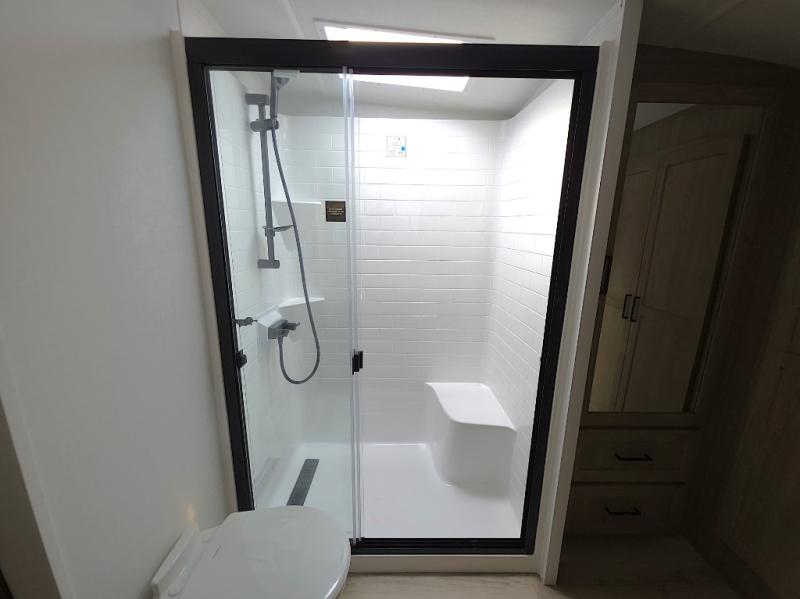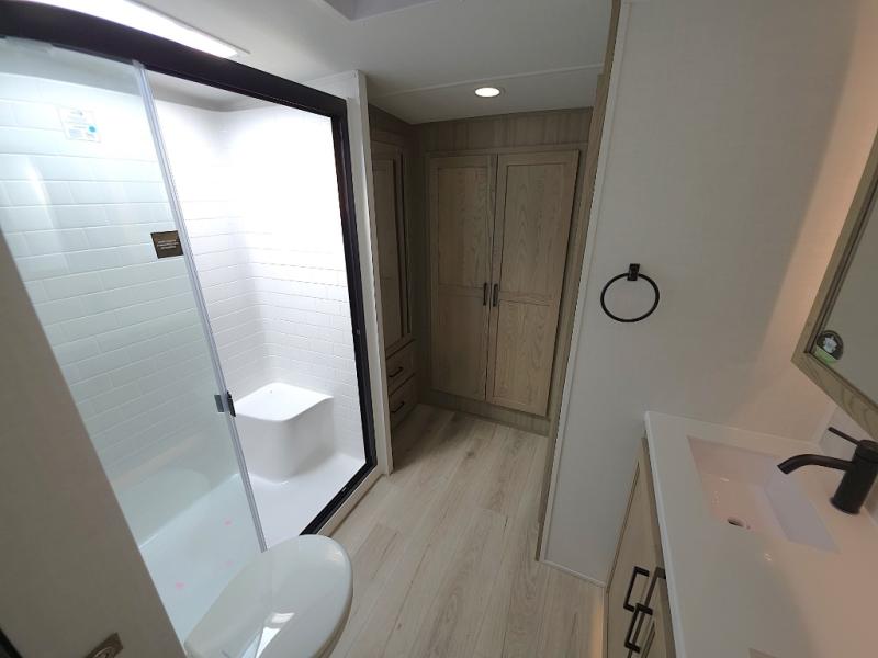 The front master bathroom includes a shower seat for easy accessibility and a spa-like experience, while the half bath near the entrance adds extra convenience—ideal for guests or quick use during travel days.
