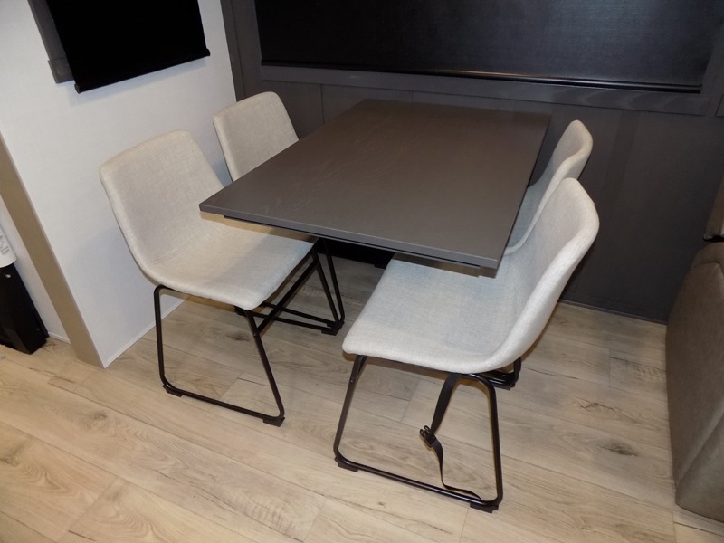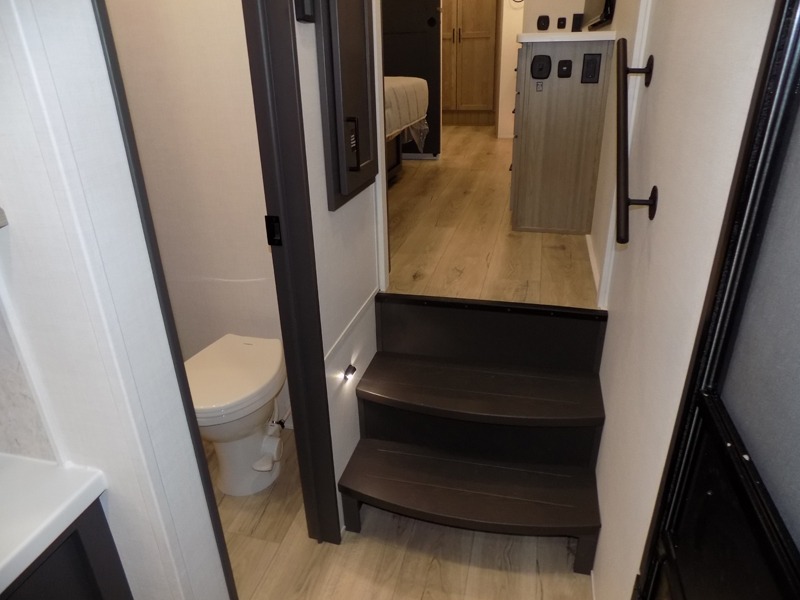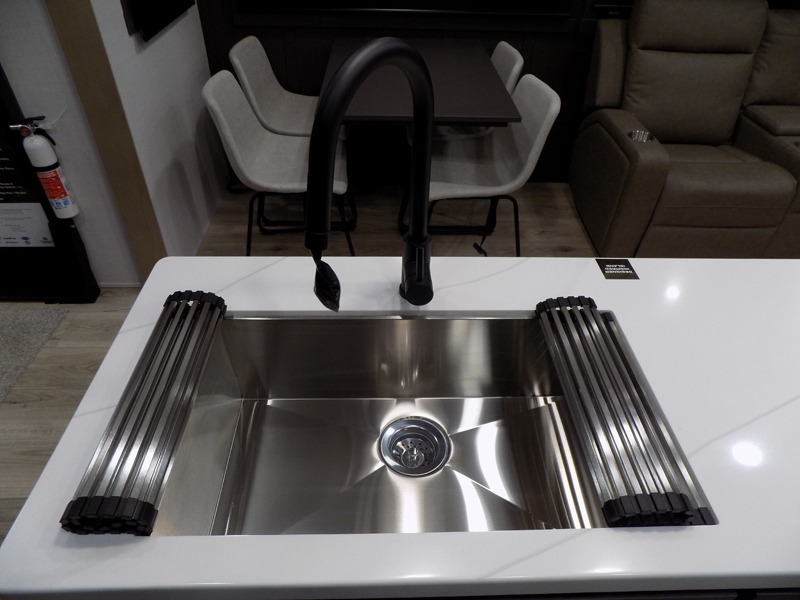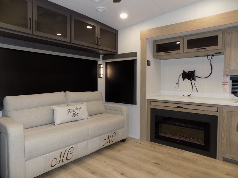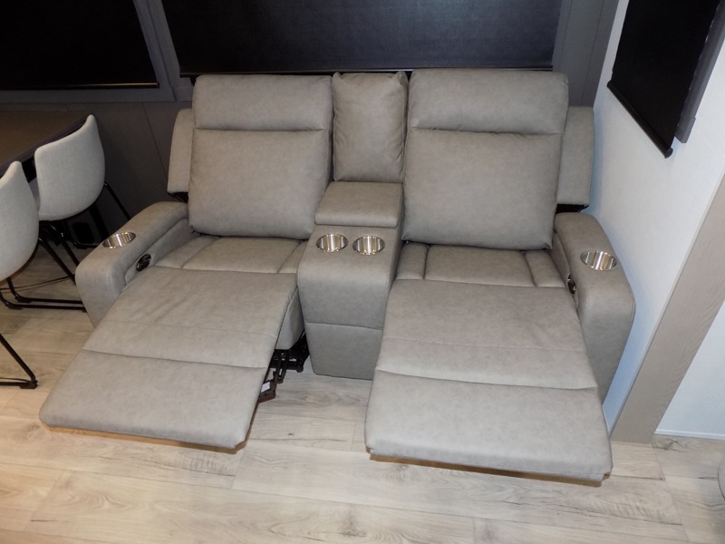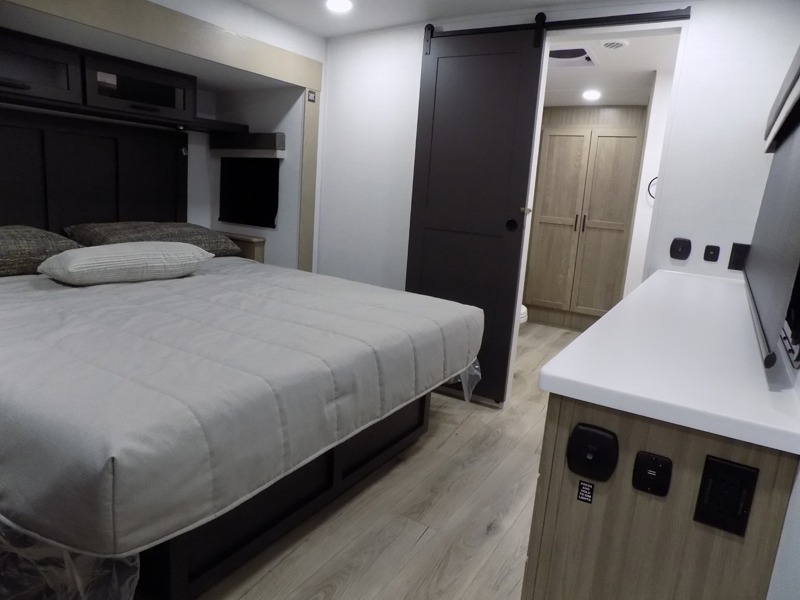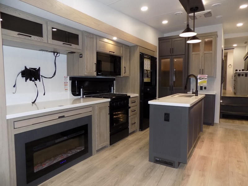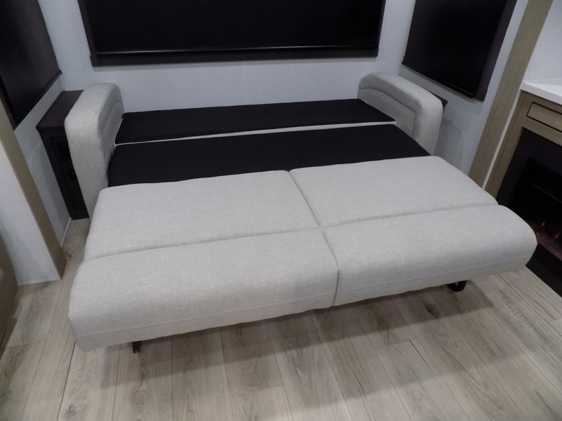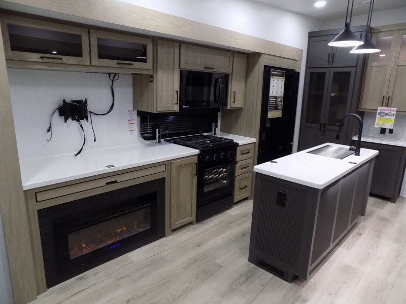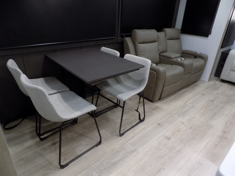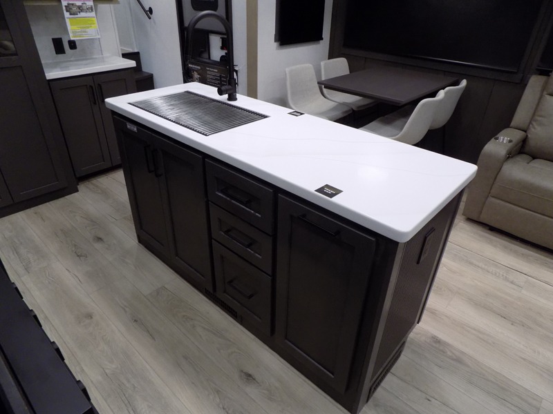 This well-designed layout offers both comfort and functionality. The 72" x 80" king bed provides a spacious and restful sleeping area in the main bedroom. Just steps away, the full front bathroom includes a shower seat for added accessibility, while a convenient half bath near the entrance is perfect for quick use. The kitchen features solid surface countertops and a large island, giving the cook plenty of room to move and work comfortably, along with a rotating table and chairs for dinner and board games. A pull-out desk creates a dedicated space for working away from home, and the 76" hide-a-bed adds extra sleeping space for the whole gang.