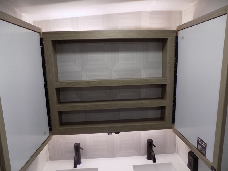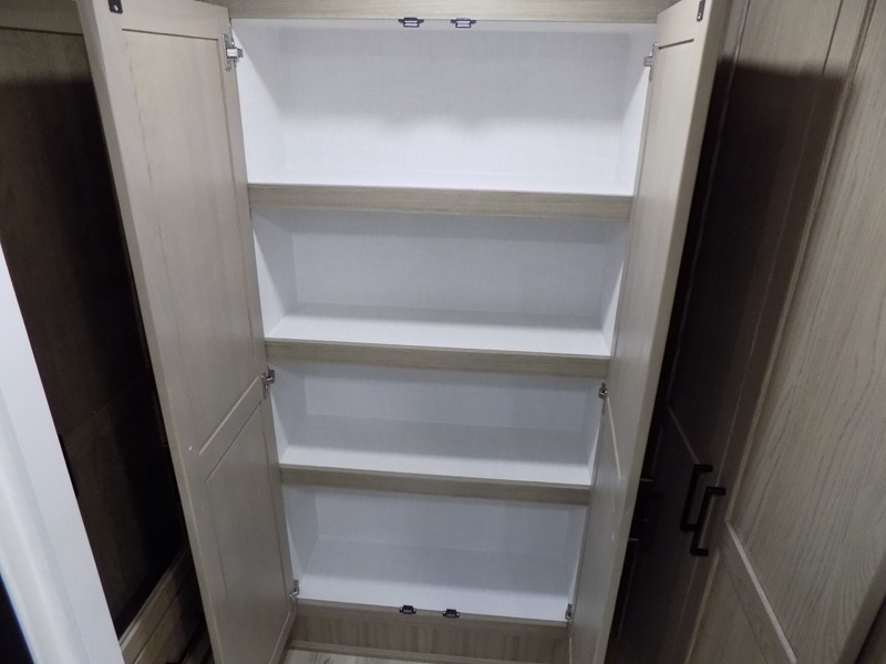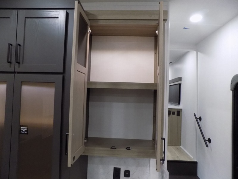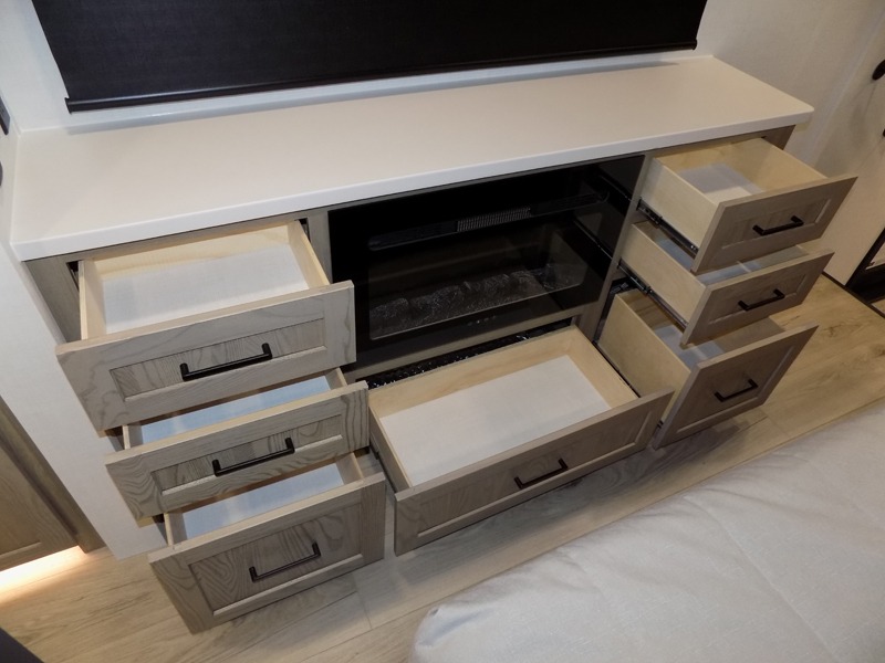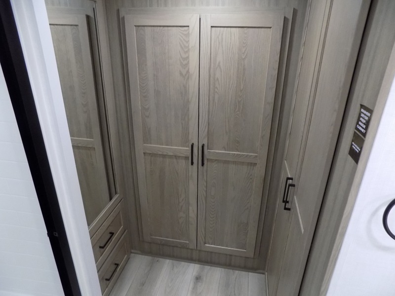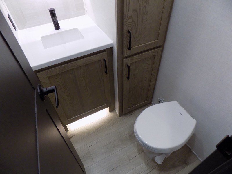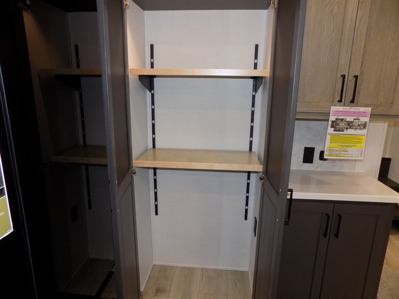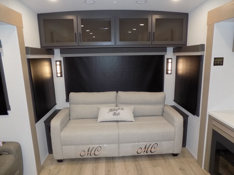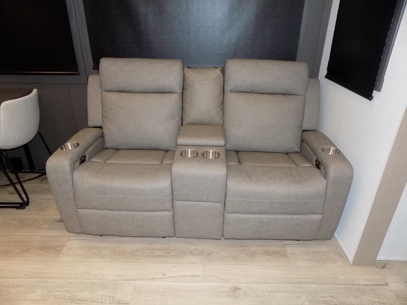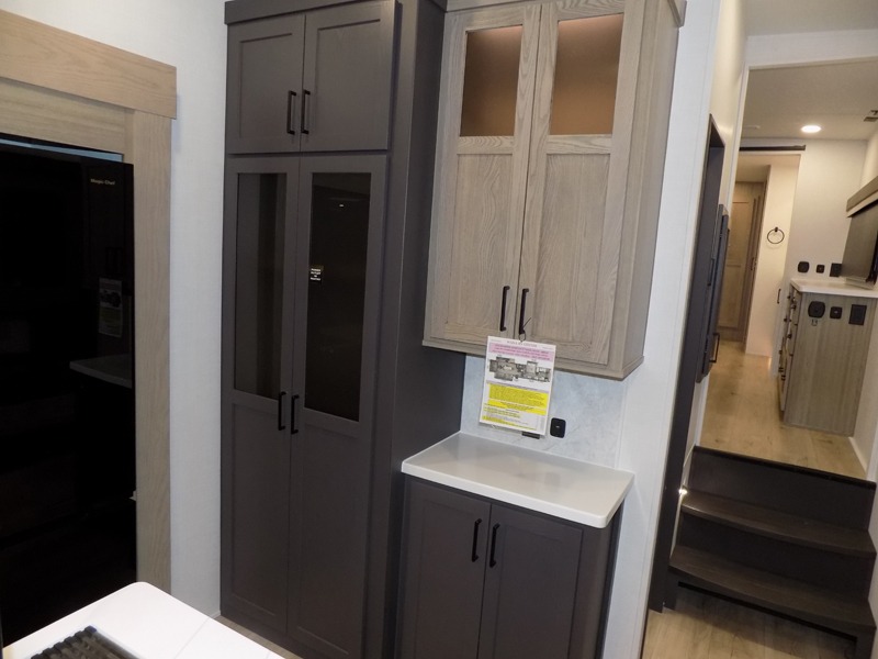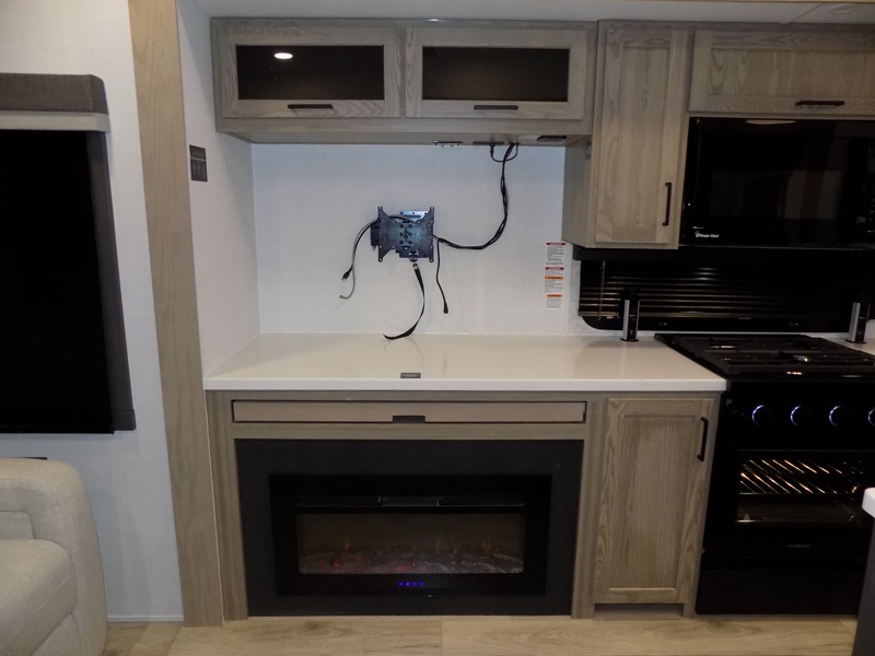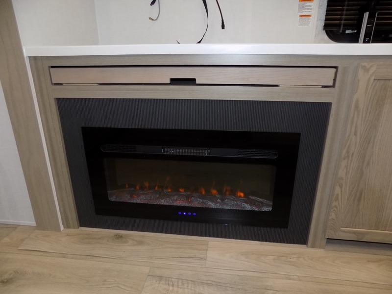 This well-designed layout offers both comfort and functionality. The 72" x 80" king bed provides a spacious and restful sleeping area in the main bedroom. Just steps away, the full front bathroom includes a shower seat for added accessibility, while a convenient half bath near the entrance is perfect for quick use. The kitchen features solid surface countertops and a large island, giving the cook plenty of room to move and work comfortably, along with a rotating table and chairs for dinner and board games. A pull-out desk creates a dedicated space for working away from home, and the 76" hide-a-bed adds extra sleeping space for the whole gang.