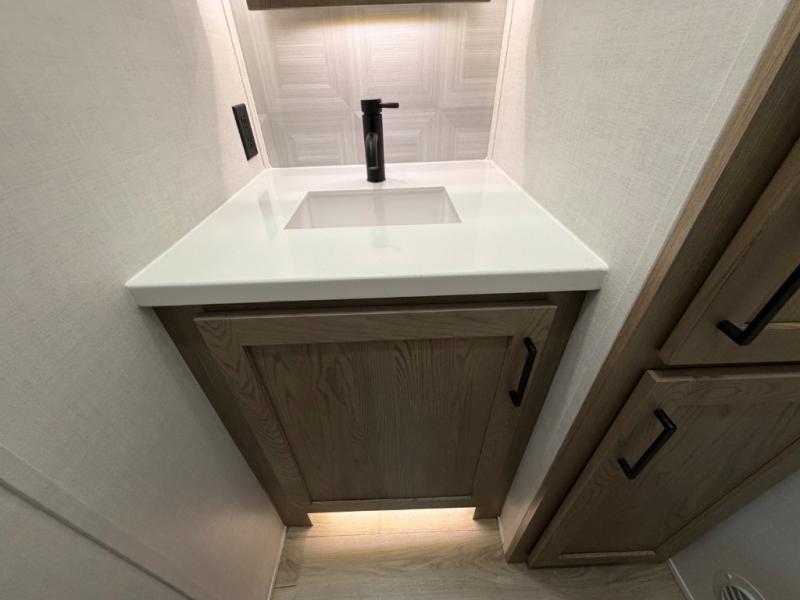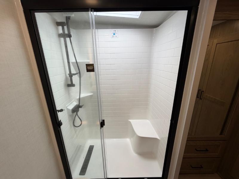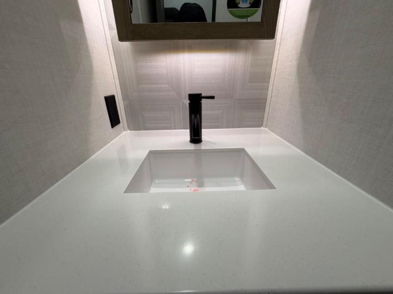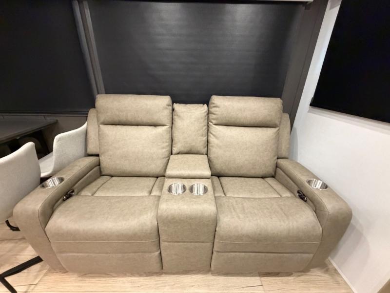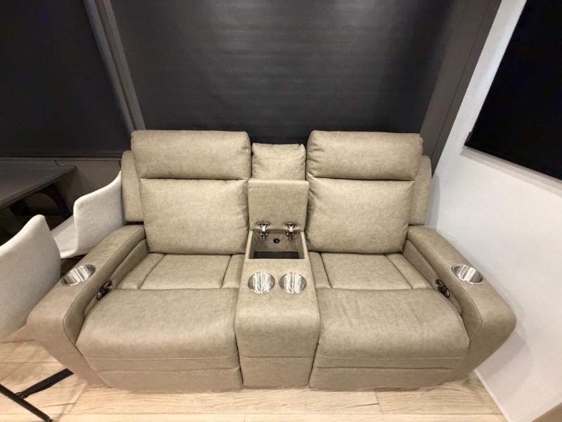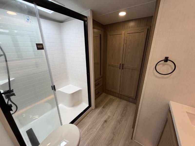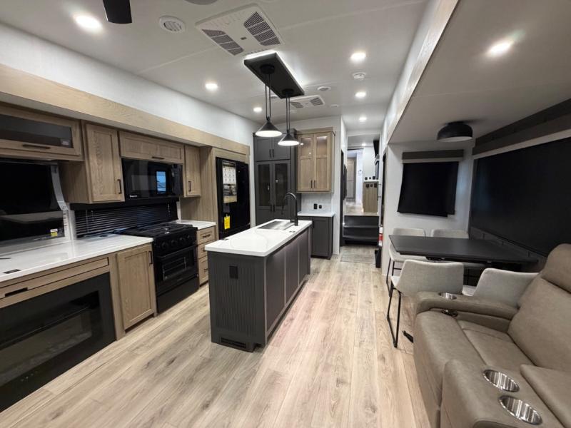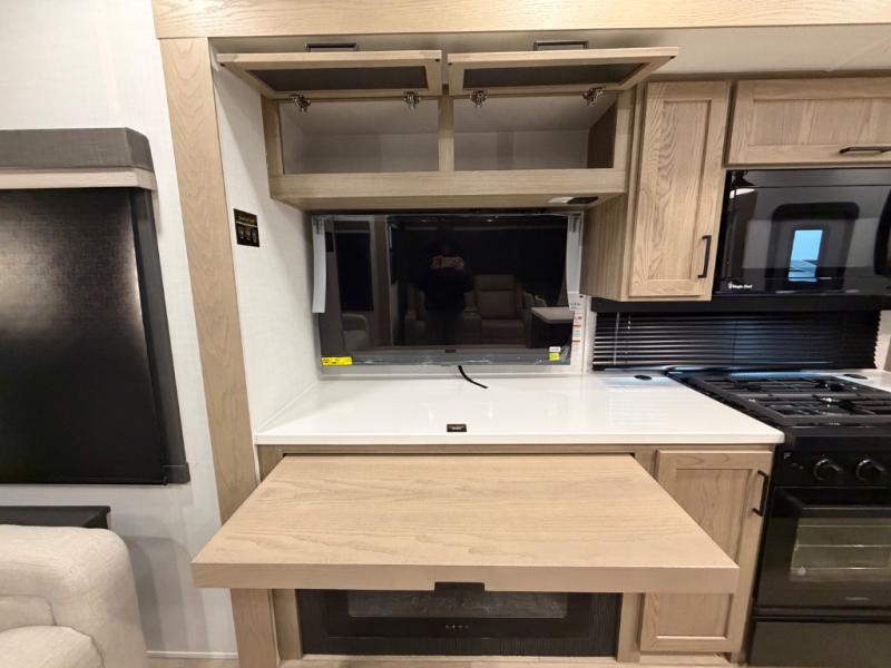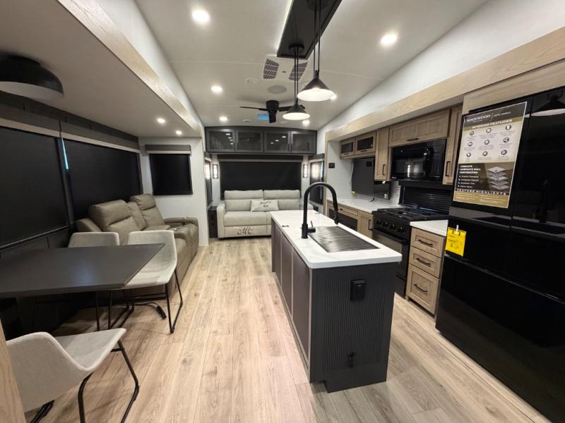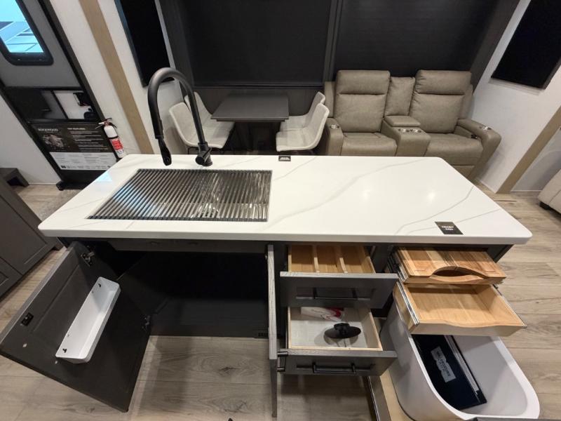 This well-designed layout offers both comfort and functionality. The 72" x 80" king bed provides a spacious and restful sleeping area in the main bedroom. Just steps away, the full front bathroom includes a shower seat for added accessibility, while a convenient half bath near the entrance is perfect for quick use. The kitchen features solid surface countertops and a large island, giving the cook plenty of room to move and work comfortably, along with a rotating table and chairs for dinner and board games. A pull-out desk creates a dedicated space for working away from home, and the 76" hide-a-bed adds extra sleeping space for the whole gang.
