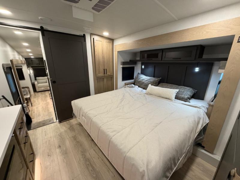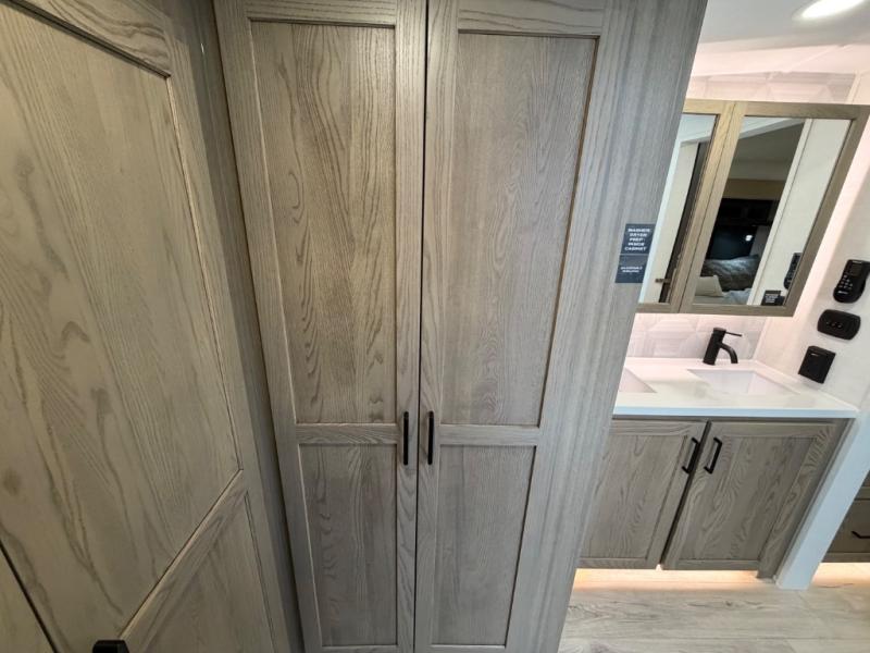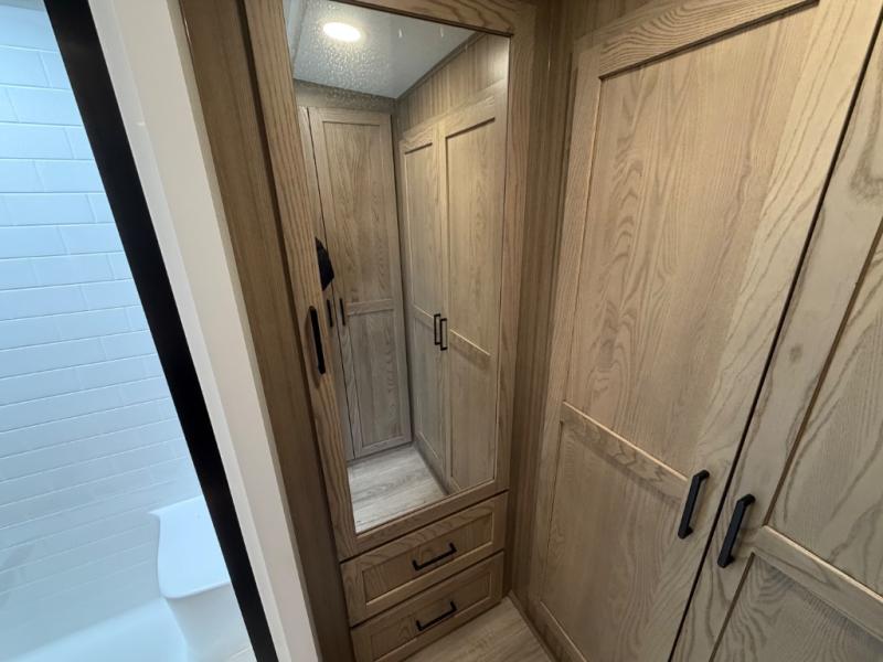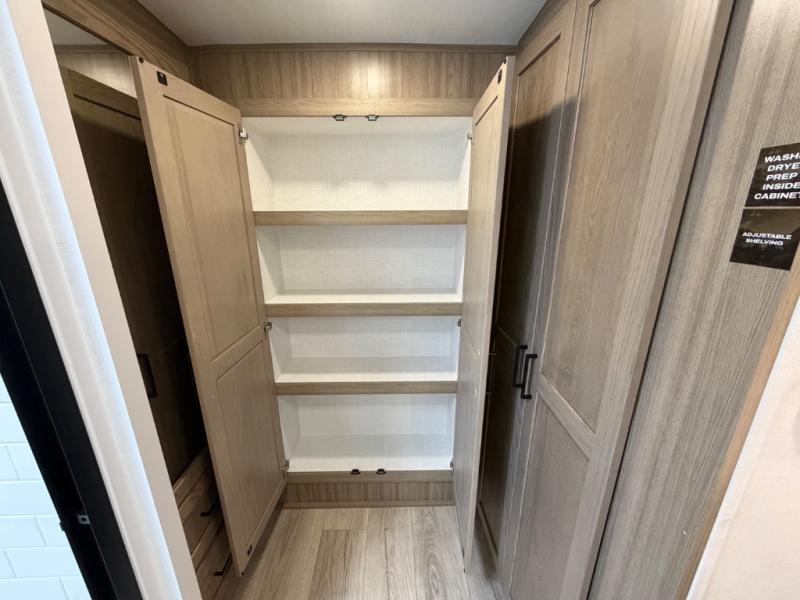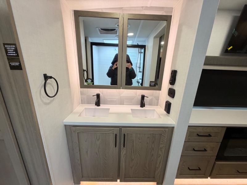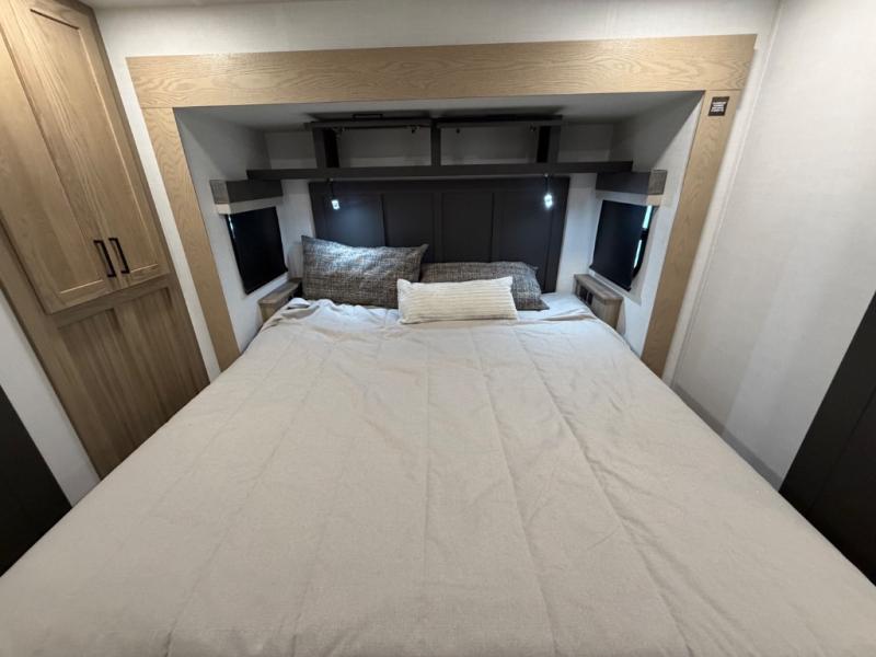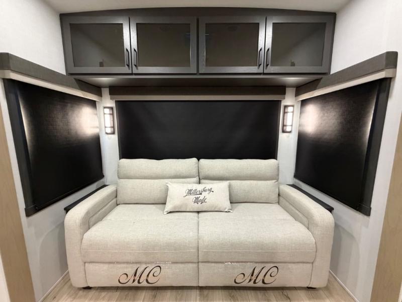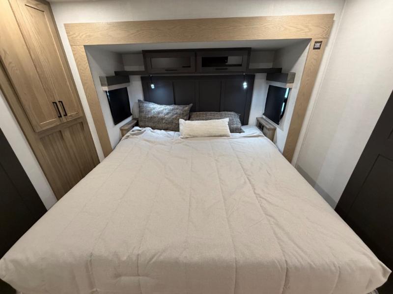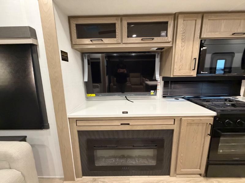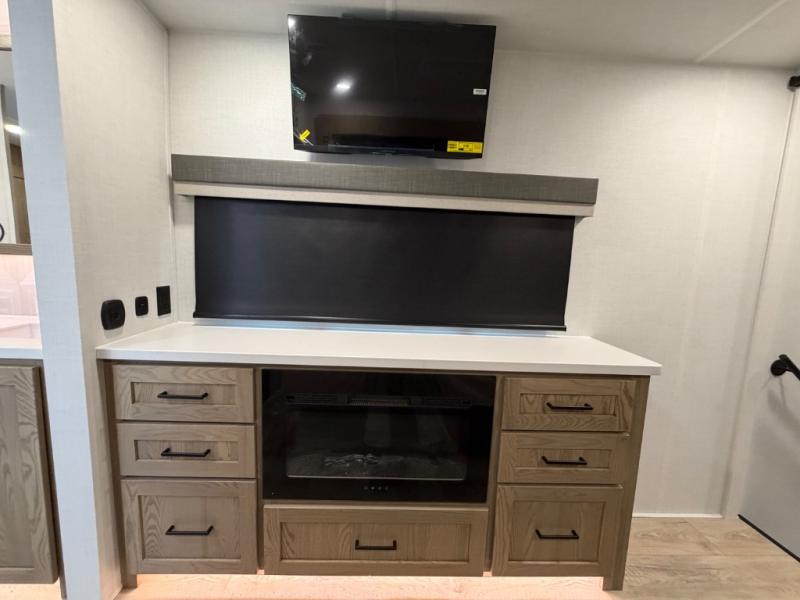 This well-designed layout offers both comfort and functionality. The 72" x 80" king bed provides a spacious and restful sleeping area in the main bedroom. Just steps away, the full front bathroom includes a shower seat for added accessibility, while a convenient half bath near the entrance is perfect for quick use. The kitchen features solid surface countertops and a large island, giving the cook plenty of room to move and work comfortably, along with a rotating table and chairs for dinner and board games. A pull-out desk creates a dedicated space for working away from home, and the 76" hide-a-bed adds extra sleeping space for the whole gang.