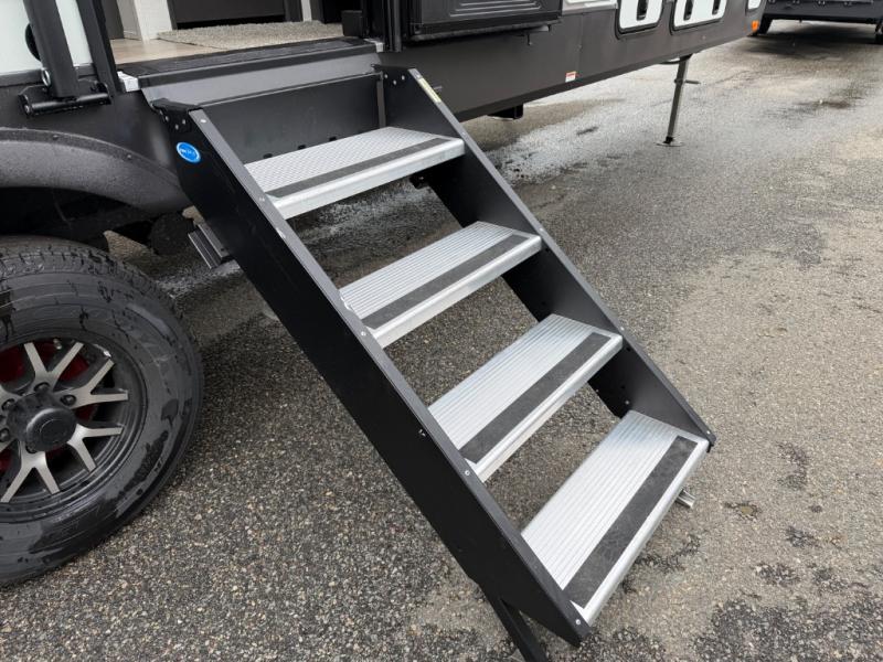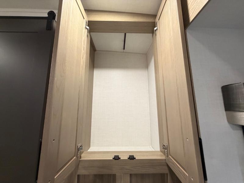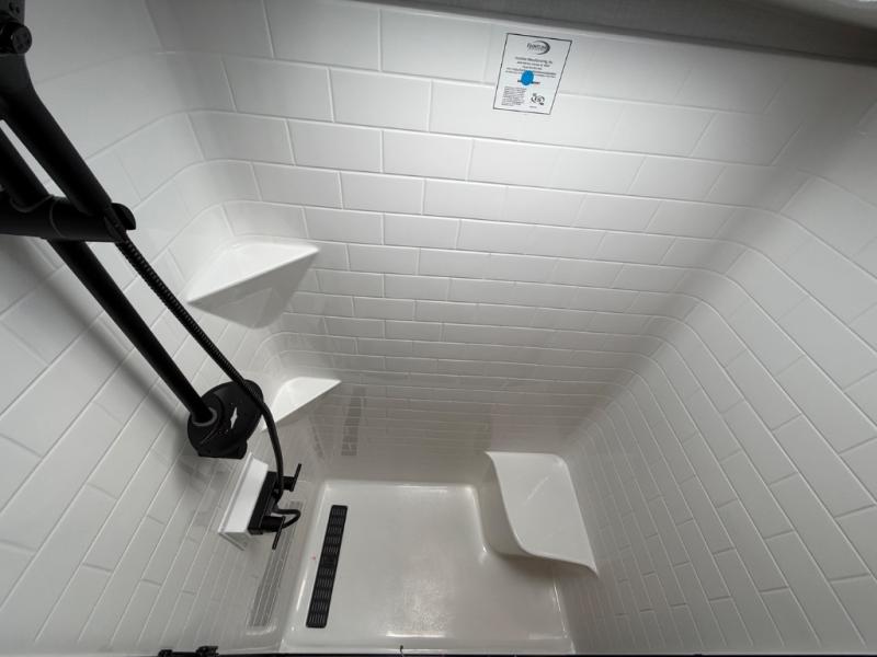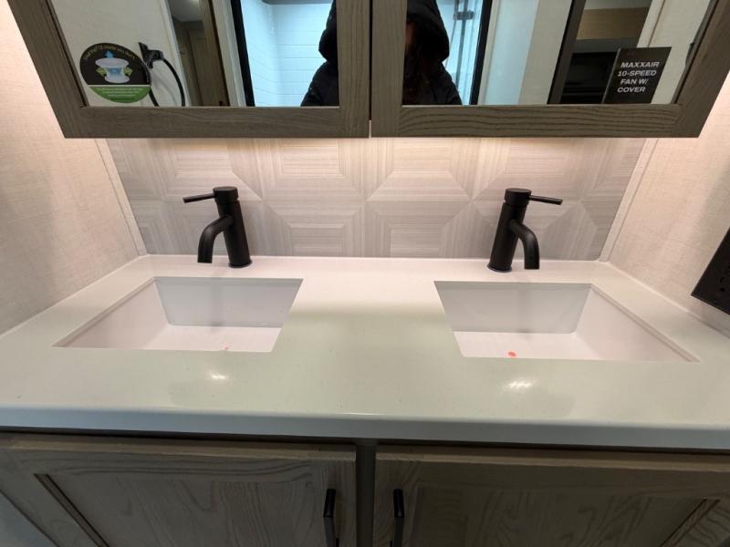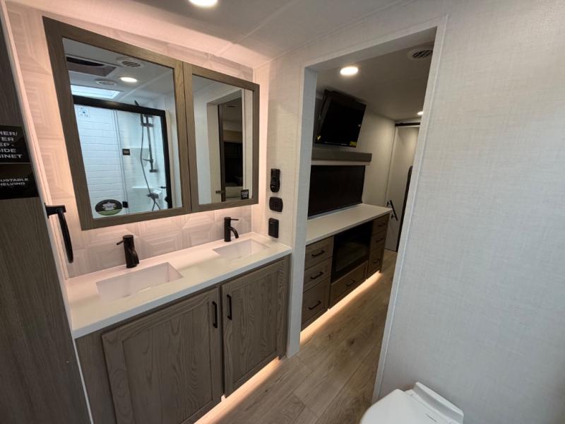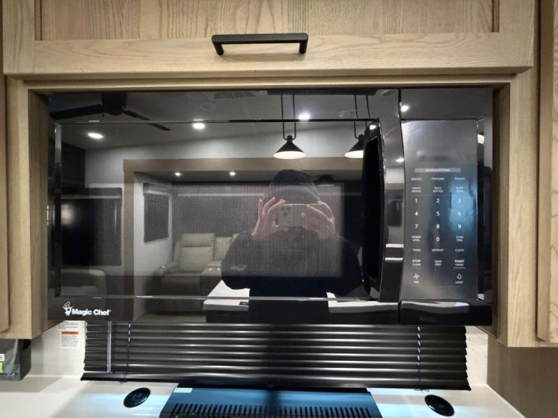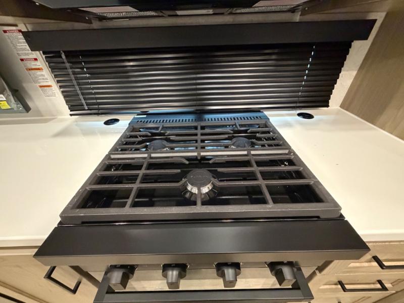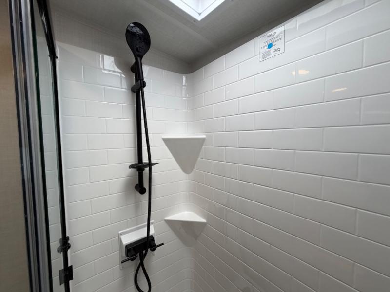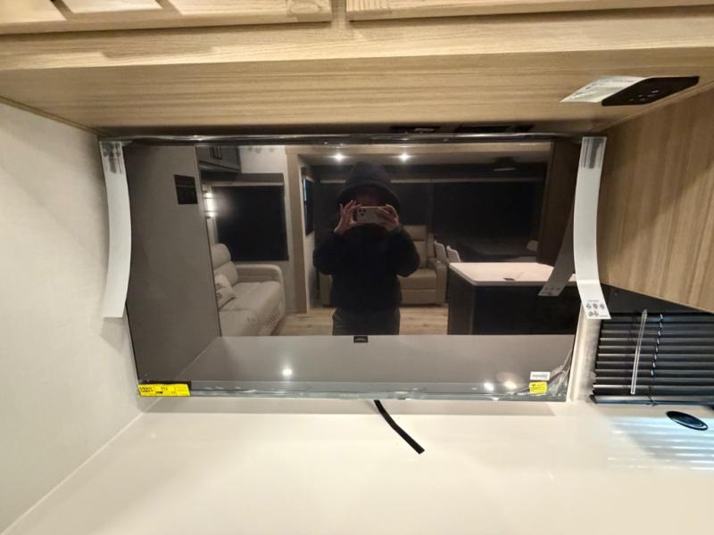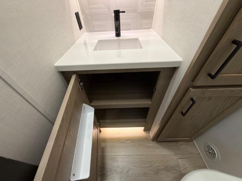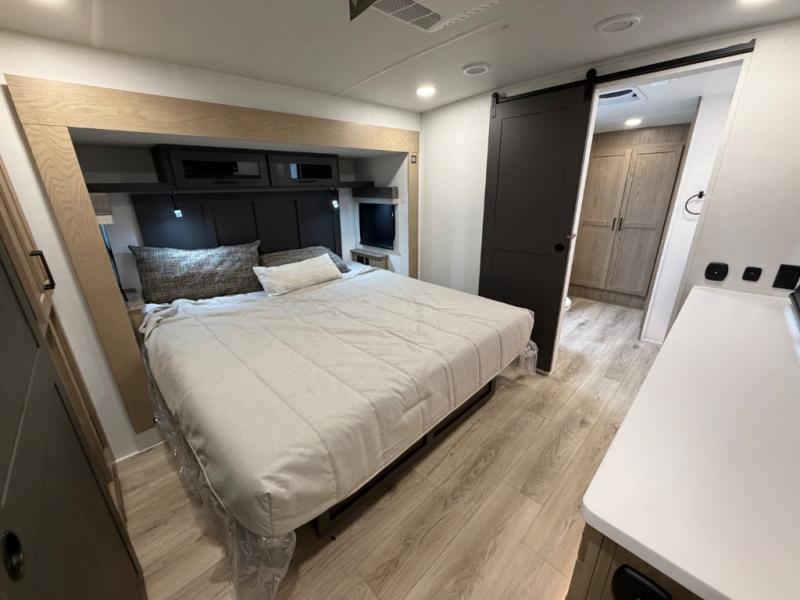 This well-designed layout offers both comfort and functionality. The 72" x 80" king bed provides a spacious and restful sleeping area in the main bedroom. Just steps away, the full front bathroom includes a shower seat for added accessibility, while a convenient half bath near the entrance is perfect for quick use. The kitchen features solid surface countertops and a large island, giving the cook plenty of room to move and work comfortably, along with a rotating table and chairs for dinner and board games. A pull-out desk creates a dedicated space for working away from home, and the 76" hide-a-bed adds extra sleeping space for the whole gang.