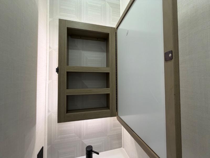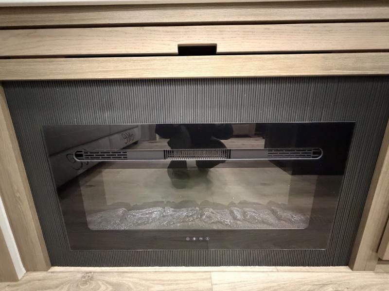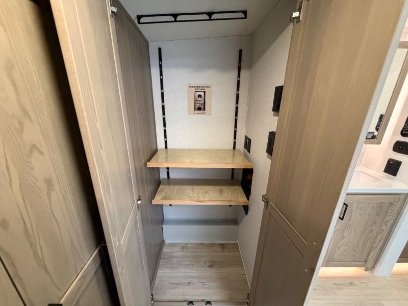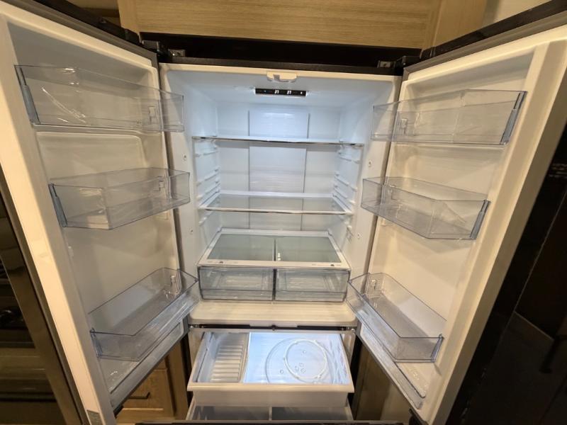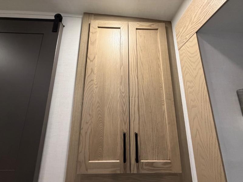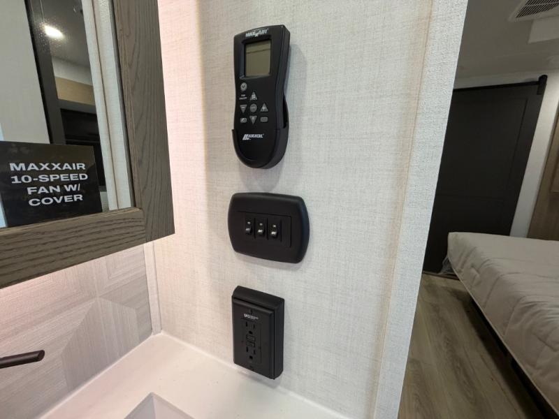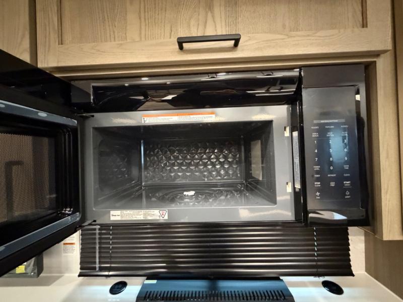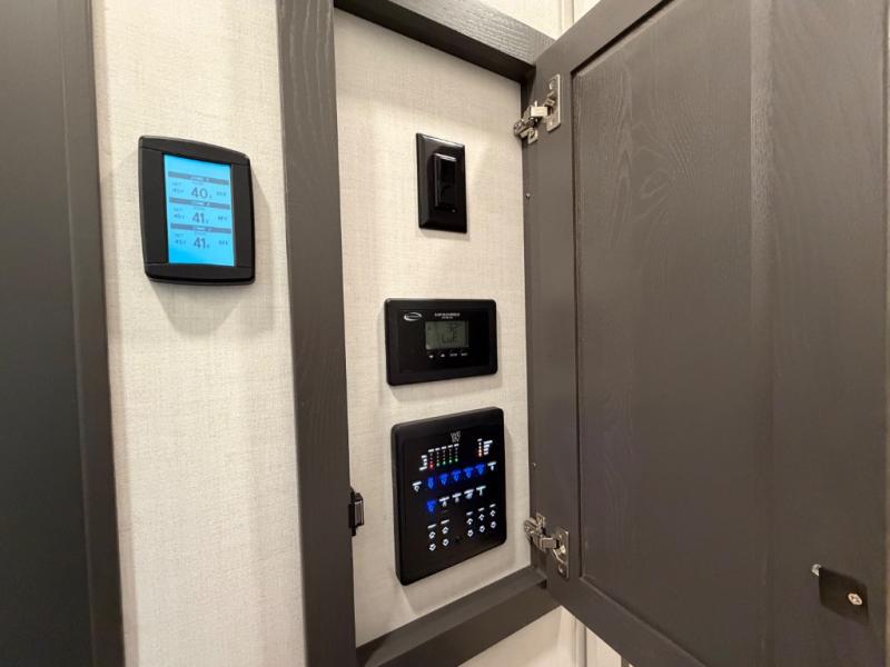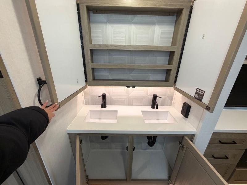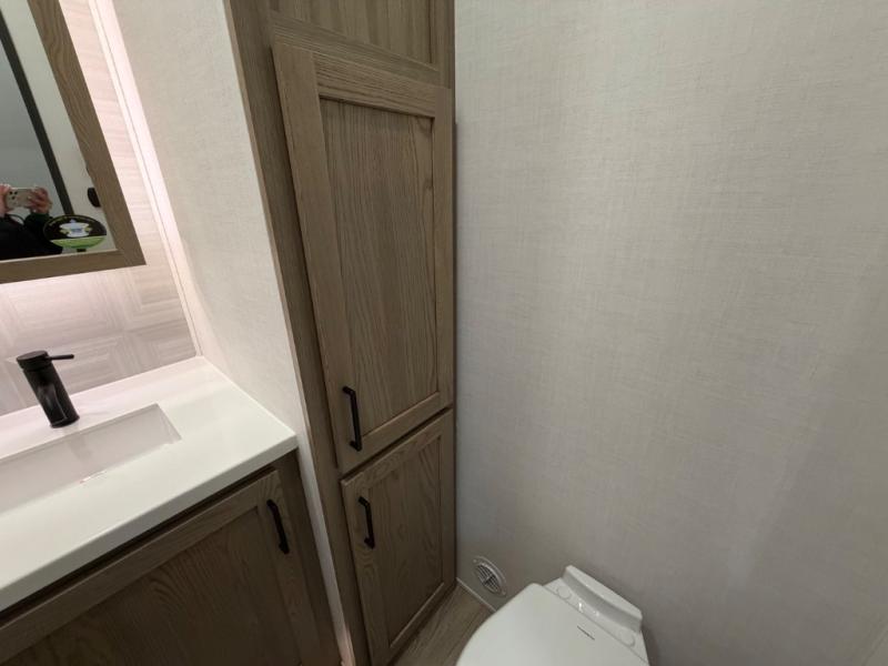This well-designed layout offers both comfort and functionality. The 72" x 80" king bed provides a spacious and restful sleeping area in the main bedroom. Just steps away, the full front bathroom includes a shower seat for added accessibility, while a convenient half bath near the entrance is perfect for quick use. The kitchen features solid surface countertops and a large island, giving the cook plenty of room to move and work comfortably, along with a rotating table and chairs for dinner and board games. A pull-out desk creates a dedicated space for working away from home, and the 76" hide-a-bed adds extra sleeping space for the whole gang.