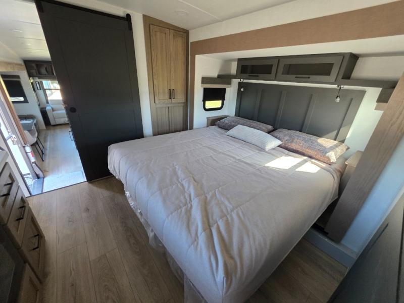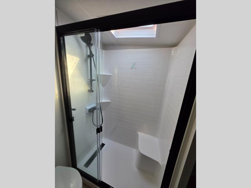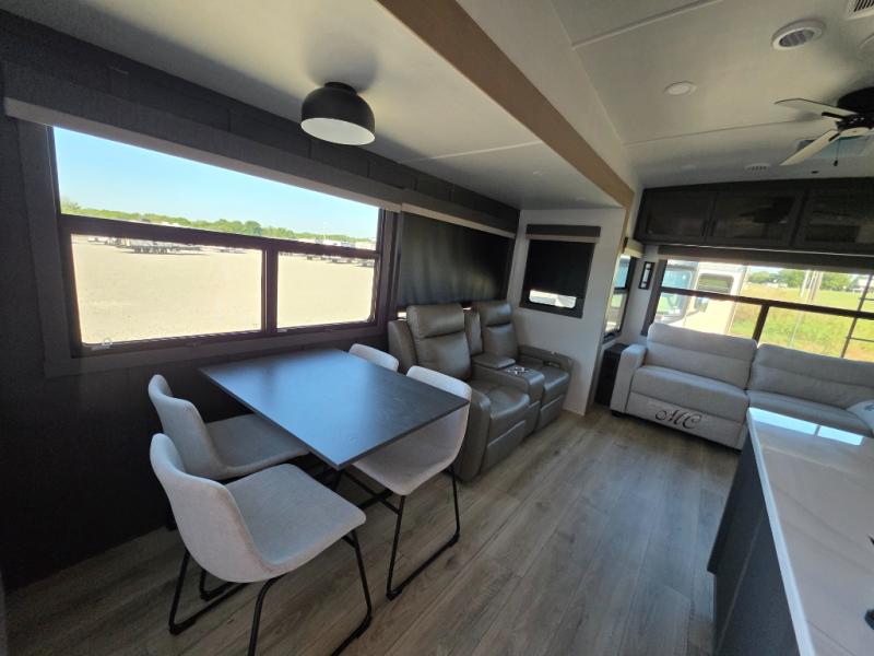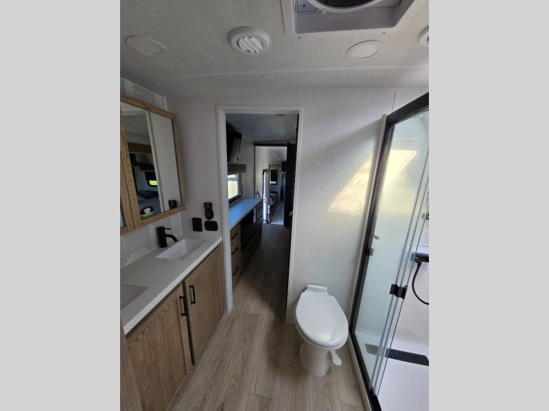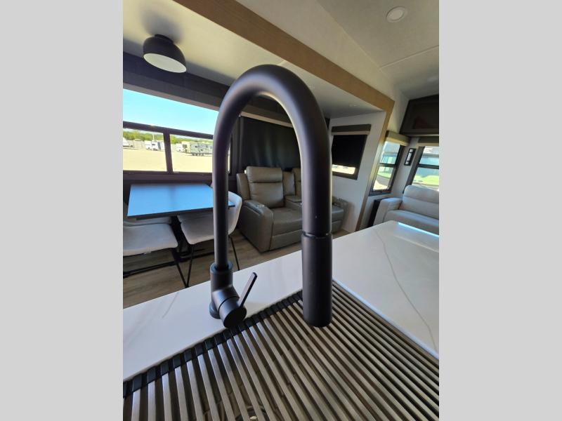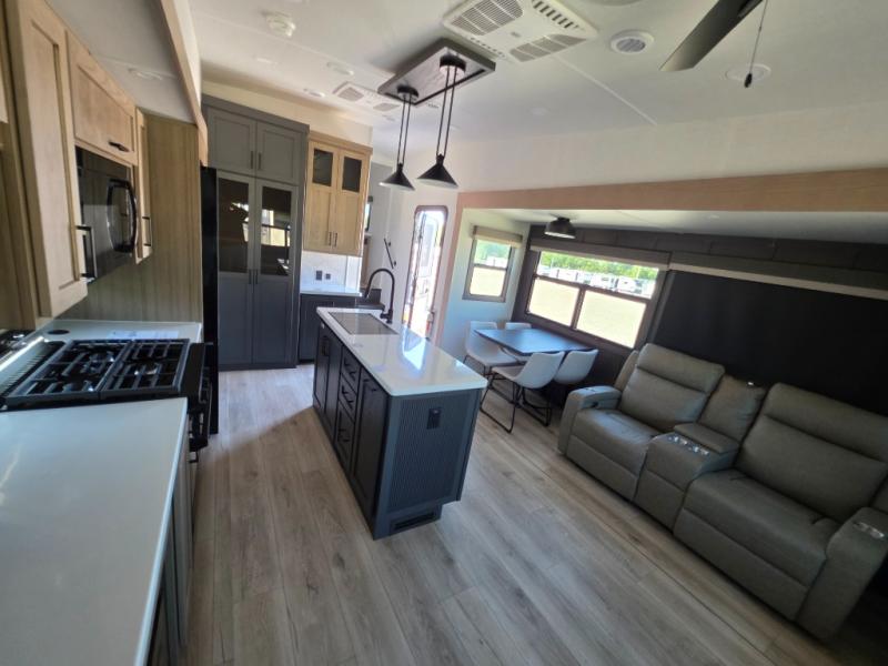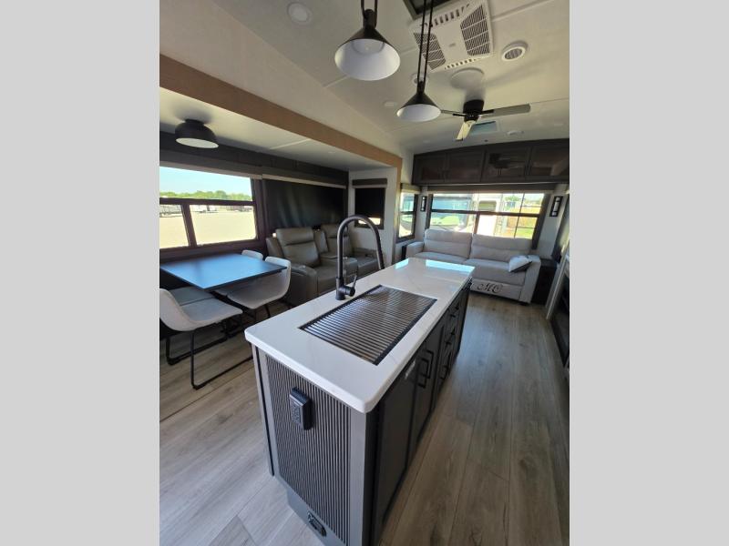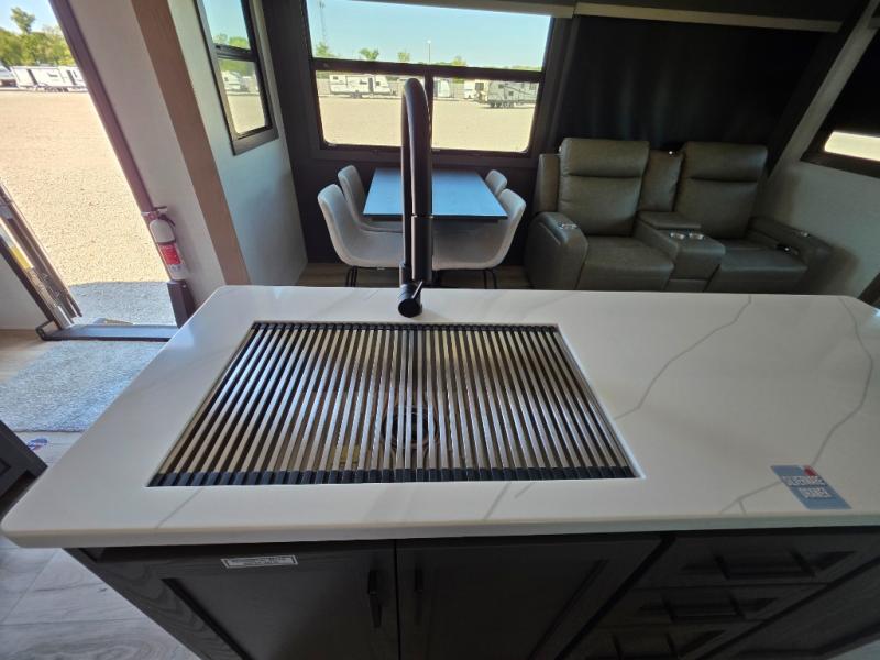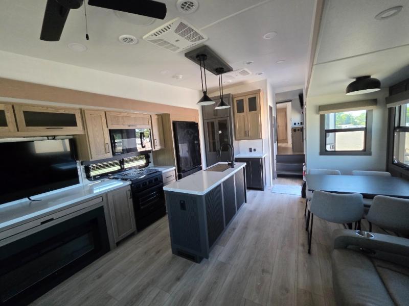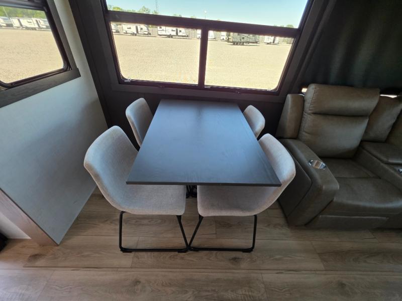 This well-designed layout offers both comfort and functionality. The 72" x 80" king bed provides a spacious and restful sleeping area in the main bedroom. Just steps away, the full front bathroom includes a shower seat for added accessibility, while a convenient half bath near the entrance is perfect for quick use. The kitchen features solid surface countertops and a large island, giving the cook plenty of room to move and work comfortably, along with a rotating table and chairs for dinner and board games. A pull-out desk creates a dedicated space for working away from home, and the 76" hide-a-bed adds extra sleeping space for the whole gang.