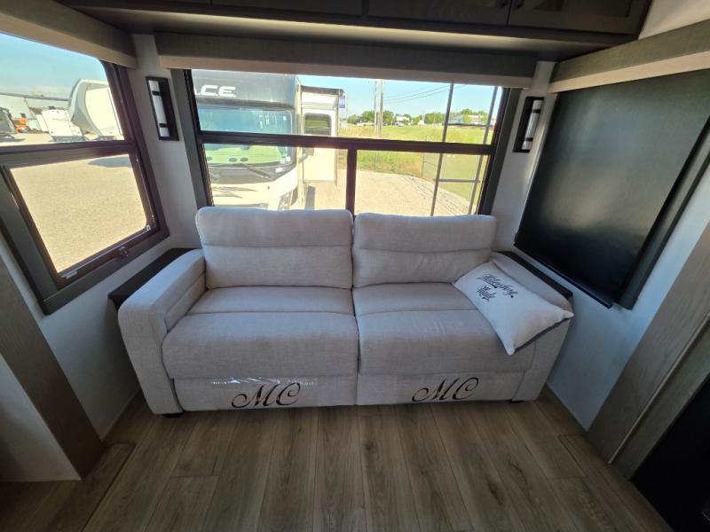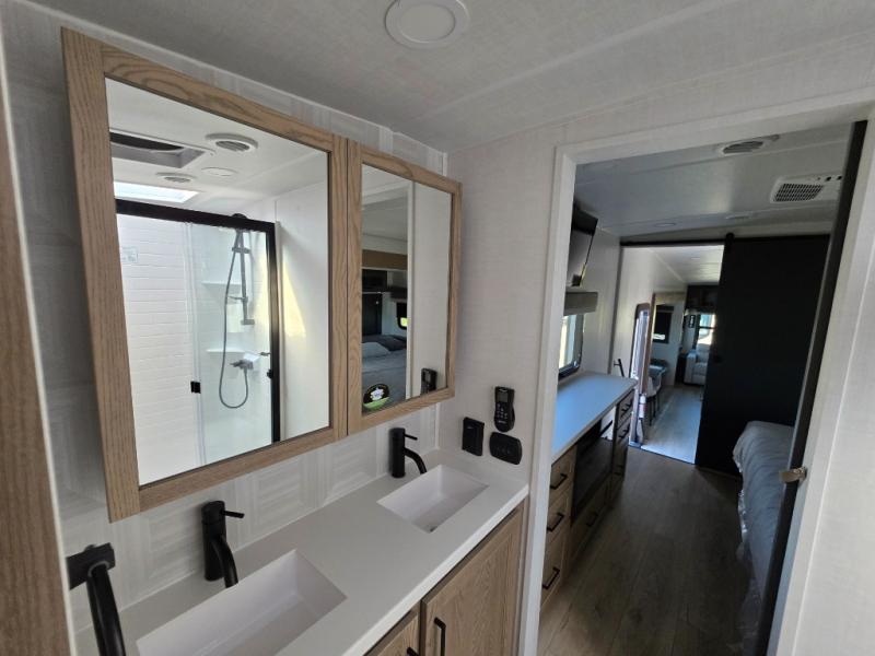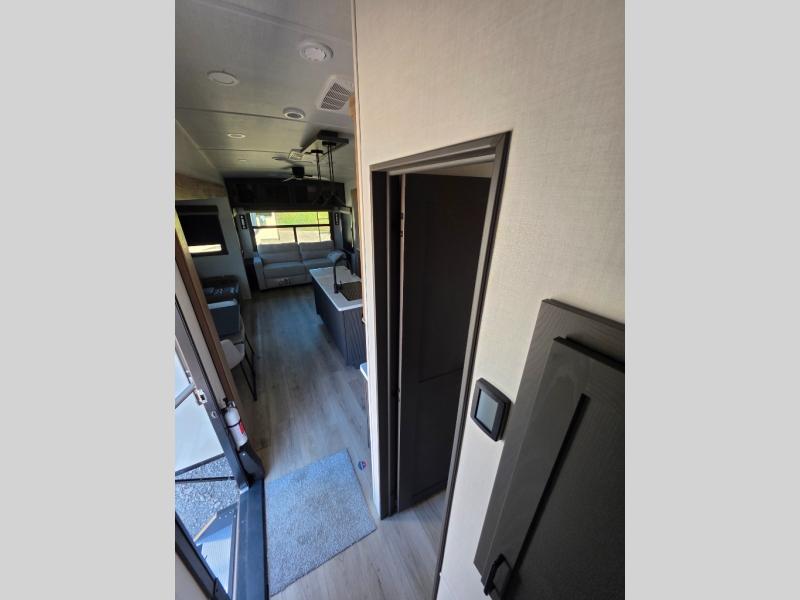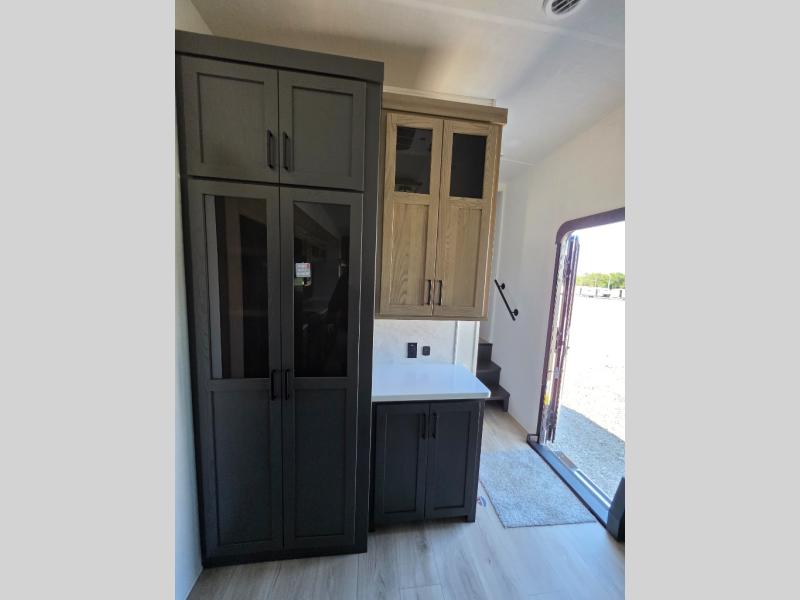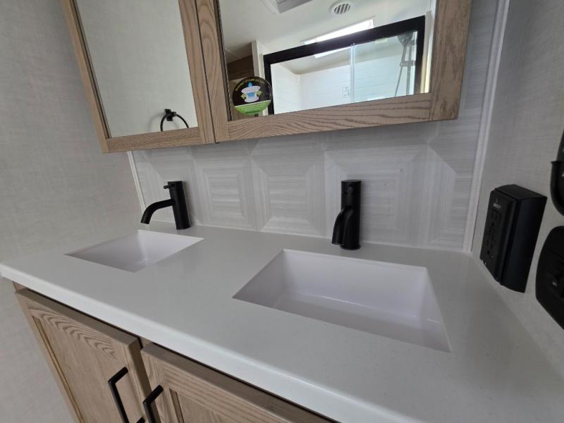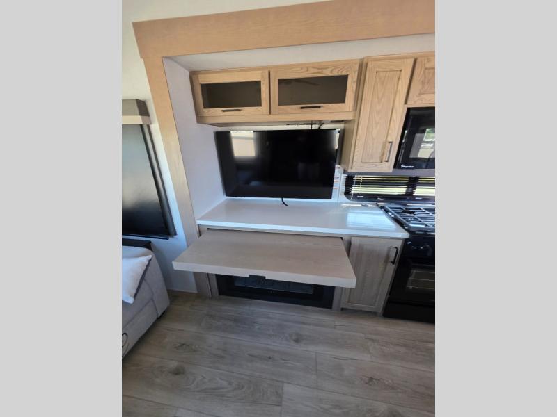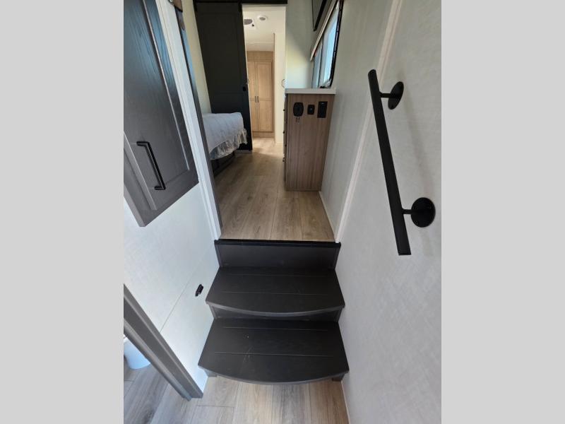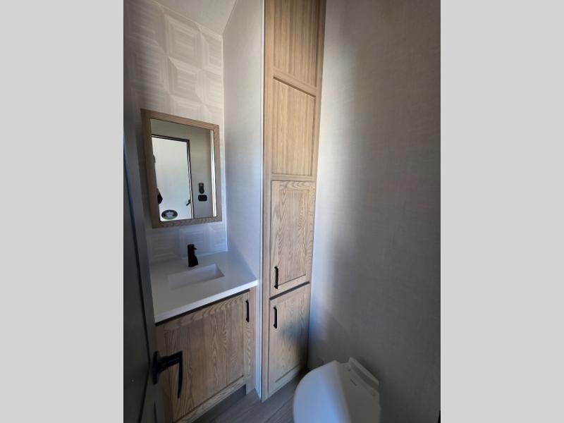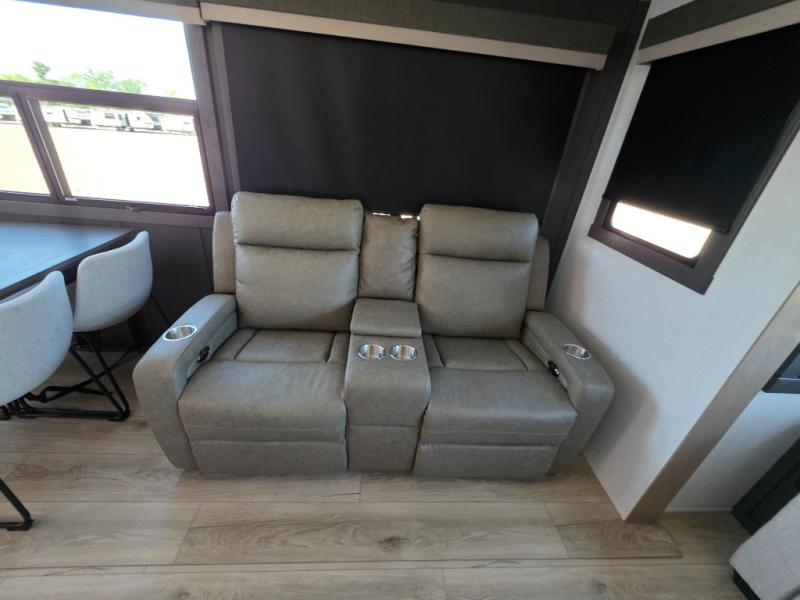 This well-designed layout offers both comfort and functionality. The 72" x 80" king bed provides a spacious and restful sleeping area in the main bedroom. Just steps away, the full front bathroom includes a shower seat for added accessibility, while a convenient half bath near the entrance is perfect for quick use. The kitchen features solid surface countertops and a large island, giving the cook plenty of room to move and work comfortably, along with a rotating table and chairs for dinner and board games. A pull-out desk creates a dedicated space for working away from home, and the 76" hide-a-bed adds extra sleeping space for the whole gang.