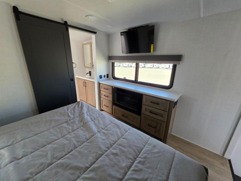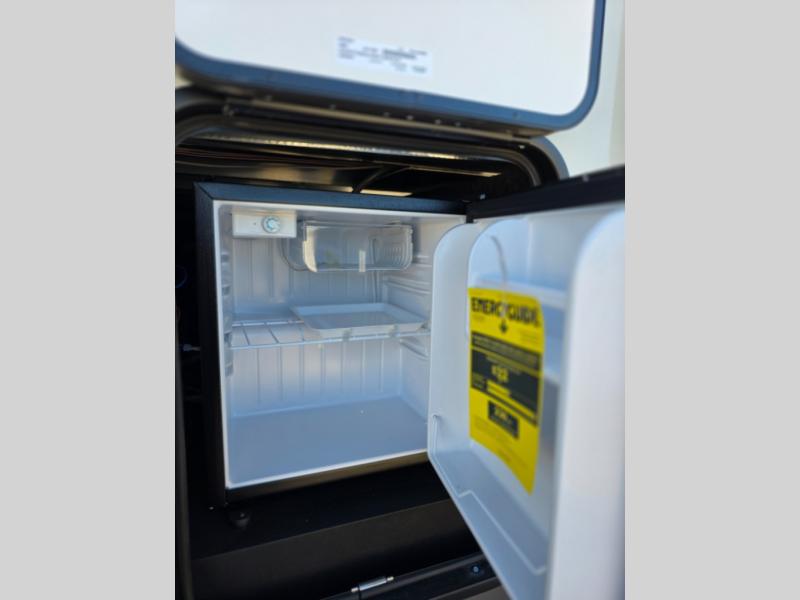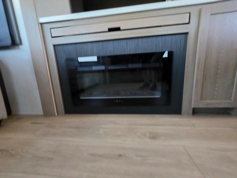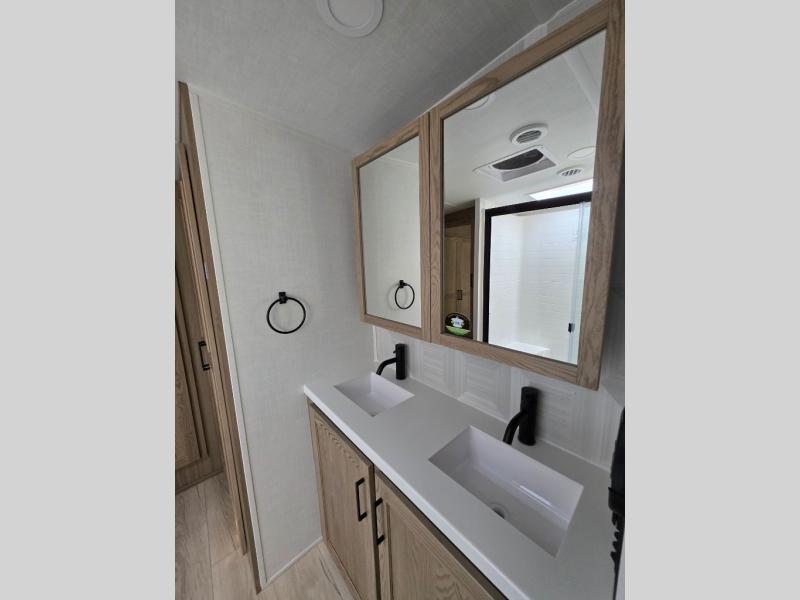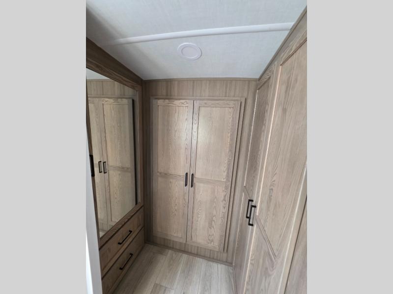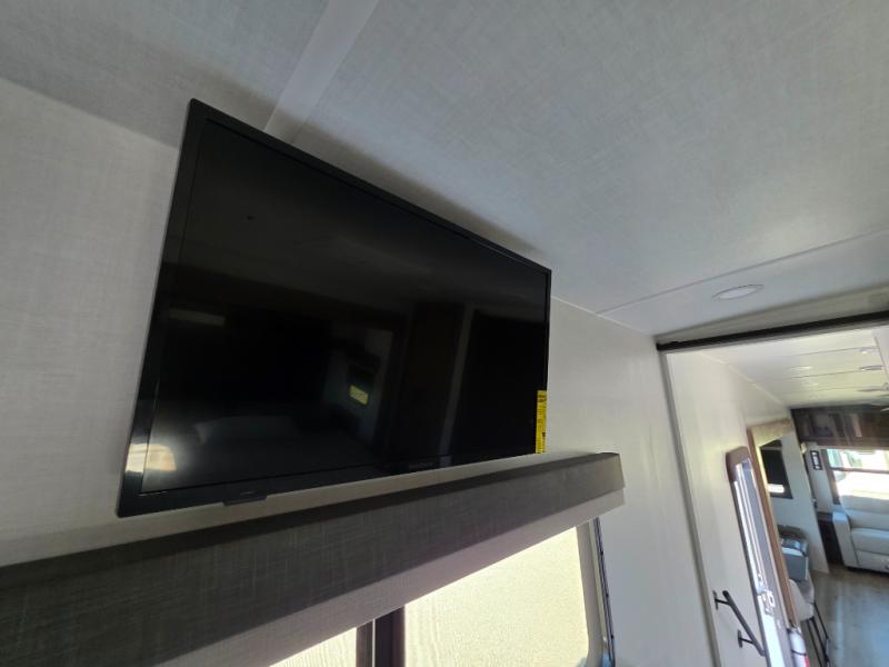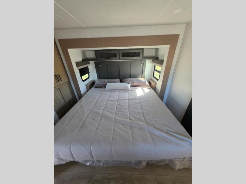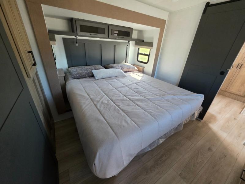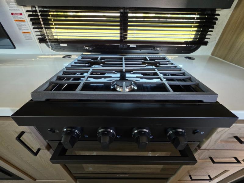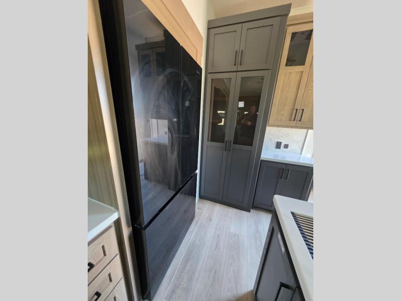 This well-designed layout offers both comfort and functionality. The 72" x 80" king bed provides a spacious and restful sleeping area in the main bedroom. Just steps away, the full front bathroom includes a shower seat for added accessibility, while a convenient half bath near the entrance is perfect for quick use. The kitchen features solid surface countertops and a large island, giving the cook plenty of room to move and work comfortably, along with a rotating table and chairs for dinner and board games. A pull-out desk creates a dedicated space for working away from home, and the 76" hide-a-bed adds extra sleeping space for the whole gang.