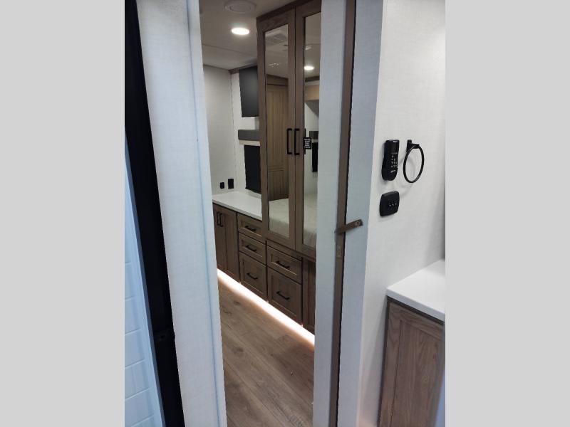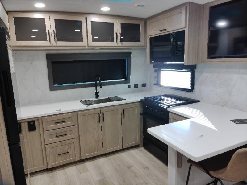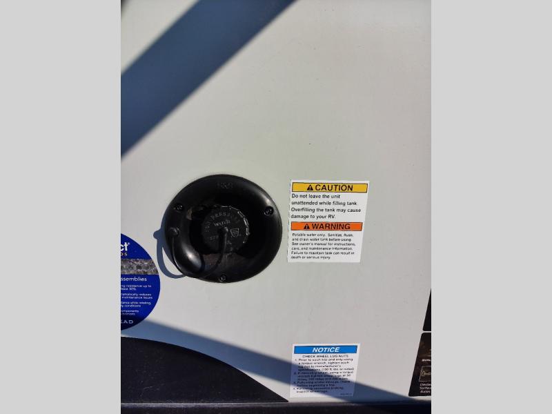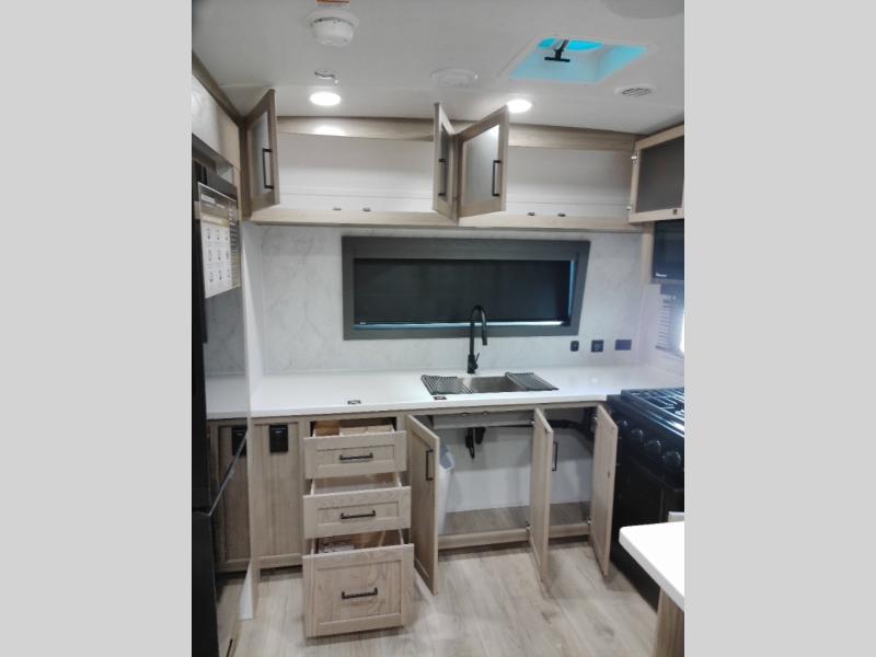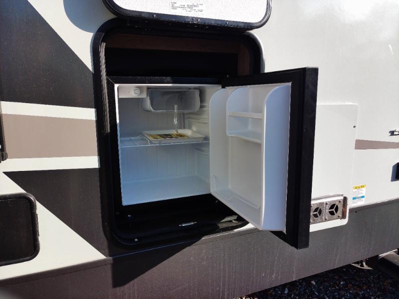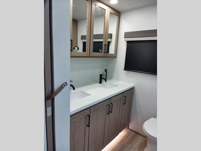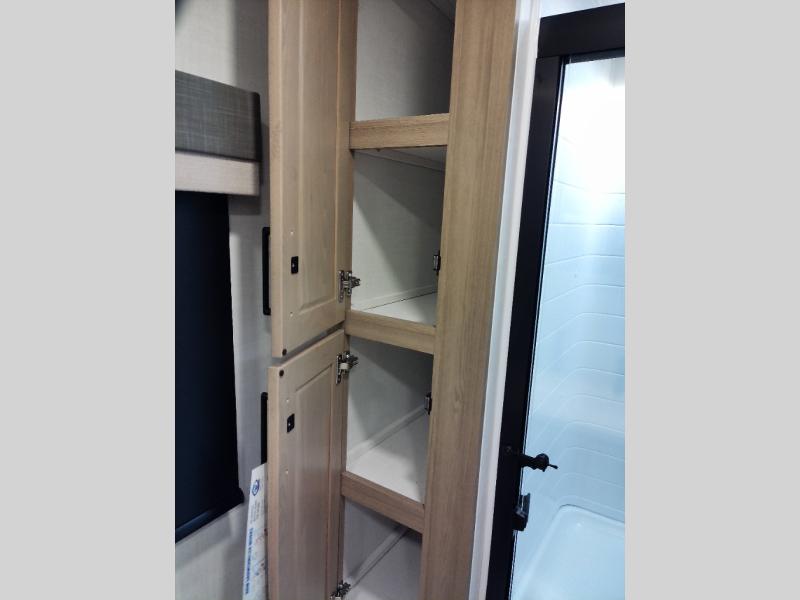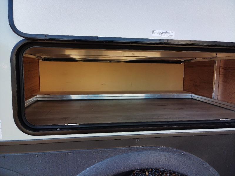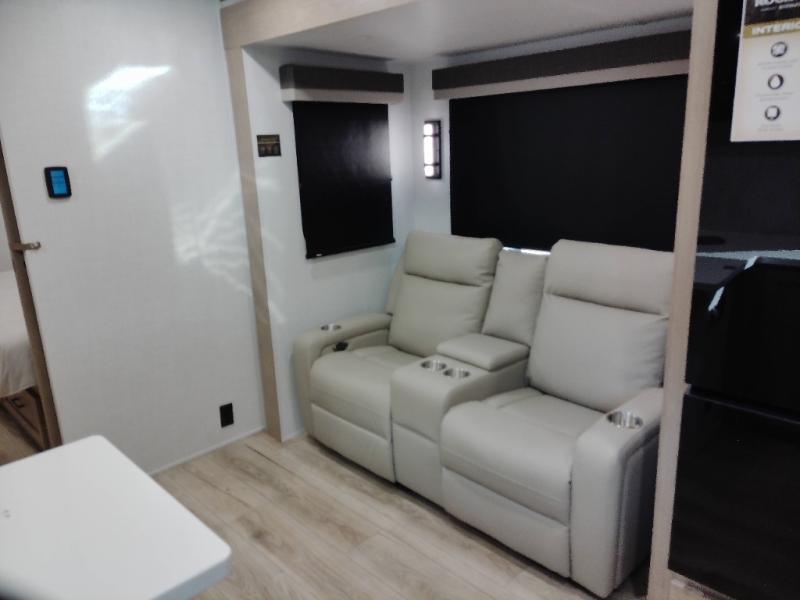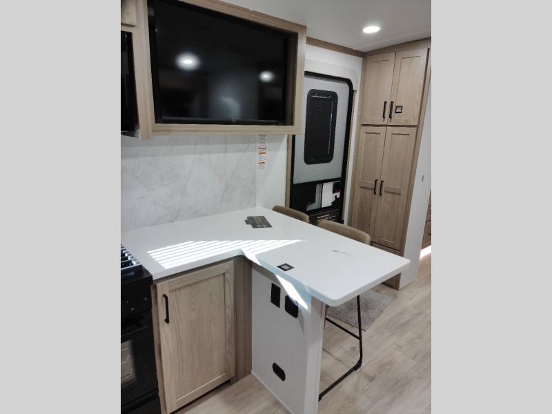 This front kitchen, couple's trailer is ready for adventure when you are! Once you arrive at your destination, prepare a quick lunch with the Griddle Prep, and enjoy the shade provided by the 19' power awning. You can eat outside, or inside at the counter with stools. The 67" theatre seat will make this travel trailer feel more like home, and the double slides provide more space to stretch out. Within the master bedroom you'll find a king bed, a large wardrobe and a dresser, plus an optional TV. And check out the full rear bath with dual bath sinks and a shower with a seat! Now, that's what I call comfort!