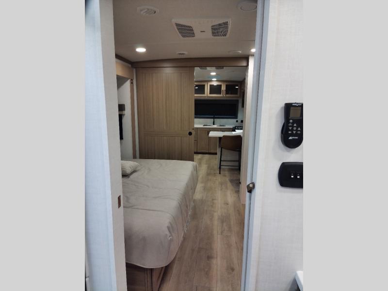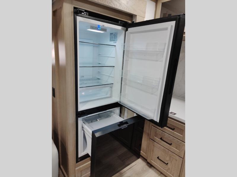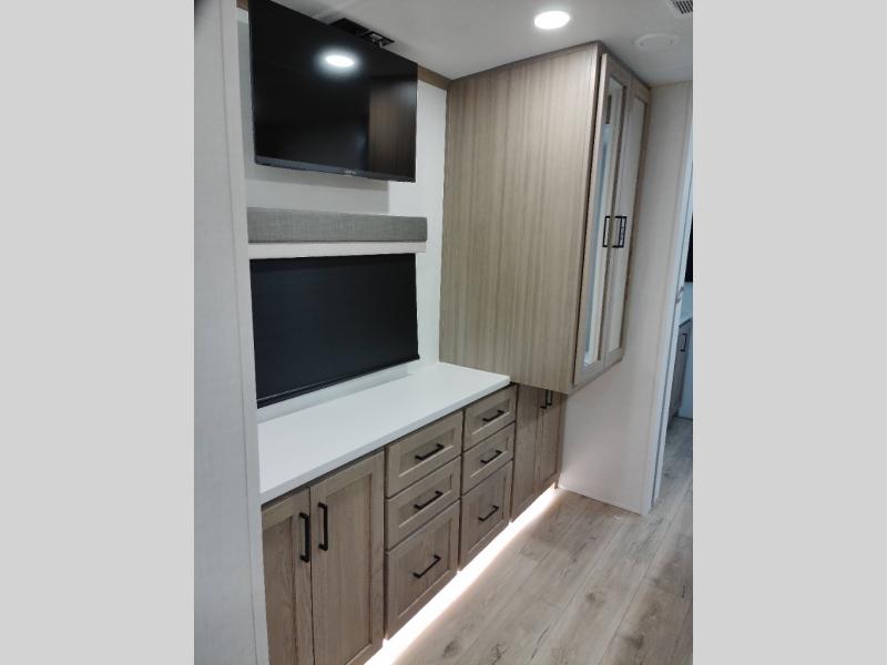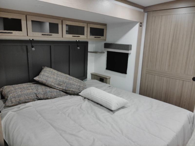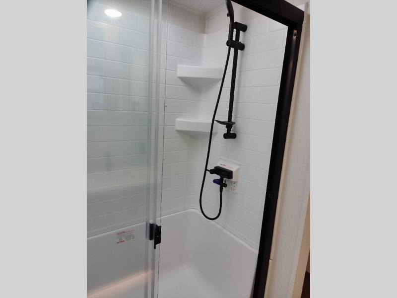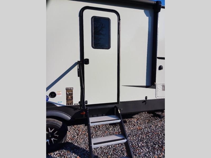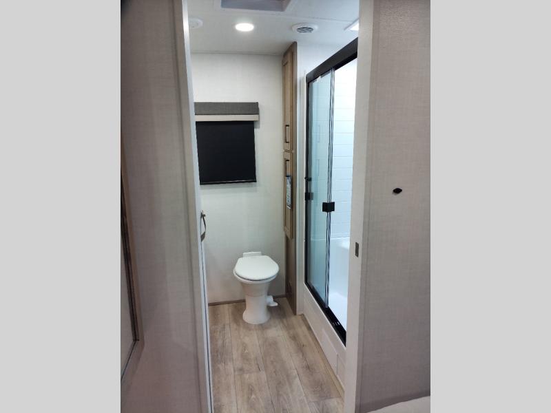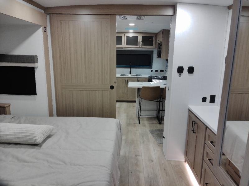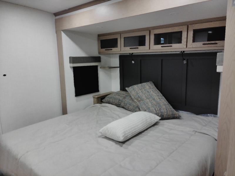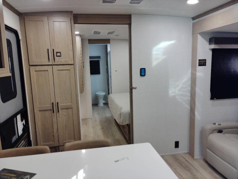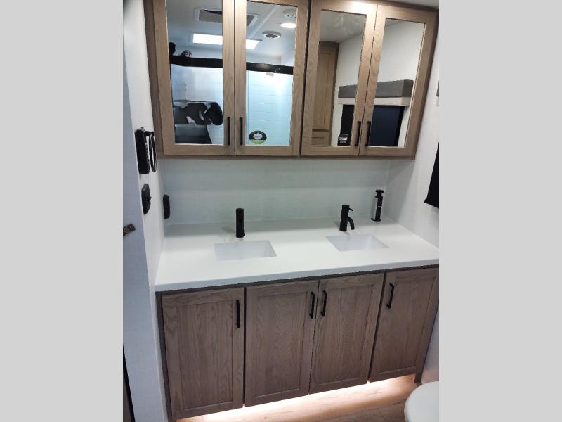 This front kitchen, couple's trailer is ready for adventure when you are! Once you arrive at your destination, prepare a quick lunch with the Griddle Prep, and enjoy the shade provided by the 19' power awning. You can eat outside, or inside at the counter with stools. The 67" theatre seat will make this travel trailer feel more like home, and the double slides provide more space to stretch out. Within the master bedroom you'll find a king bed, a large wardrobe and a dresser, plus an optional TV. And check out the full rear bath with dual bath sinks and a shower with a seat! Now, that's what I call comfort!