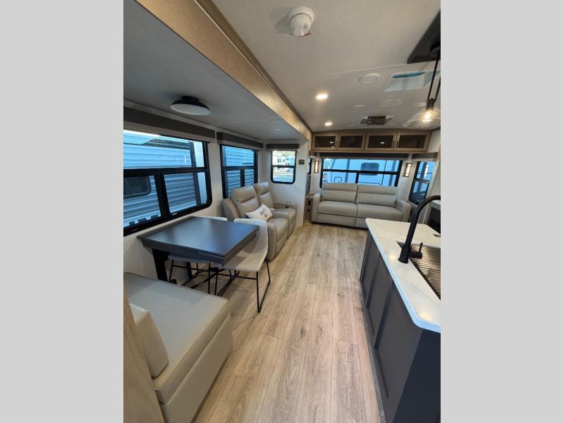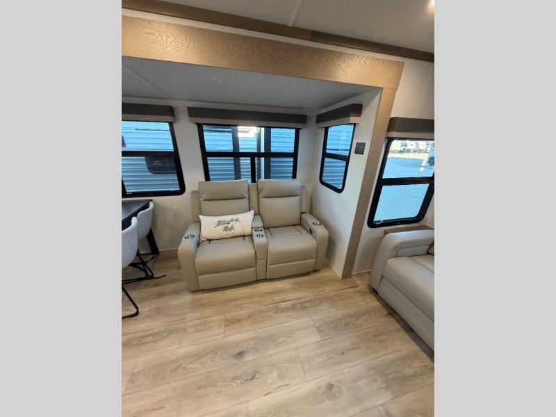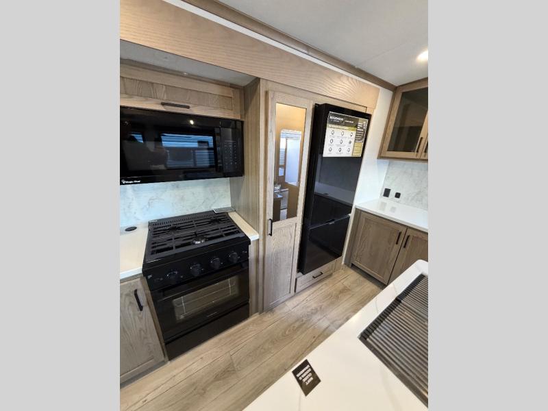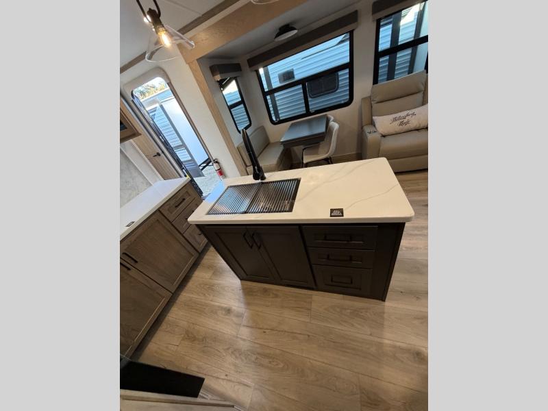 You're going to love the amount of natural light in this model with large windows in the back and the door side. The chef of the group will love the kitchen island, and there is tons of storage space for dishes, food, and knickknacks. The entertainment center with a Smart TV will allow you to watch movies at night, or you may just find yourselves outside under the two power awnings with LED lights. There is also an outside griddle prep here to cook pancakes in the morning. The king bed is sure to bring comfort, and you'll appreciate the large wardrobe to keep your clothes tidy. There is even washer and dryer prep if you choose to go full-time!