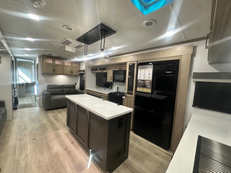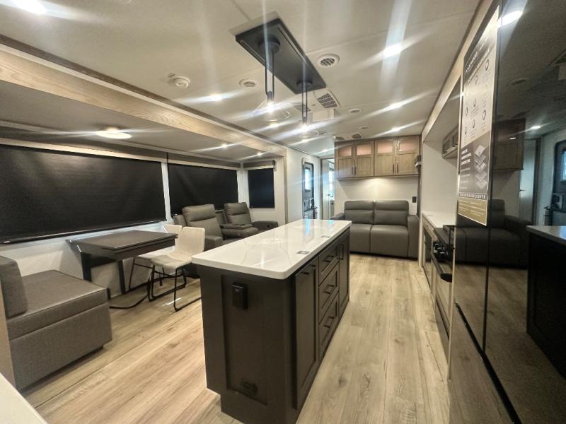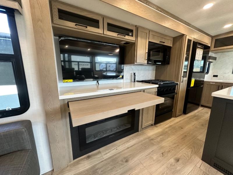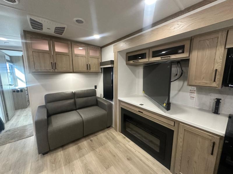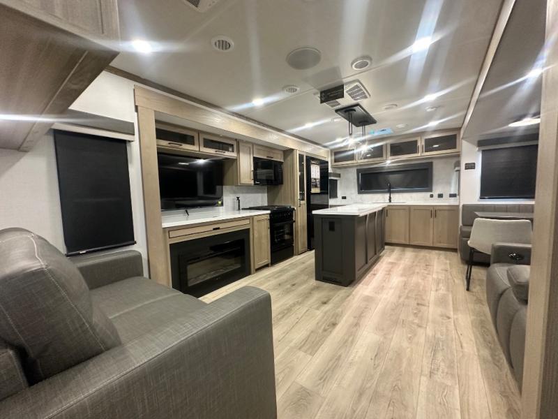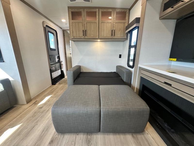 You'll love every minute spent in this front kitchen travel trailer! There is ample counter space to prep meals, plus a spacious kitchen island with a pull-out trash can. After lunch is made, you can dine at the table with chairs and a bench, or take your plate outdoors to eat under the two power awnings. Once you're back inside, you can relax on the theater seat across from the Smart TV and fireplace, and the hide-a-bed sofa here will provide sleeping space for guests. This unit also includes a rear private bedroom with a king bed slide out, a dresser, and a wardrobe with washer and dryer prep if you choose to add those appliances!