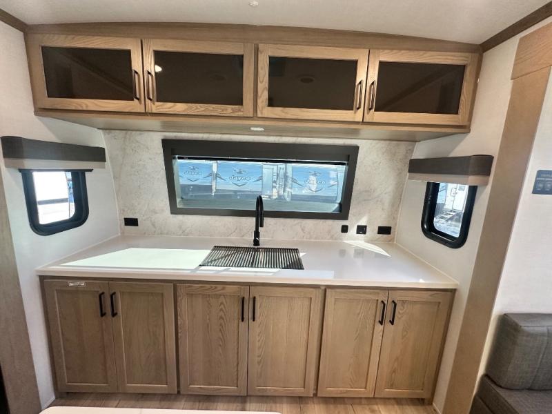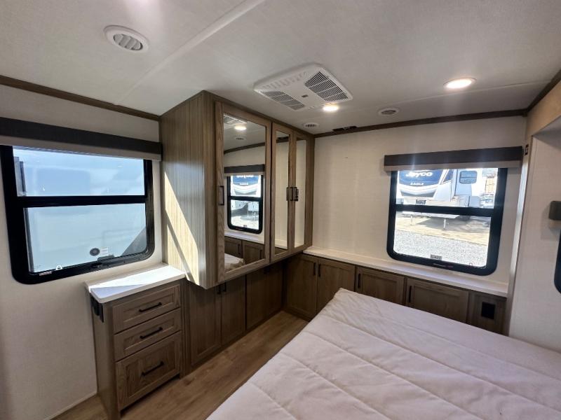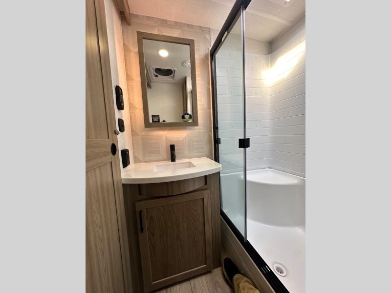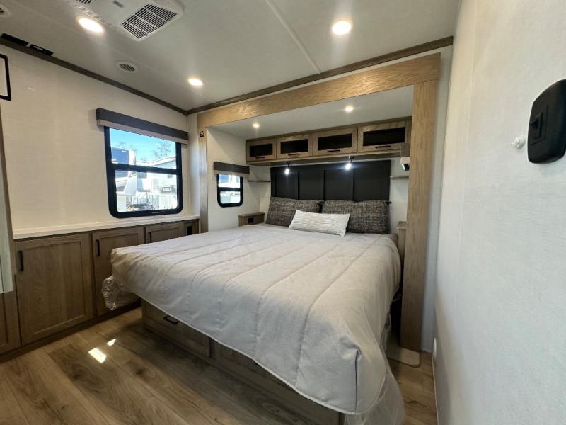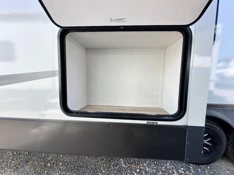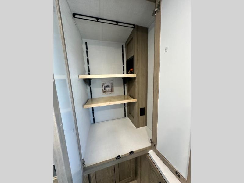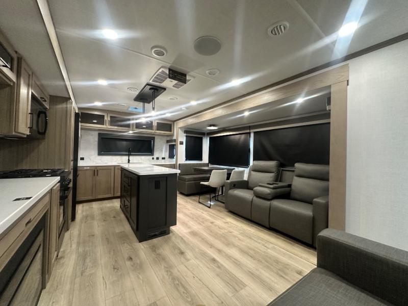 You'll love every minute spent in this front kitchen travel trailer! There is ample counter space to prep meals, plus a spacious kitchen island with a pull-out trash can. After lunch is made, you can dine at the table with chairs and a bench, or take your plate outdoors to eat under the two power awnings. Once you're back inside, you can relax on the theater seat across from the Smart TV and fireplace, and the hide-a-bed sofa here will provide sleeping space for guests. This unit also includes a rear private bedroom with a king bed slide out, a dresser, and a wardrobe with washer and dryer prep if you choose to add those appliances!