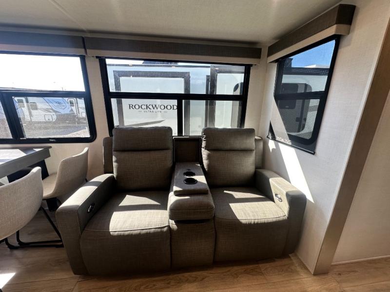 With any Rockwood Signature fifth wheel or travel trailer by Forest River RV, you will enjoy superior construction that includes a fully laminated walkable roof, 6-sided full-aluminum frame, and a painted fiberglass front cap with Clear Coat for added durability. Outside, you'll find a 200W solar panel for off-grid capabilities, slam baggage doors, and Key-Alike lock system for added convenience. Head inside to find soft close roller bearing drawers, roller shades, and residential style gas range. These travel trailer and fifth wheels also feature Goodyear Endurance tires with a tire pressure monitoring system plus Dexter Torflex torsion axles for smooth towing!