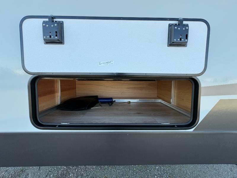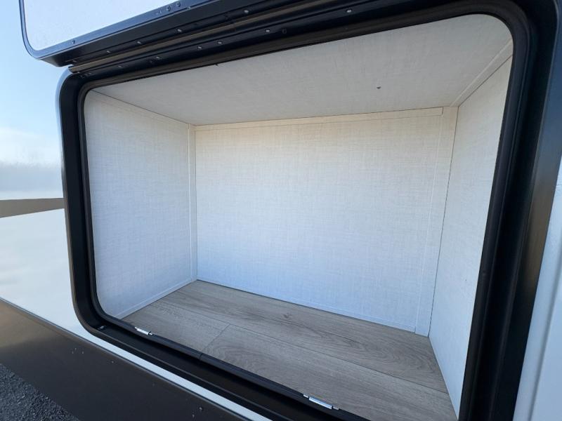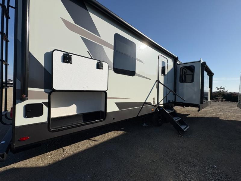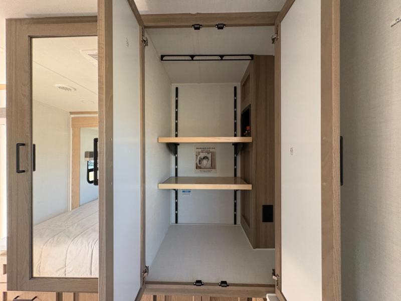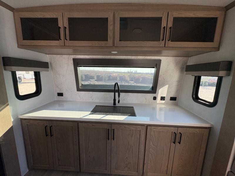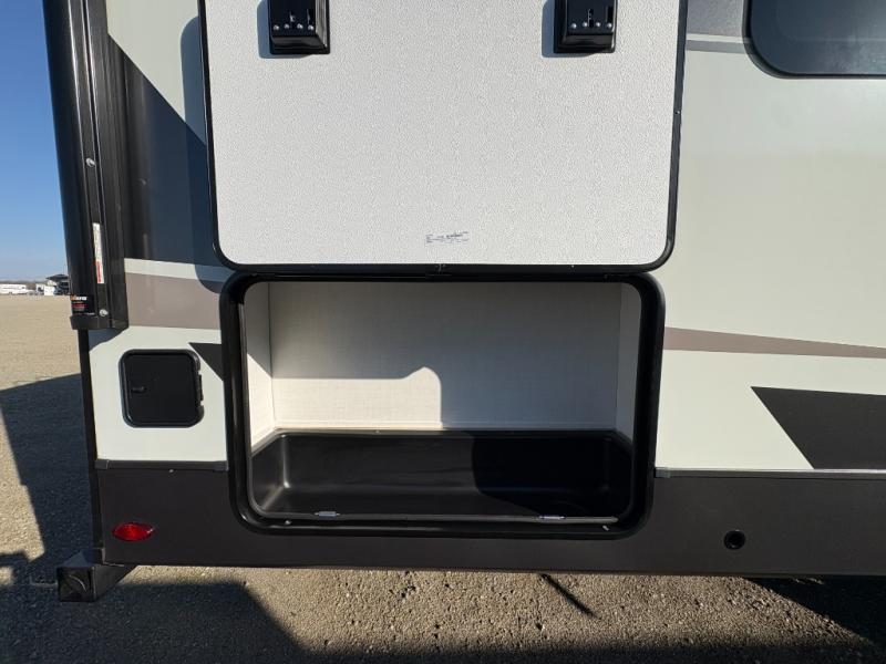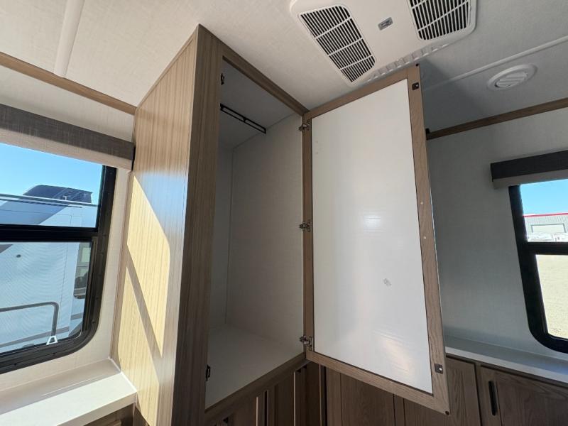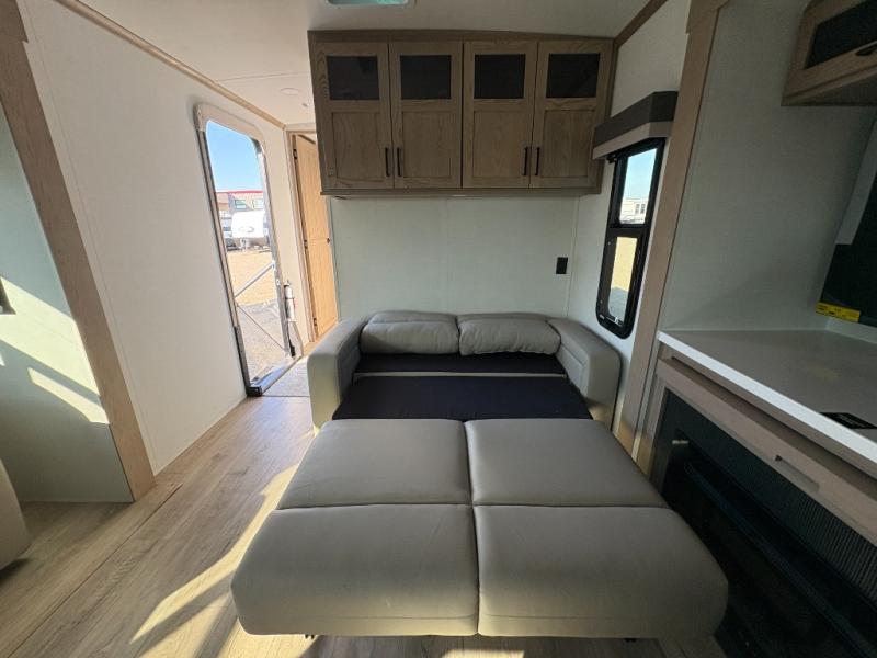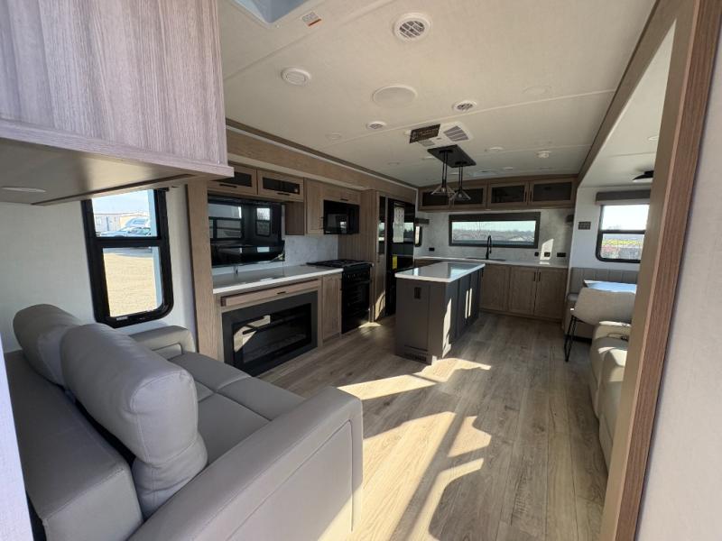 You'll love every minute spent in this front kitchen travel trailer! There is ample counter space to prep meals, plus a spacious kitchen island with a pull-out trash can. After lunch is made, you can dine at the table with chairs and a bench, or take your plate outdoors to eat under the two power awnings. Once you're back inside, you can relax on the theater seat across from the Smart TV and fireplace, and the hide-a-bed sofa here will provide sleeping space for guests. This unit also includes a rear private bedroom with a king bed slide out, a dresser, and a wardrobe with washer and dryer prep if you choose to add those appliances!