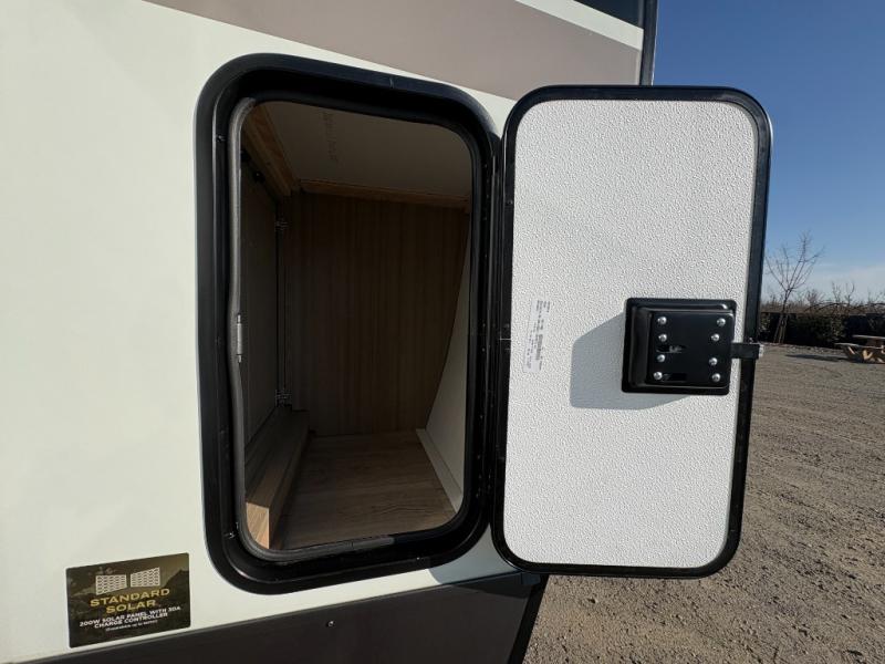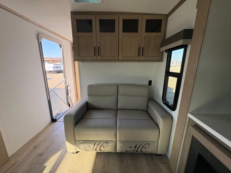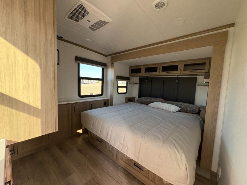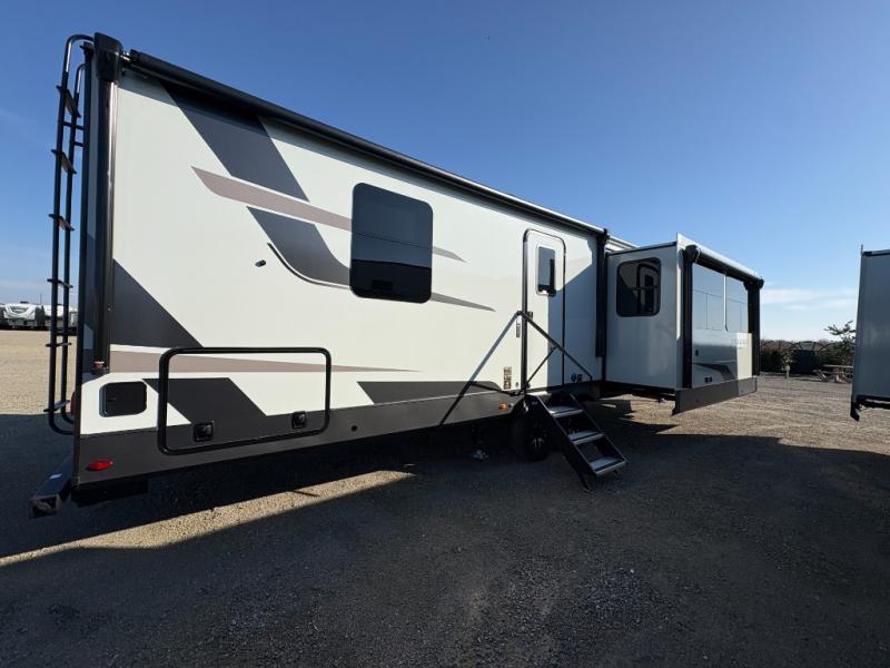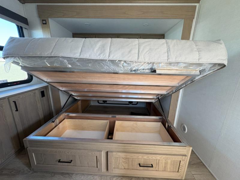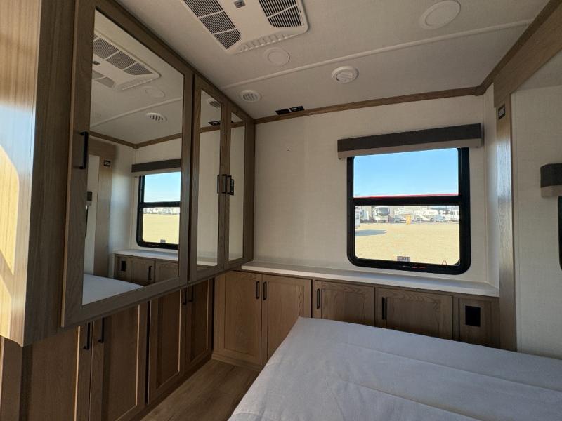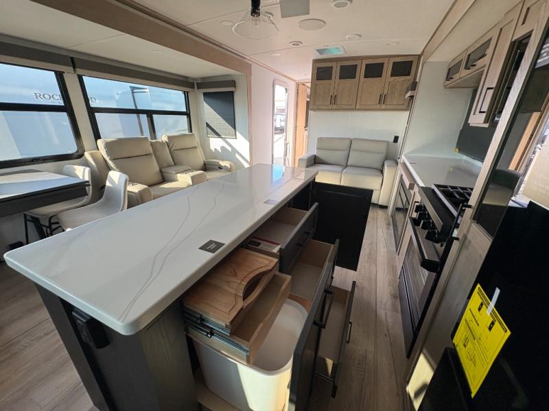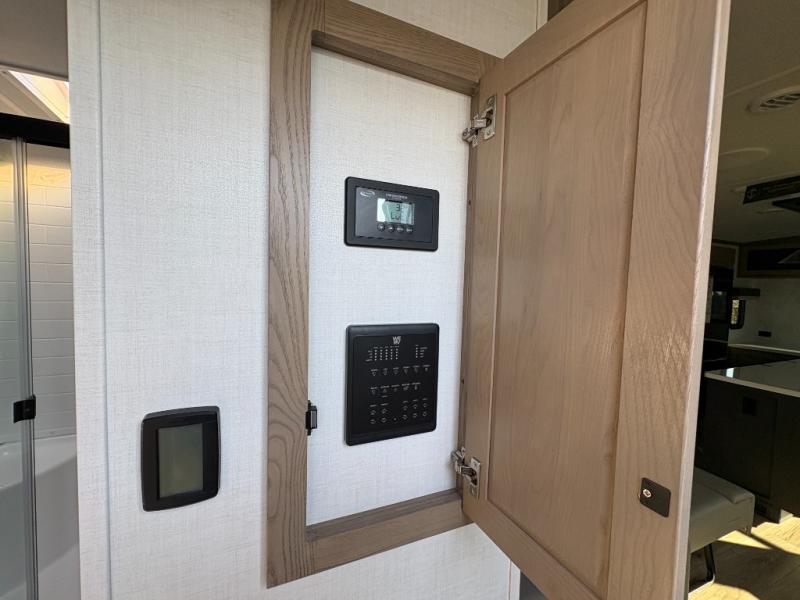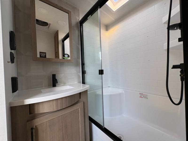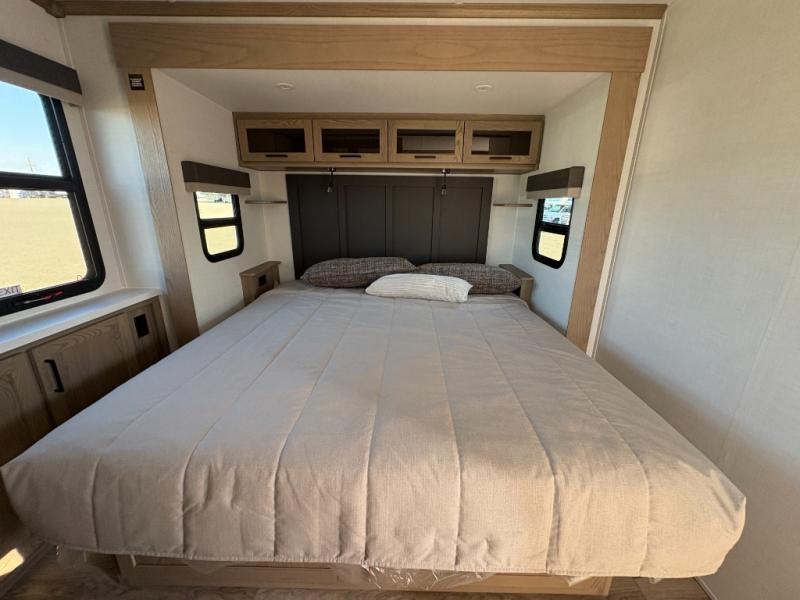You'll love every minute spent in this front kitchen travel trailer! There is ample counter space to prep meals, plus a spacious kitchen island with a pull-out trash can. After lunch is made, you can dine at the table with chairs and a bench, or take your plate outdoors to eat under the two power awnings. Once you're back inside, you can relax on the theater seat across from the Smart TV and fireplace, and the hide-a-bed sofa here will provide sleeping space for guests. This unit also includes a rear private bedroom with a king bed slide out, a dresser, and a wardrobe with washer and dryer prep if you choose to add those appliances!