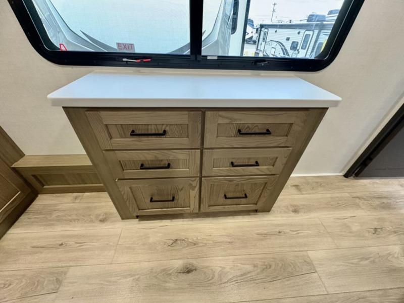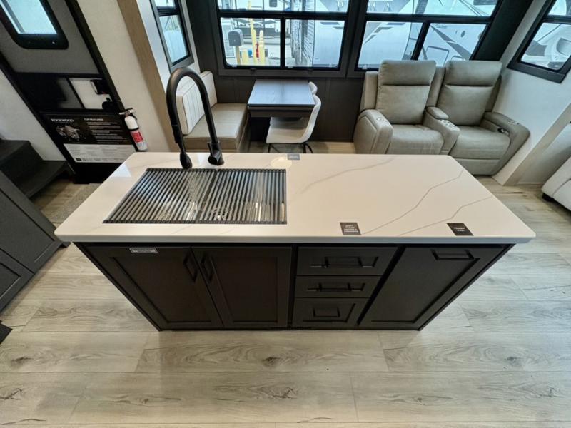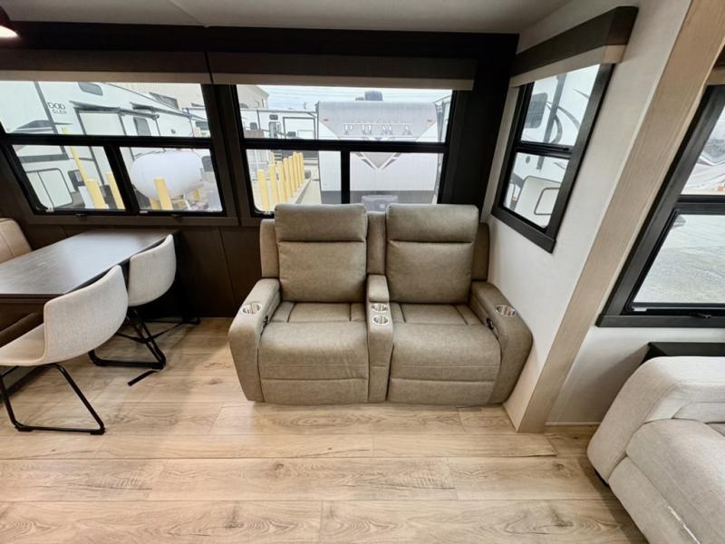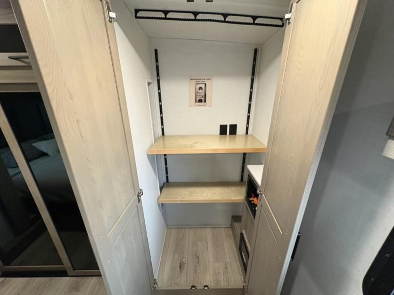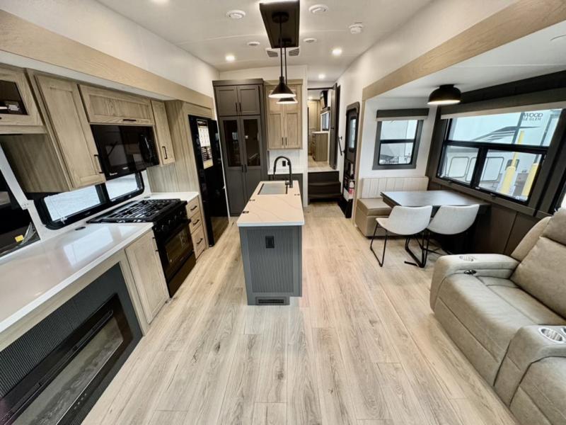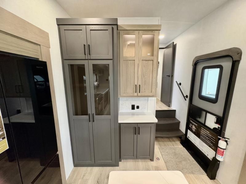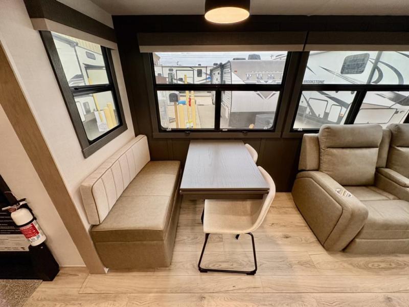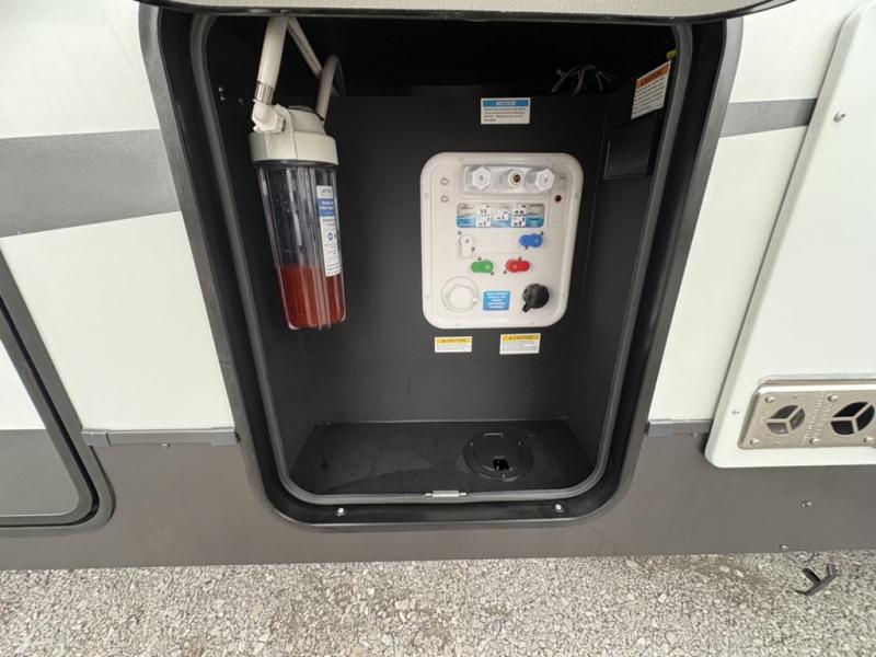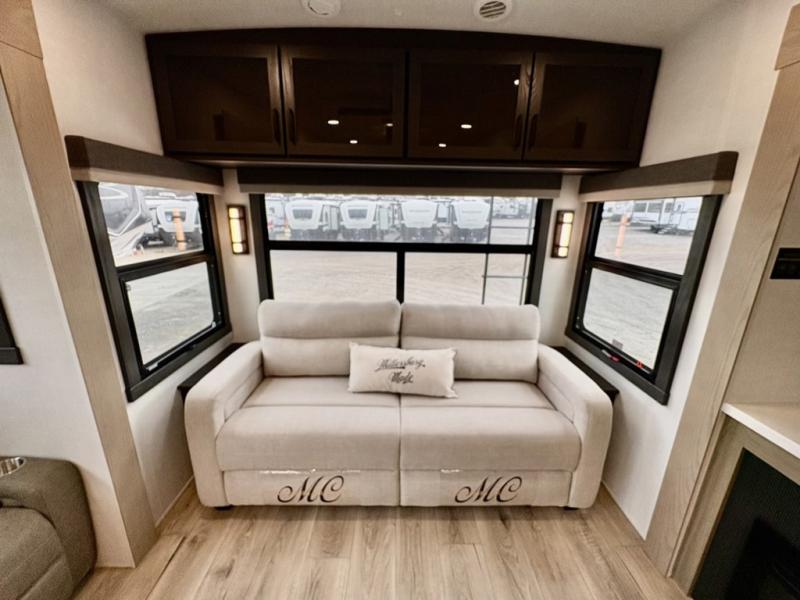You can enjoy views from inside or outside each day once this RV is set up at the campgrounds! The large windows in the furniture slide and the windows throughout allow you to take in the scenery, and the three slide outs give you a spacious main living and kitchen area as well as front bedroom. You will find lots of seating for guests on the hide-a-bed sofa in the rear, on the theater seats and the table, chairs and bench in the slide. The cook will love the 12V refrigerator and large pantry to store food, and everyone can enjoy the Smart TV and fireplace when visiting and relaxing. The front bedroom offers a king bed slide, a front wardrobe, plus washer and dryer prep if you choose to add those appliances.