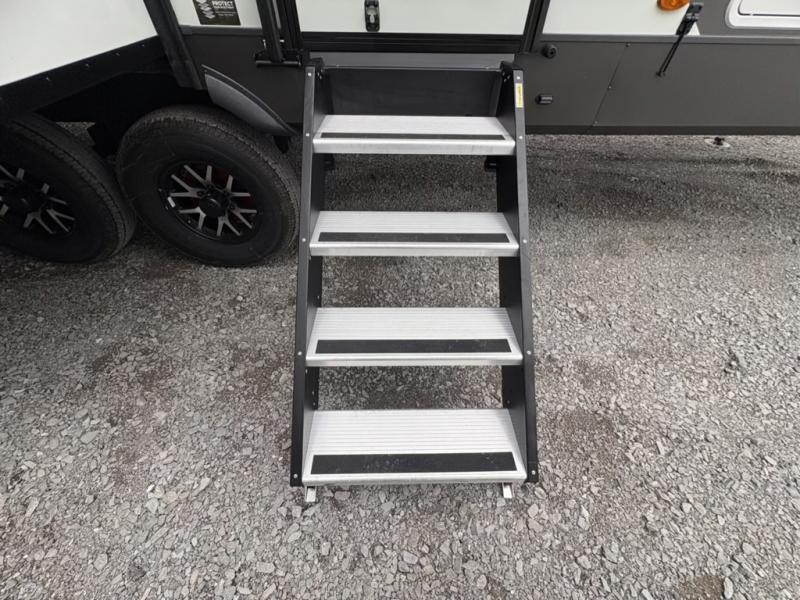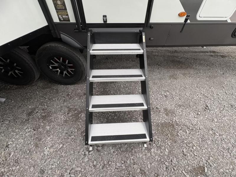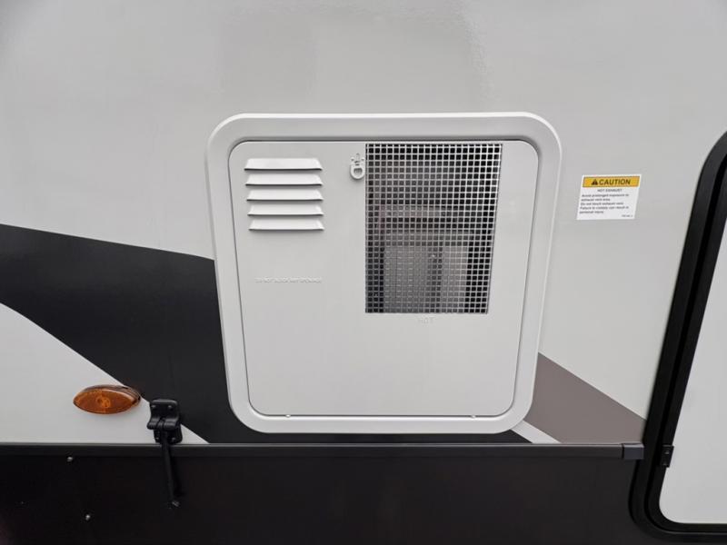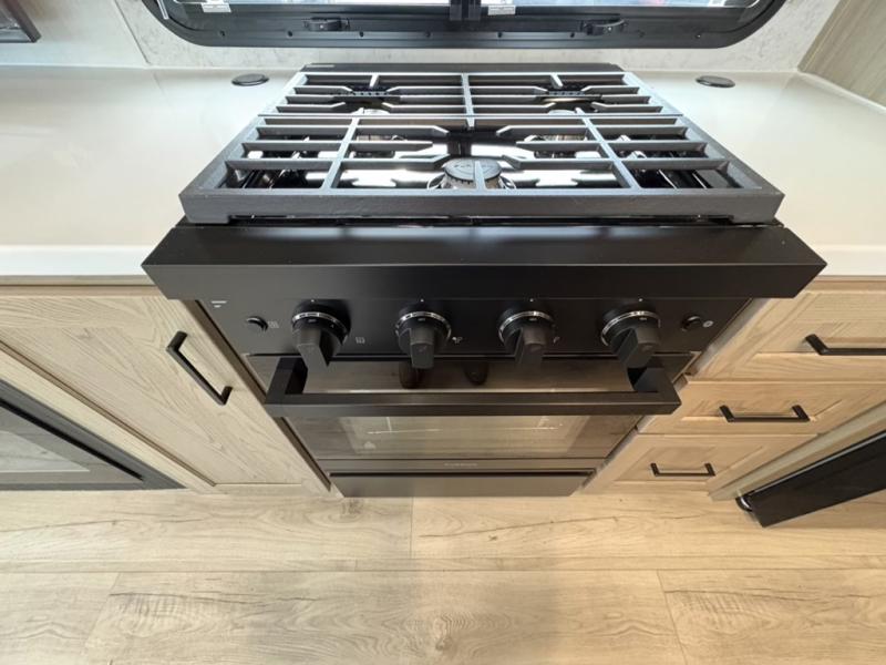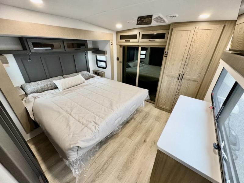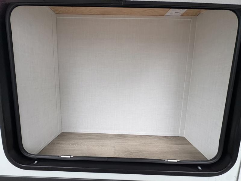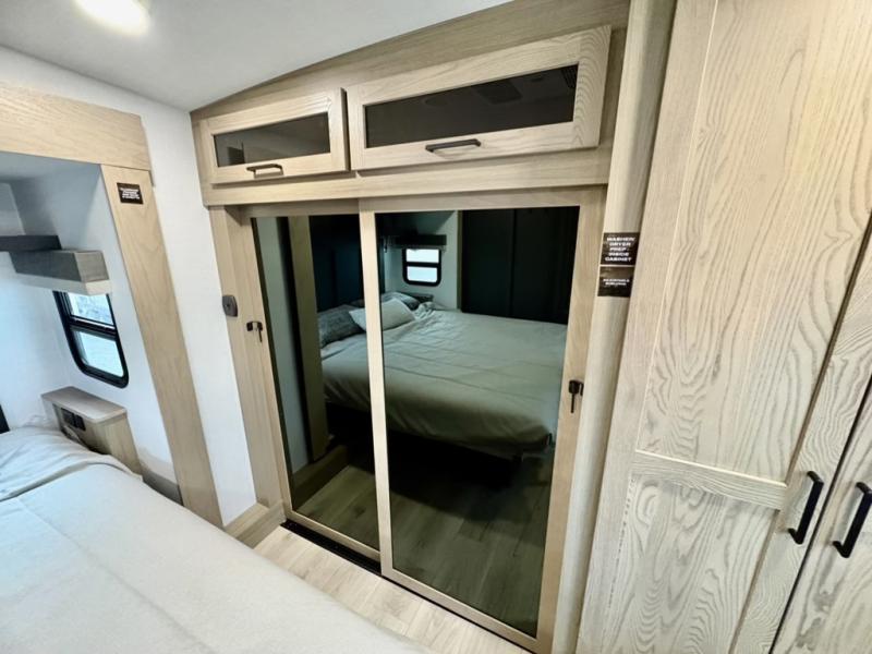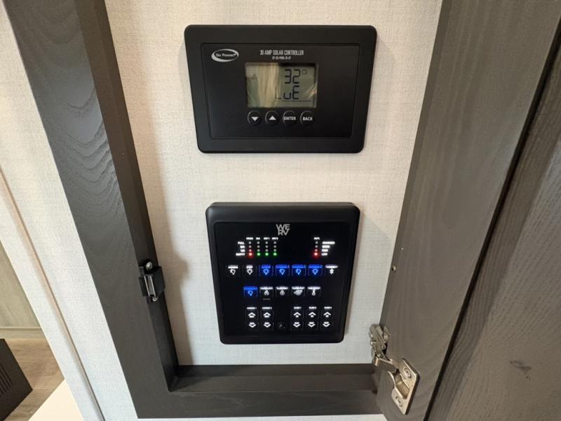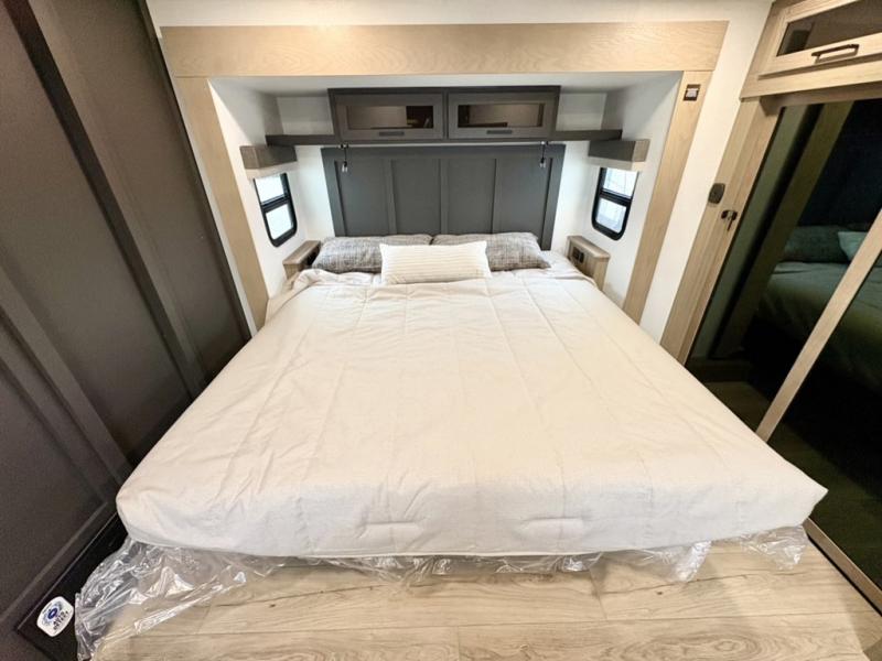 You can enjoy views from inside or outside each day once this RV is set up at the campgrounds! The large windows in the furniture slide and the windows throughout allow you to take in the scenery, and the three slide outs give you a spacious main living and kitchen area as well as front bedroom. You will find lots of seating for guests on the hide-a-bed sofa in the rear, on the theater seats and the table, chairs and bench in the slide. The cook will love the 12V refrigerator and large pantry to store food, and everyone can enjoy the Smart TV and fireplace when visiting and relaxing. The front bedroom offers a king bed slide, a front wardrobe, plus washer and dryer prep if you choose to add those appliances.