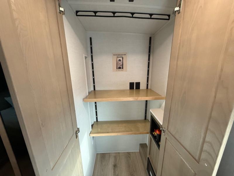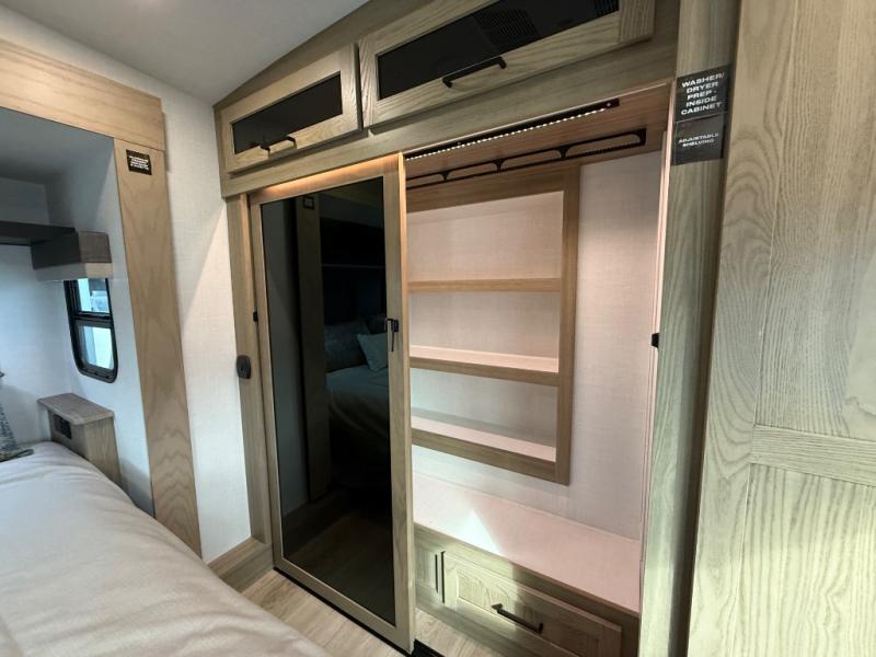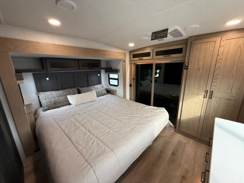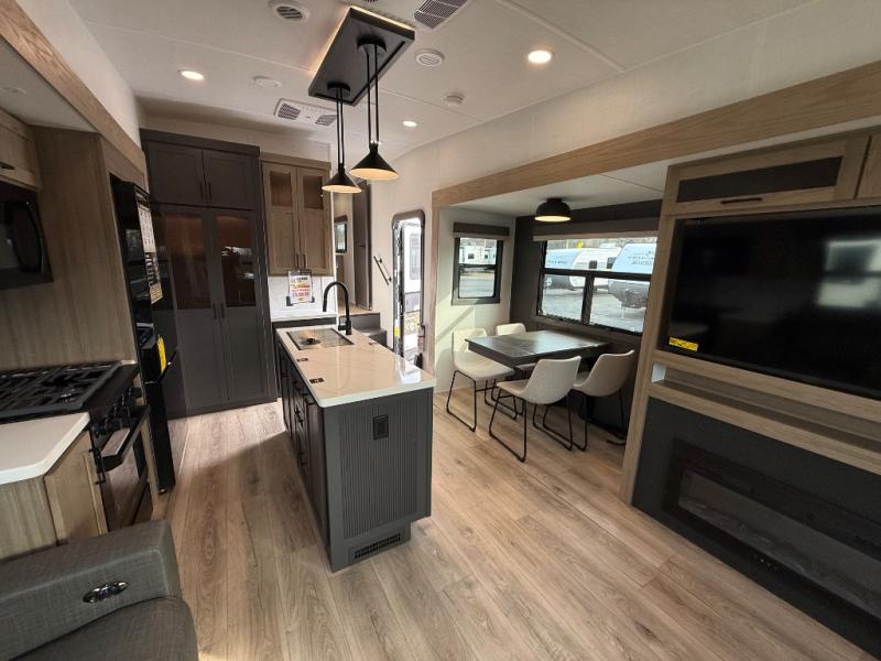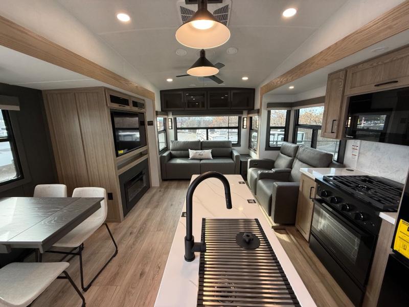 You'll be camping in style each time you take this fifth wheel out to the campground! The dual opposing slides in the main living area create an open floorplan, and the kitchen island here will provide more counter space to prep meals. You will love the theater seat directly across from the entertainment center and fireplace, and additional seating can be found on the hide-a-bed sofa or the dinette with table and chairs. The full bath includes a shower with a seat, plus a Maxxair ventilation fan to keep everything fresh. The front private bedroom may feel more like a resort with its king bed slide out, large wardrobe, plus a dresser to keep your clothes tidy. And did we mention this fifth wheel has two power awnings for maximum protection against the elements, and tons of exterior storage for all your gear!?
