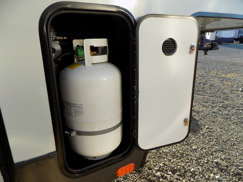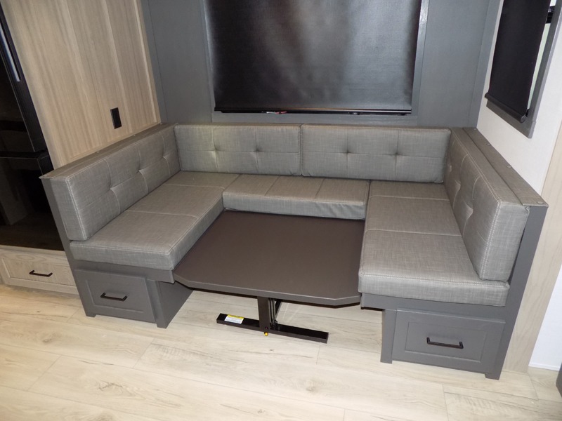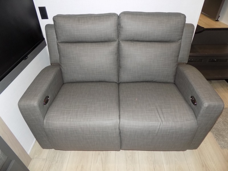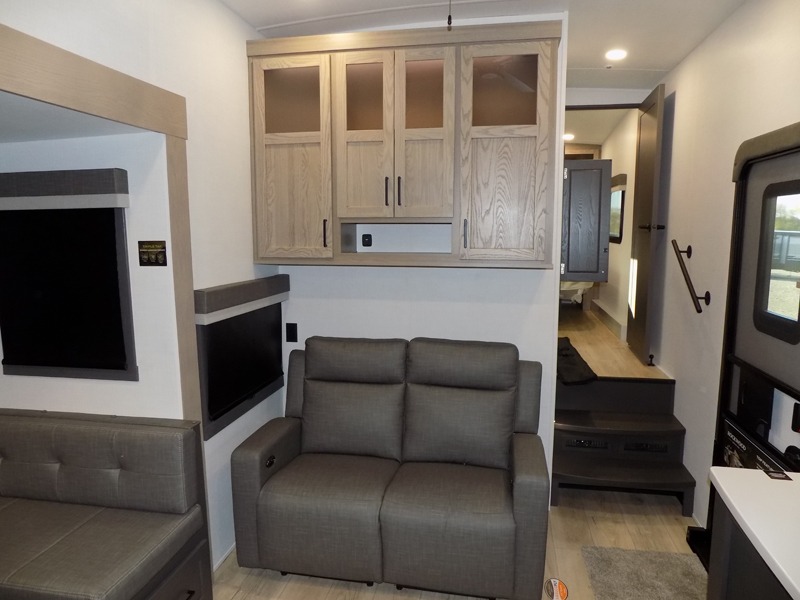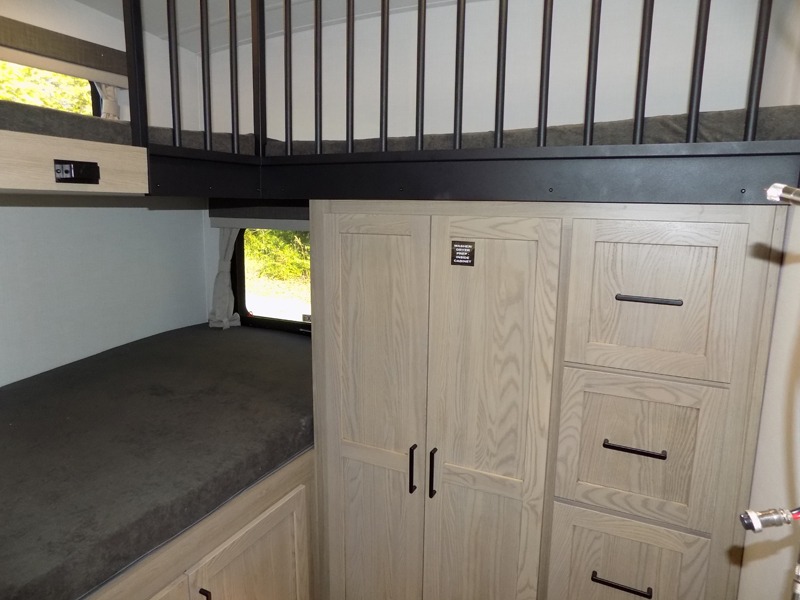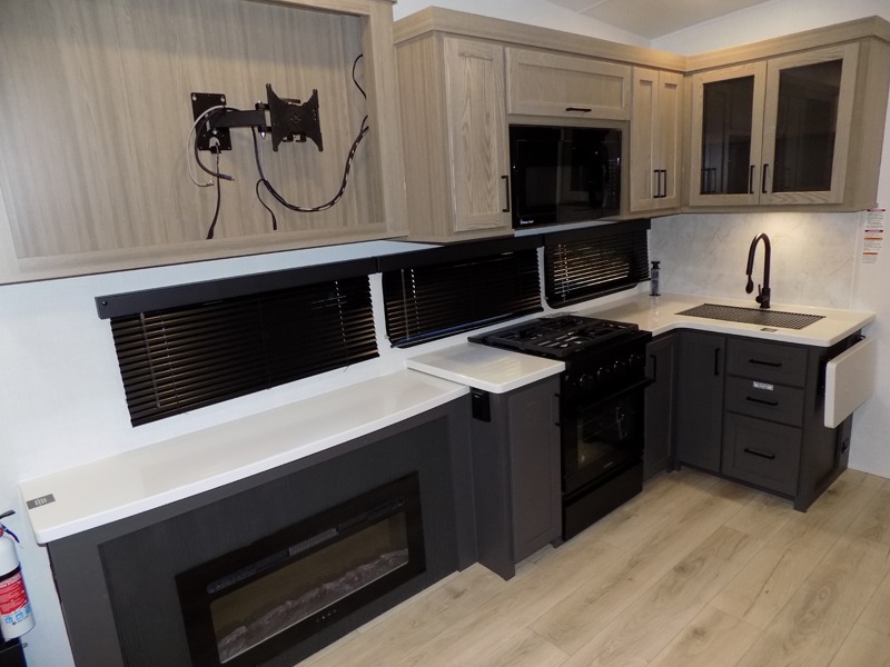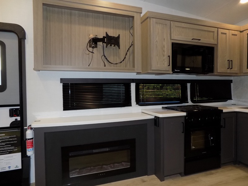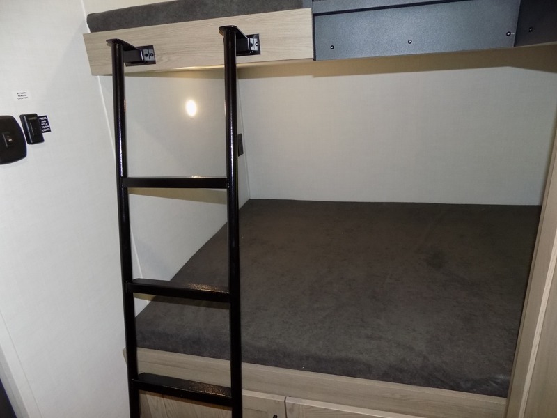 Looking to travel with your family and friends and need lots of space for everyone? This fifth wheel offers a front private bedroom with a queen bed, a spacious wardrobe, and a TV option for shows in bed. On the opposite side of the unit there is a private bunkhouse with triple bunks, plus washer and dryer prep. The main living and kitchen area includes a slide out which offers a king U-shaped dinette to dine at, play games with friends, and provides sleeping if needed, plus a 12V refrigerator and a pantry. There is also a 55" theater seat here for more comfort. The cook will have full amenities indoors plus an outside kitchen when the weather is nice. There are also two power awnings, Solid Entry steps, a rear 2" towing hitch, and more exterior conveniences!
