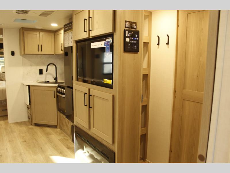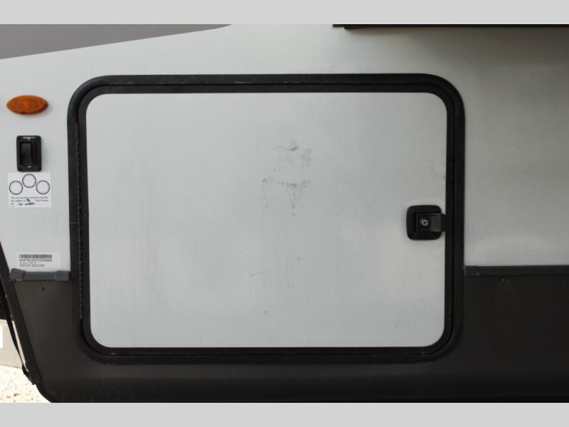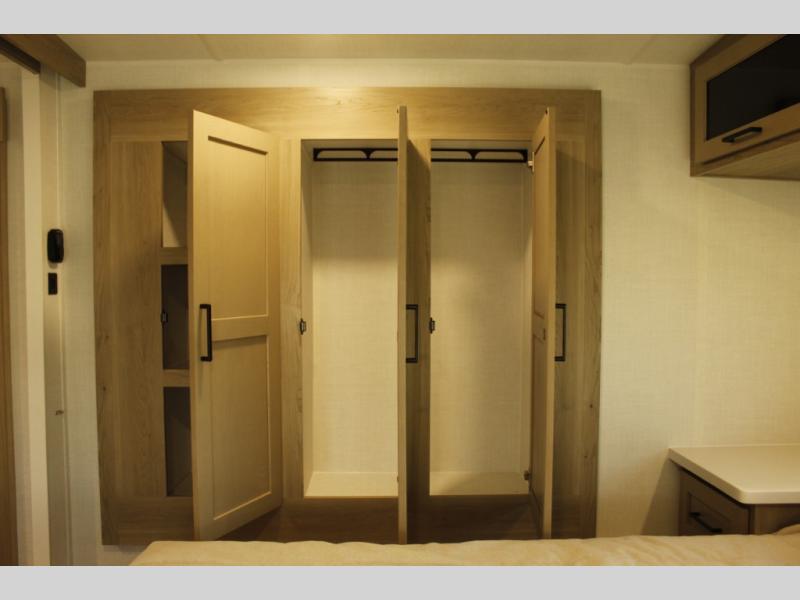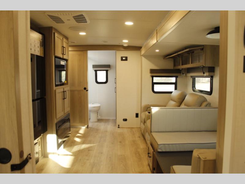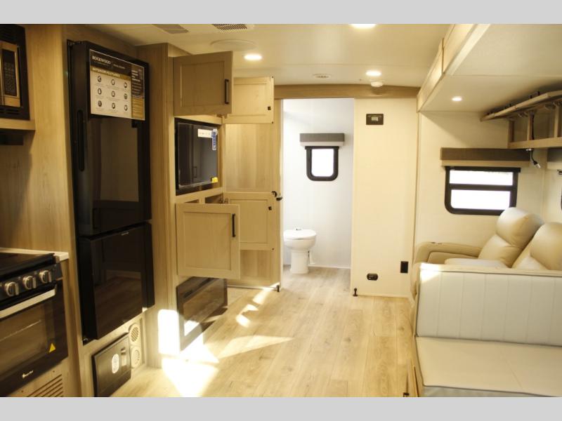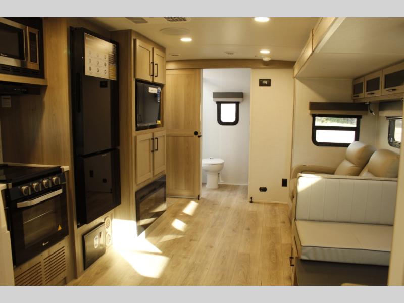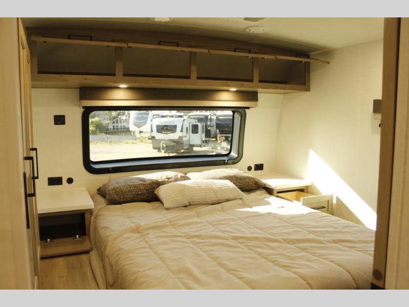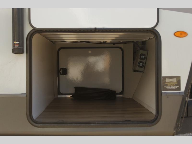 This trailer is the perfect couple's retreat with its private bedroom up front which includes a queen bed, a slide out wardrobe, and a TV option. The spacious rear full bathroom provides a shower and linen storage, and a space savings sliding door. The cook will have full amenities with ample counter space, a walk-in pantry for food storage, and a three burner range to cook meals on. If the weather is nice outside, you can turn on the outside speakers to enjoy music, and there is a 21' awning to relax under. Or you can stay inside to enjoy the fireplace and Smart TV! You will also appreciate the pass thru storage with an optional steel sliding tray to easily access gear!