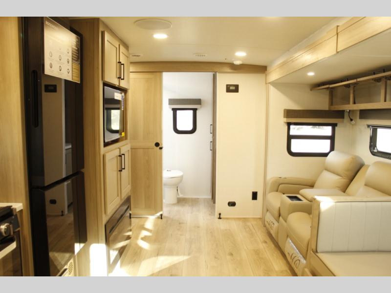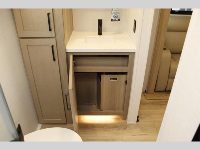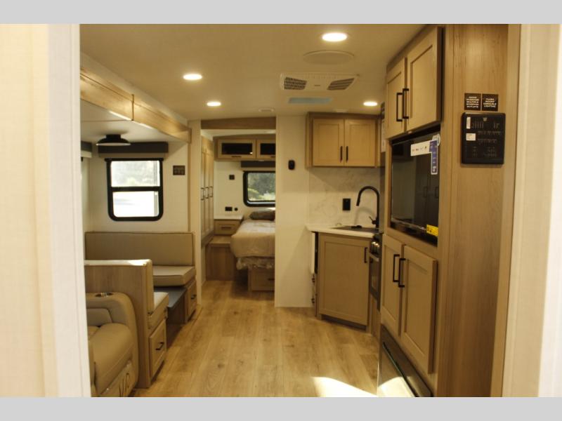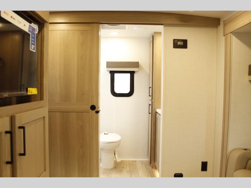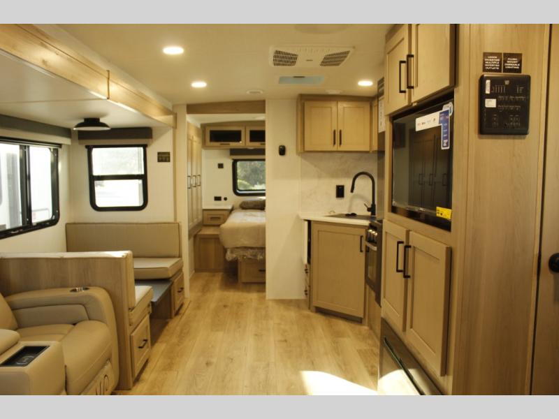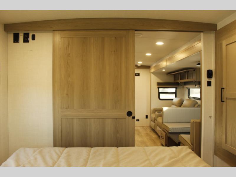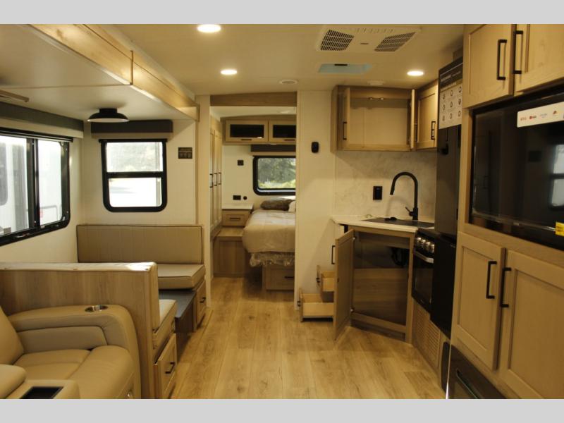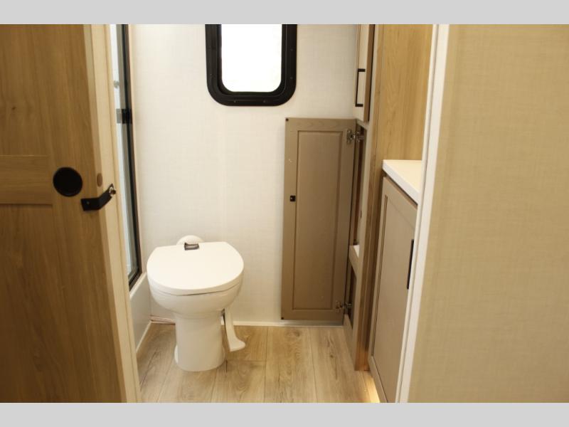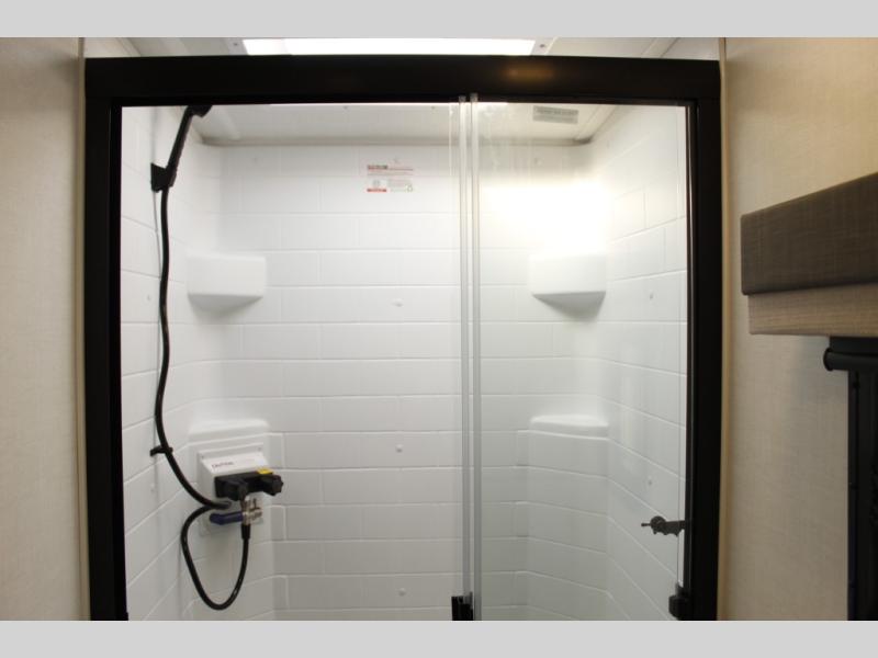 This trailer is the perfect couple's retreat with its private bedroom up front which includes a queen bed, a slide out wardrobe, and a TV option. The spacious rear full bathroom provides a shower and linen storage, and a space savings sliding door. The cook will have full amenities with ample counter space, a walk-in pantry for food storage, and a three burner range to cook meals on. If the weather is nice outside, you can turn on the outside speakers to enjoy music, and there is a 21' awning to relax under. Or you can stay inside to enjoy the fireplace and Smart TV! You will also appreciate the pass thru storage with an optional steel sliding tray to easily access gear!