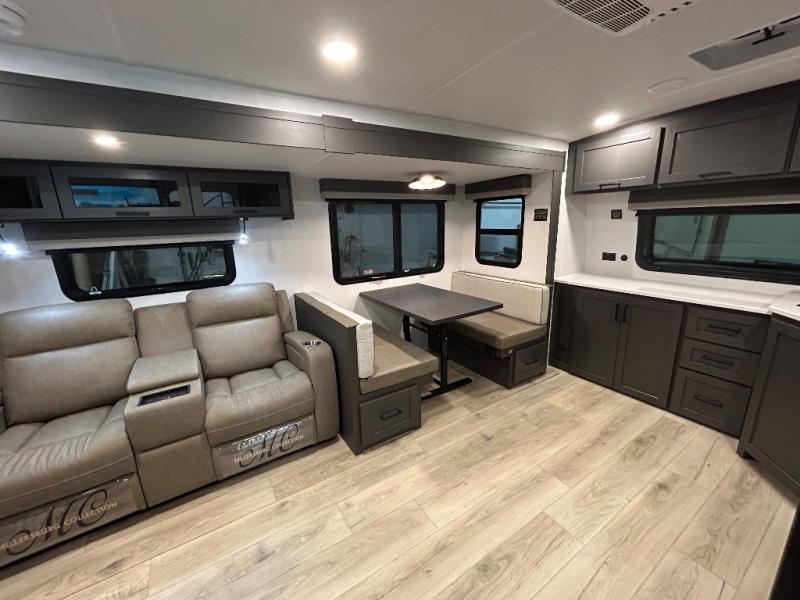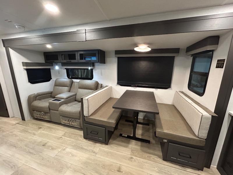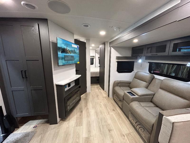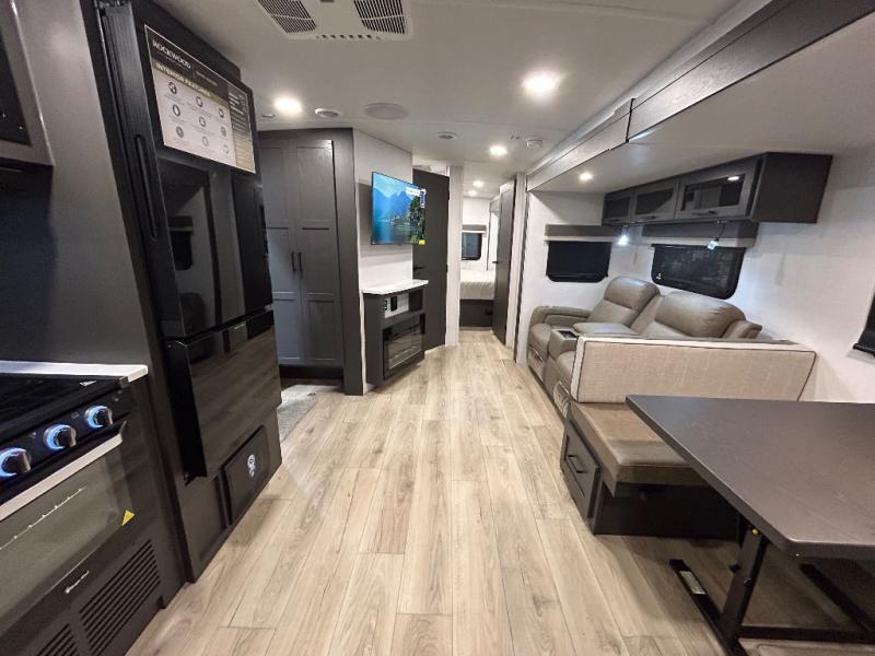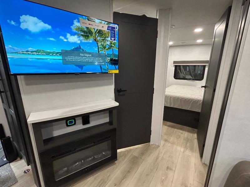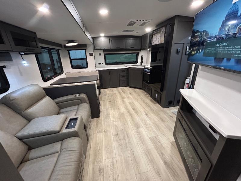 When you are outside this trailer you can enjoy the protection from the 21' power awning, you will also find exterior storage for your extra gear, and a ladder at the rear. You get to choose which entrance to step up into, be it the spacious rear bedroom with a queen bed slide and a wardrobe, or the main entry into the kitchen and living area. The furniture slide includes a booth dinette to eat your meals at, and theater seating to watch the Smart TV with a fireplace below. And the cook will love the front kitchen with extra counter space, a three-burner range, plus a 12V refrigerator and pantry for food storage!